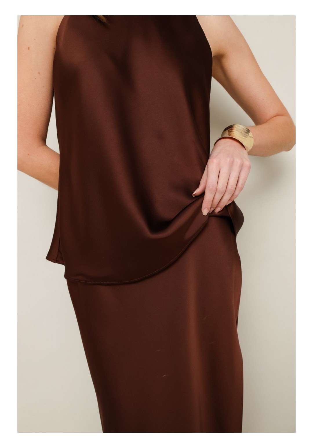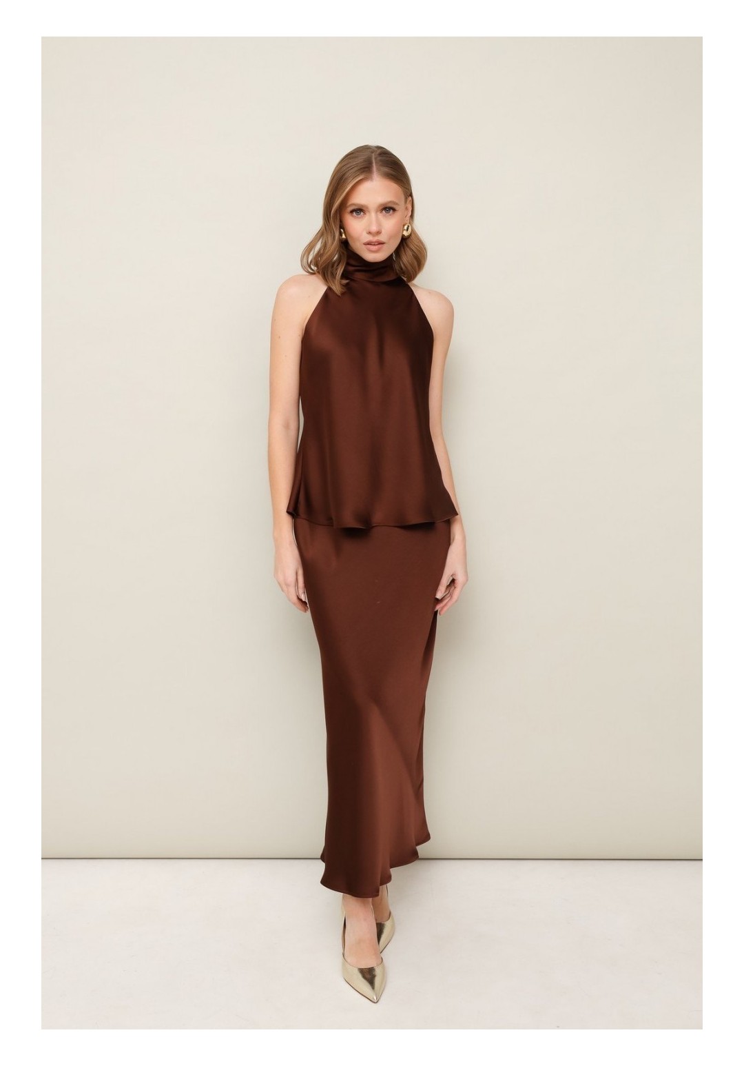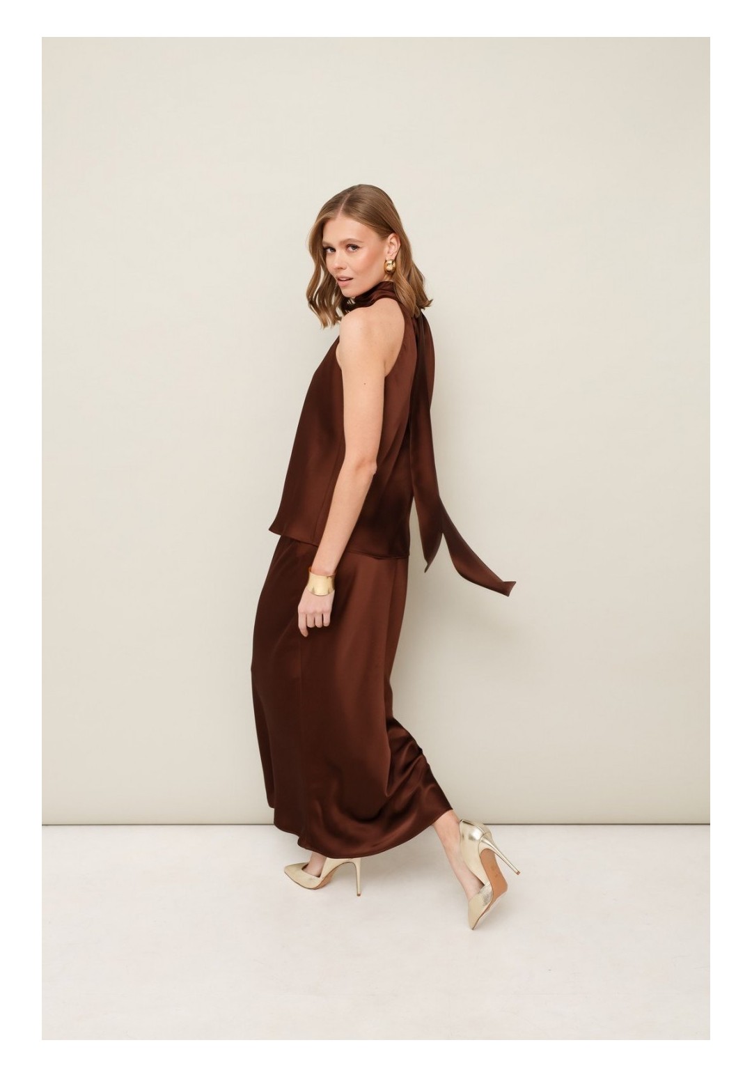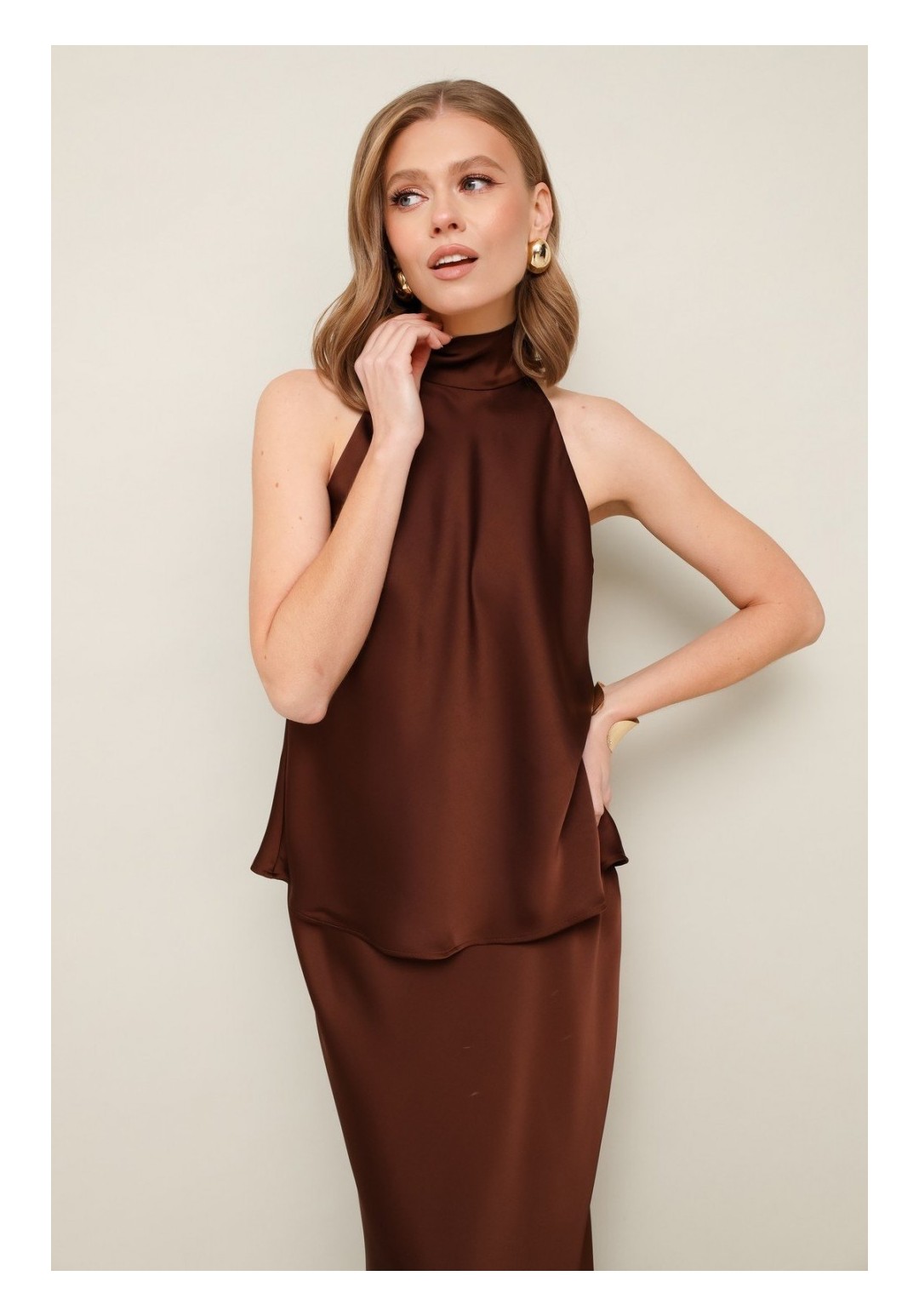 Элегантный 2-предметный костюм, состоящий из блузки и юбки, выполненный из струящейся ткани с благородным матовым блеском. Блузка прямого силуэта с американской проймой, горловина со стойкой, которая переходит в завязывающийся бант. Юбка с кроем по косой в длине миди, пояс на обтачке, застежка в боковом шве на потайную тесьму молнию.