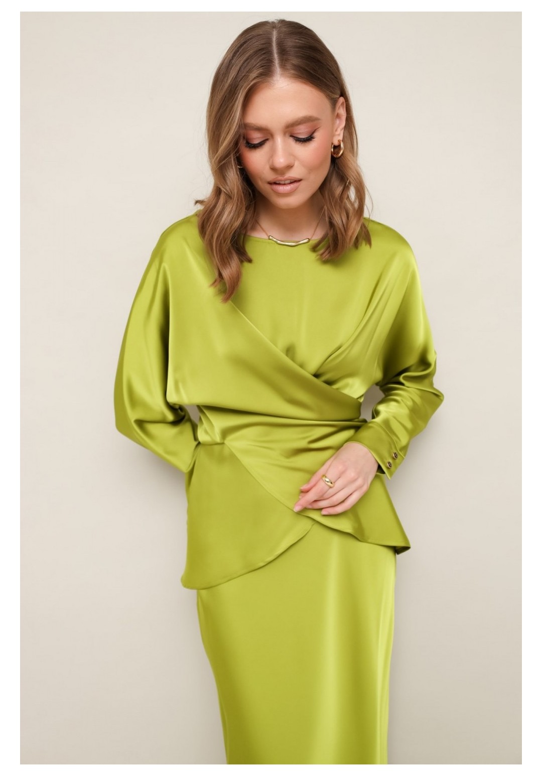 Элегантный 2-предментный комплект, состоящий из блузки и юбки, выполненный из струящейся ткани с деликатным блеском. Блузка прямого кроя с акцентом на талии. Вырез горловины-лодочка. Рукава цельновыкроеные с манжетами с застежкой на петли и пуговицы. По переду обработан разрез с завязками для фиксации половинок переда на спинке. Низ переда фигурный, спинка со средним швом и прямым низом, в боковых швах высокие разрезы. Юбка с кроем по косой в длине миди, пояс на обтачке, застежка в боковом шве на потайную тесьму молнию.