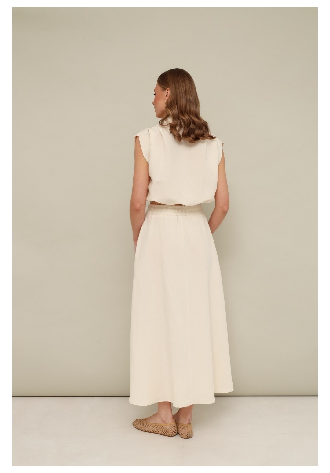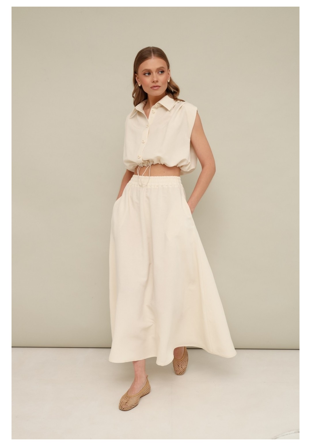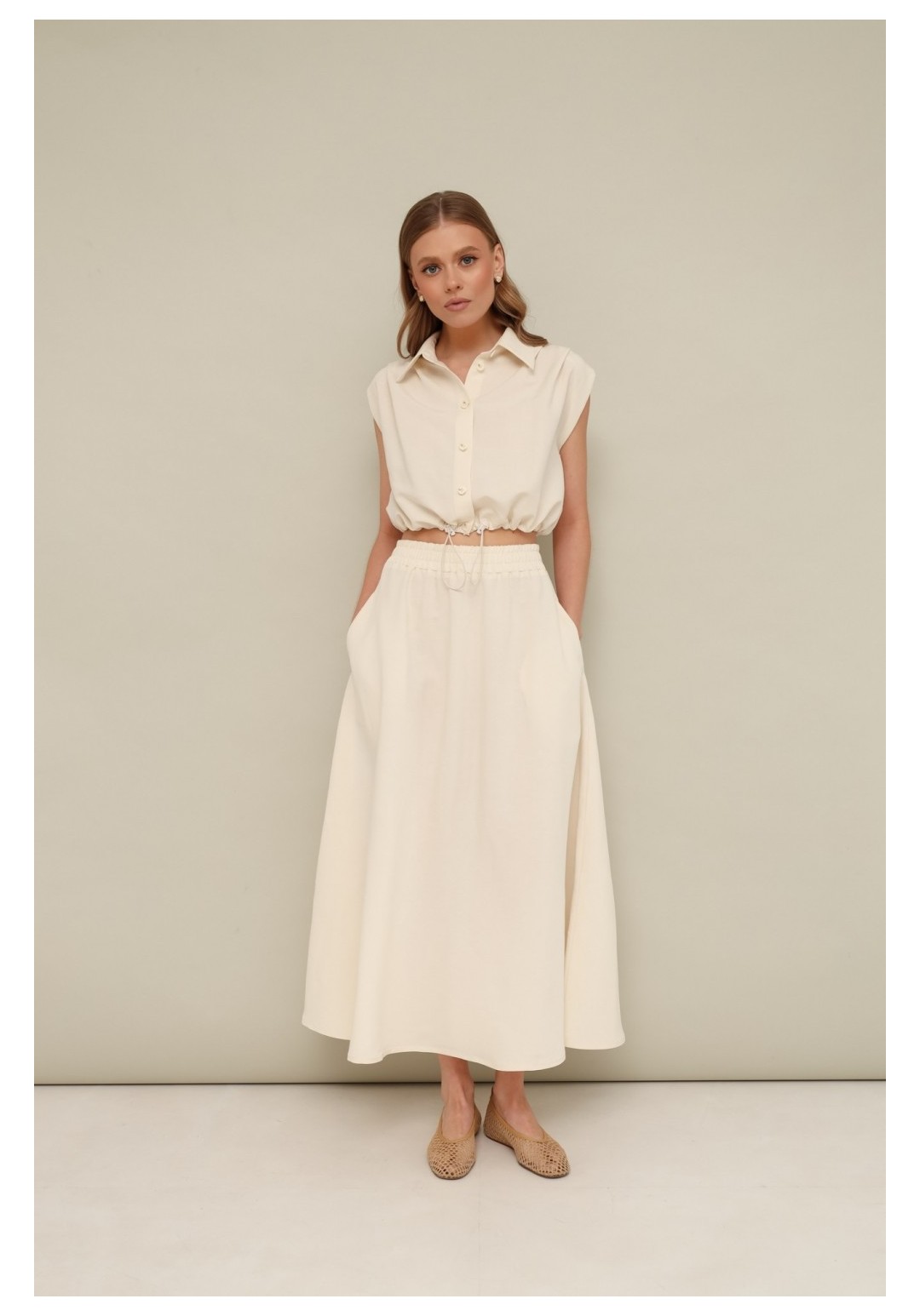 Элегантный 2-предметный комплект актуального кроя, состоящий из блузки и юбки. Блузка прямого силуэта с кулисой и фиксатором на талии. Отложной воротник со стойкой, застежка центральная на петли и пуговицы, по плечевым швам заложены складки. Юбка А-силуэта в длине миди. Притачной пояс на резинке, боковых швах обработаны наклонные карманы.