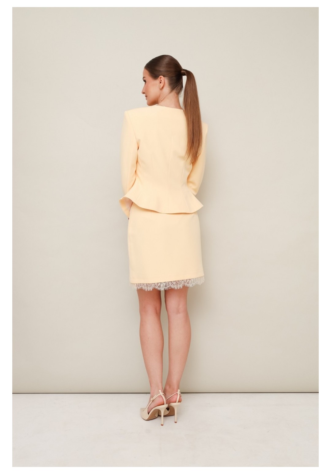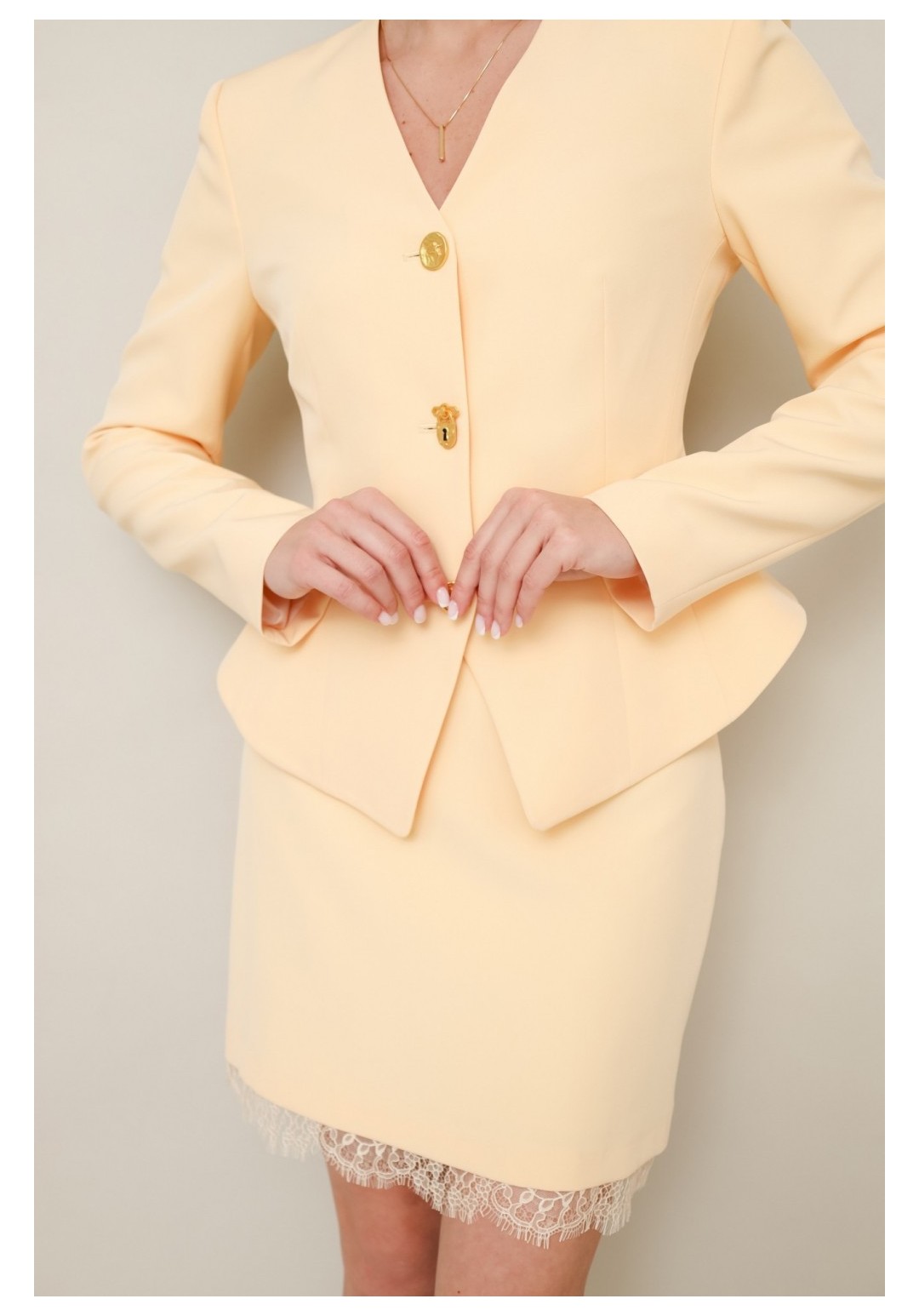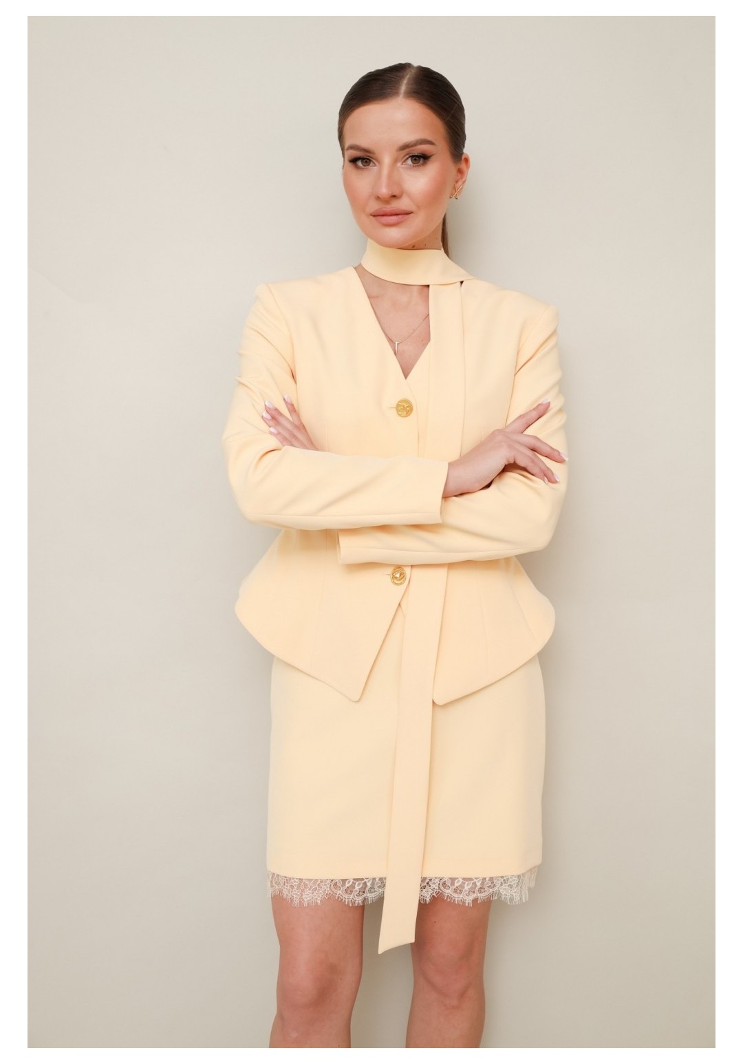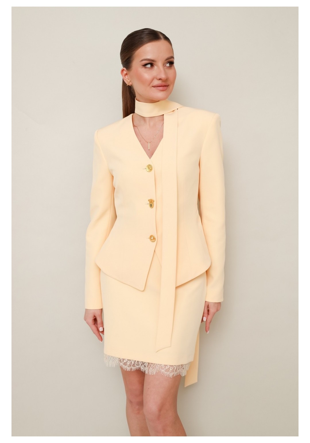Комплект, состоящий из жакета, юбки и шарфа, выполнен из костюмной ткани. Силуэтный жакет актуального кроя с V-образным вырезом горловины. Центральная застёжка на петли и пуговицы. Рукава втачные, двухшовные. Юбка в длине мини, на обтачке по поясу, с застежкой на потайную молнию в среднем шве спинки. Низ юбки декорирован французским кружевом. Жакет и юбка обработаны подкладкой.
