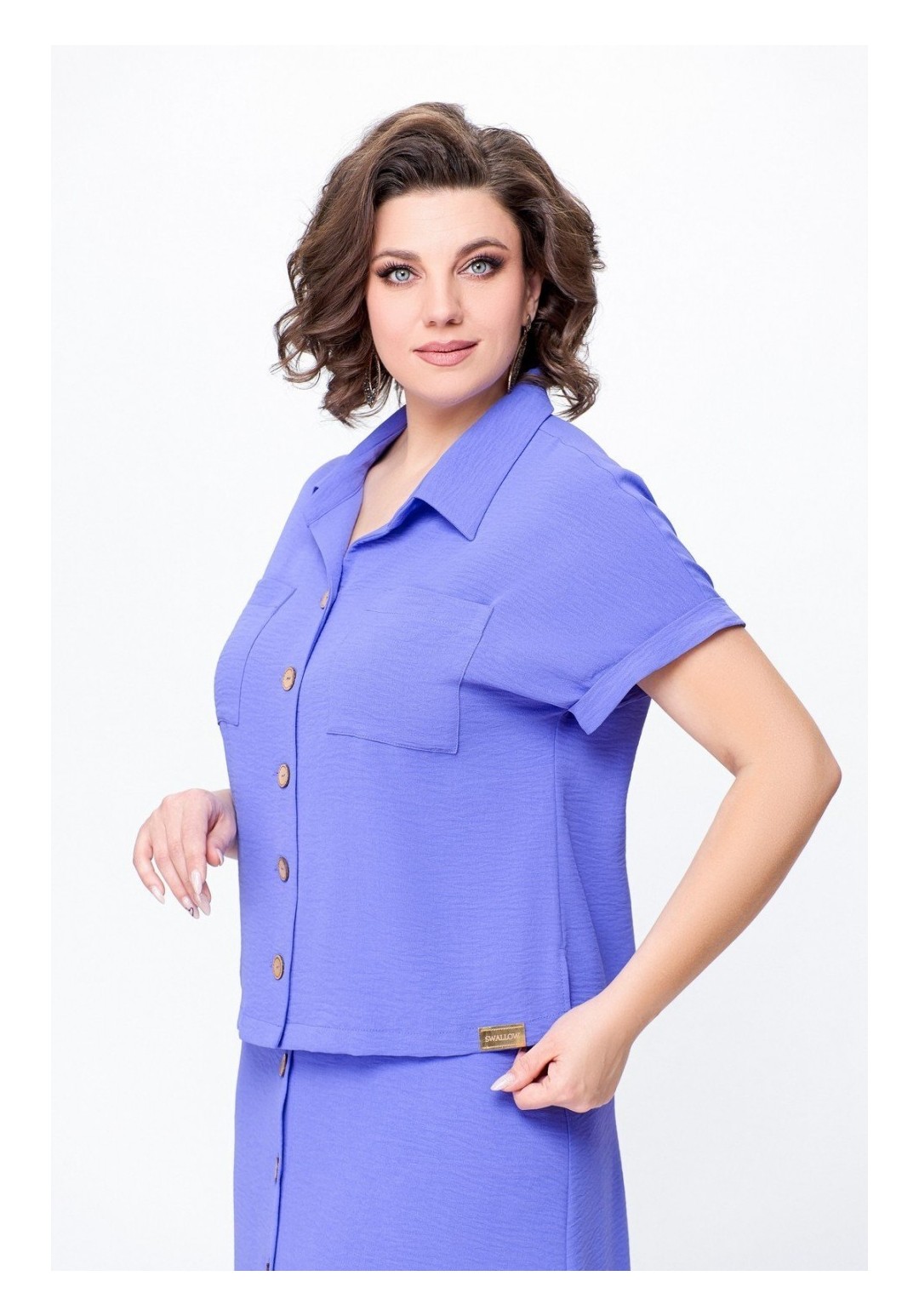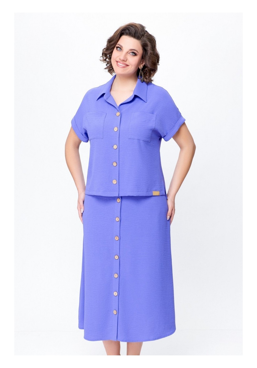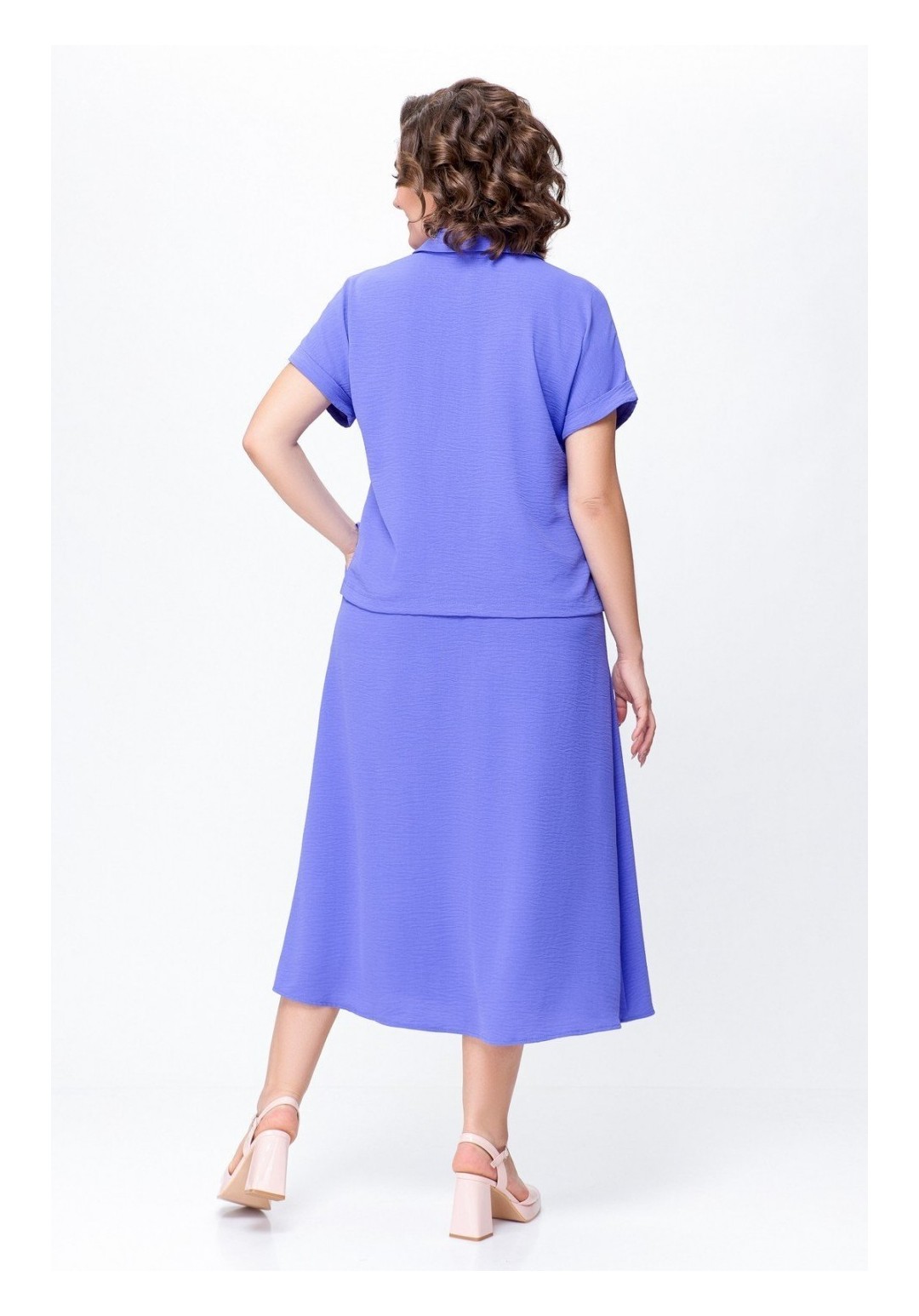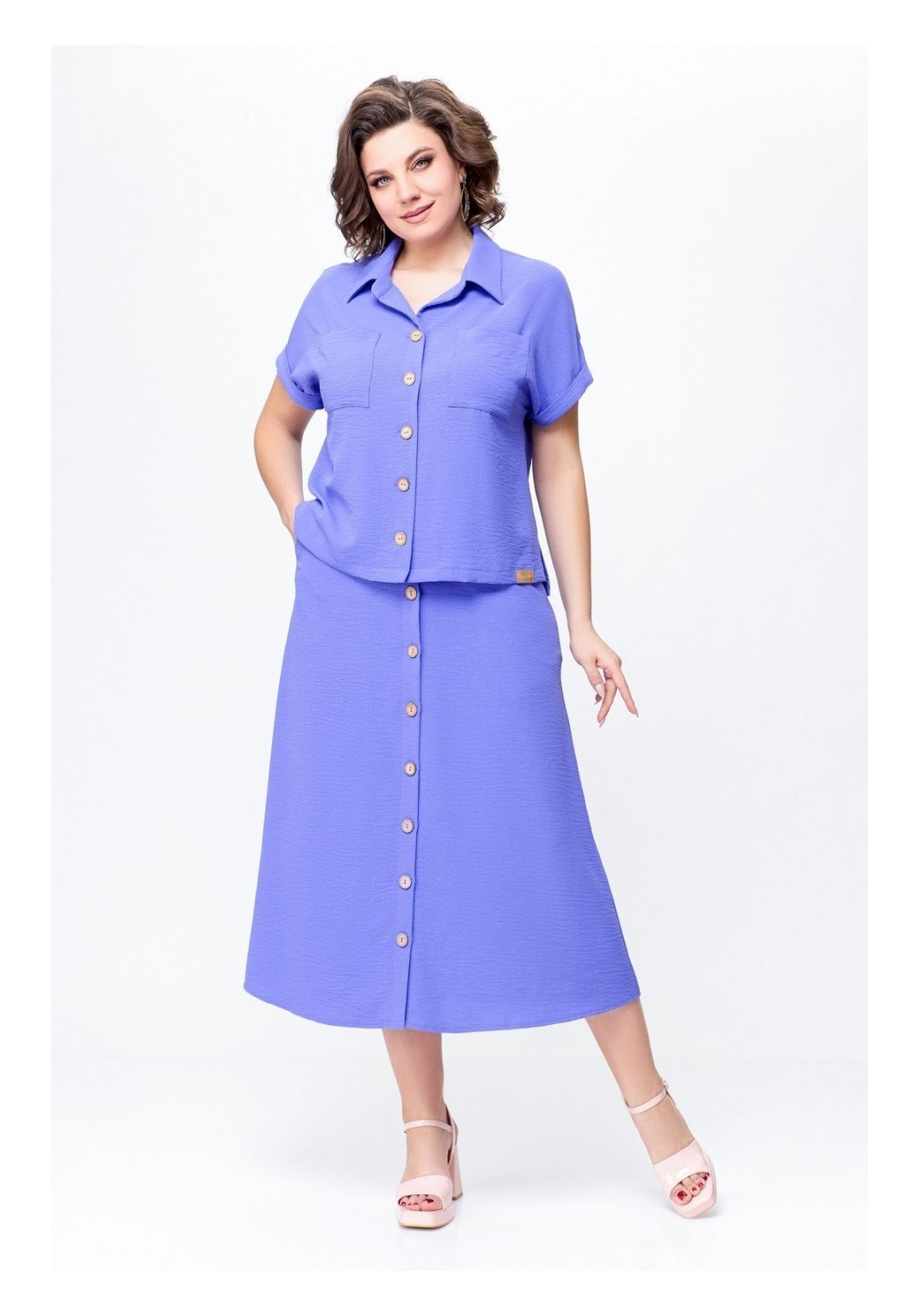 Костюм женский двухпредметный, состоит из блузы и юбки, выполнен из вискозной ткани с эффектом жатка. Блуза прямого силуэта с центральной застёжкой на петли и декоративные пуговицы. На полочке накладные карманы и фирменная нашивка с логотипом, пройма спущенная с отложной манжетой. Воротник отложной со стойкой. Спинка на 1.5 см. длиннее полочки. В боковых швах разрезы . Длина по спинке – 56 см.(+/- 1см.) Юбка А-силуэта длиной миди с застёжкой-планкой на петли и пуговицы по центру. Спереди боковые наклонные карманы. Пояс притачной с резинкой по спинке. Длина по боковому шву 82 см. (+/- 1см.)