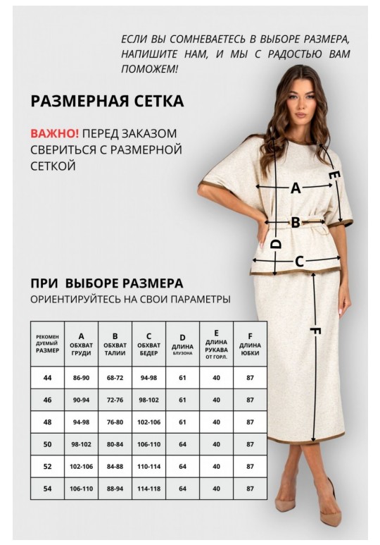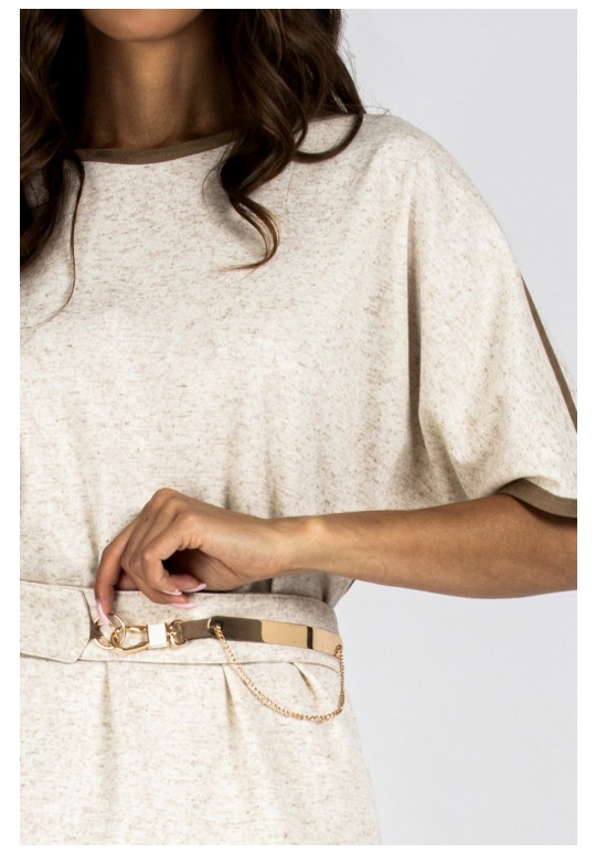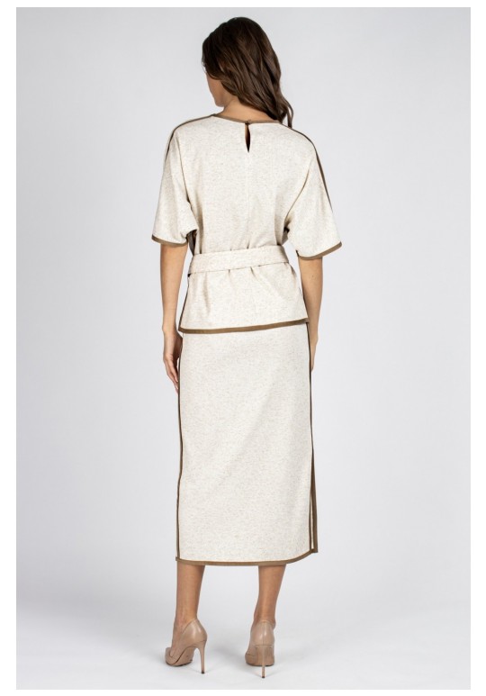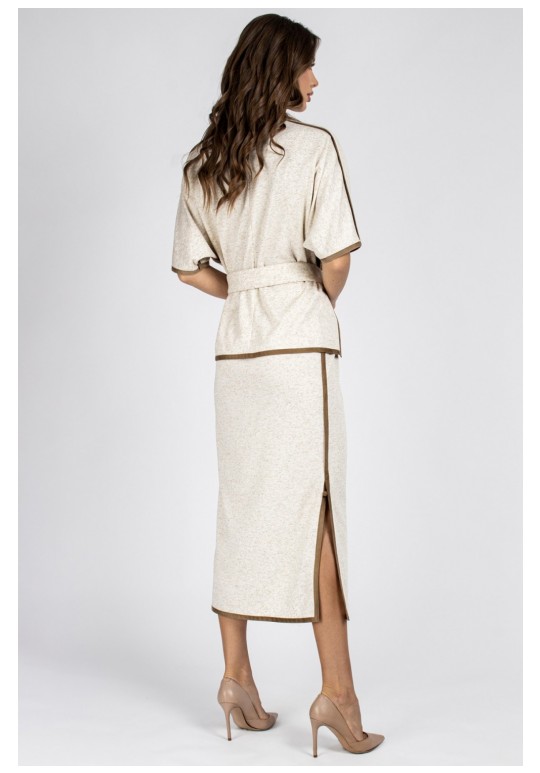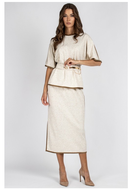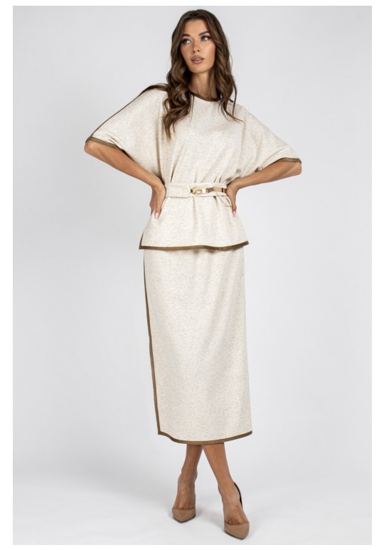 Костюм женский изготовлен из трикотажного полотна, состоит из блузона и юбки. Блузон прямого силуэта с цельнокроеным рукавом. Горловина, низ изделия, низ рукава, боковые, плечевые срезы обработаны отделочной тканью. В боковых швах разрезы с отделочной пуговицей. Юбка прямого силуэта, пояс с резинкой (ширина резинки 4 см.) Боковые срезы обработаны отделочной тканью. В боковом шве разрез с отделочной пуговицей без подкладки. По линии талии съемный пояс с отделочными элементами из металла (цвета золота). Уход: бережная стирка при температуре не выше 30°C.