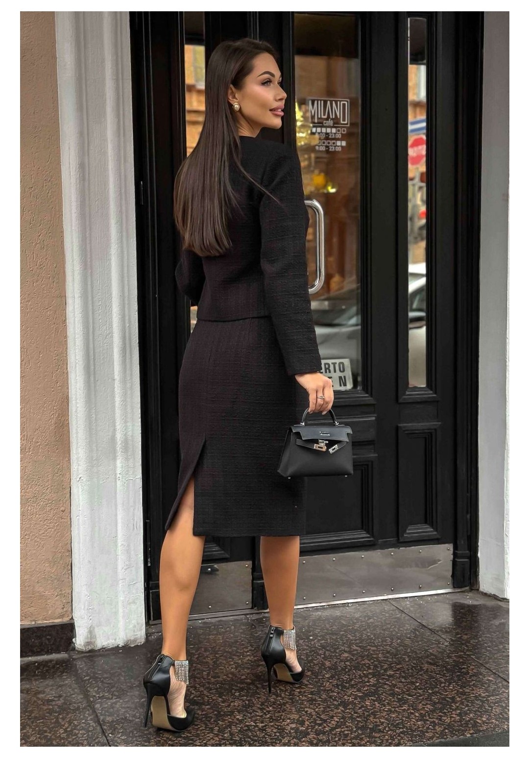 Твидовый костюм с юбкой — это воплощение элегантности и сдержанной роскоши. Юбка и жакет, выполненные в классическом дизайне, придают образу женственности и изящества. Этот костюм станет незаменимым элементом гардероба современной женщины, ценящей комфорт и стиль. Костюм женский 2-предметный, состоящий из жакета и юбки, выполненных из костюмной ткани рогожка. Костюм может быть как нарядный, так и для повседневной носки. Жакет полуприлегающего силуэта, на подкладке, с центральной бортовой застежкой до верха на 4 петли и 4 пуговицы (размер и цвет фурнитуры может незначительно отличаться от фото). Перед с отрезными бочками, с нагрудными вытачками, идущими от бочков, в верхних и нижних частях с настрочными листочками, имитирующими прорезные карманы. На листочки пришиты декоративные пуговицы. Спинка со средним швом, с рельефными швами, идущими от пройм вниз. Рукава втачные, двухшовные, длинные. Горловина переда и спинки обтачная, округлой формы. Жакет с плечевыми накладками. В размерах 44,46,48,50 - юбка-карандаш с завышенной линией талии, зауженная к низу, на притачной по низу подкладке. Верхний край юбки обработан обтачкой. Переднее полотнище с талиевыми вытачками. Заднее полотнище с талиевыми вытачками, со средним швом, в верхней части которого обработана застежка на потайную тесьму-молнию, в нижней – шлица. В размерах 52,54 - юбка-карандаш на притачном поясе, застегивающемся на 1 петлю и 1 пуговицу, с резинками по боковым, зауженная к низу на притачной по низу подкладке. Переднее полотнище с рельефными швами, идущими от верха до низу. Заднее полотнище с талиевыми вытачками, со средним швом, в верхней части которого обработана застежка на потайную тесьму-молнию, в нижней – шлица.