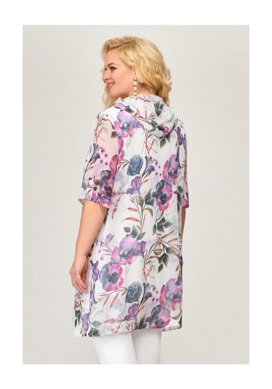 Комплект женский двухпредметный, состоящий из кардигана и топа. Кардиган прямого силуэта с коротким втачным рукавом. По горловине капюшон на кулисе. В боковых швах обработаны карманы и разрезы. Топ полуприлегающего силуэта, с нагрудными вытачками. Перед топа по низу декорирован шифоном. В боковых швах обработаны разрезы. Длина кардигана по спинке 89 см Длина рукава 34 см Длина топа по спинке 73