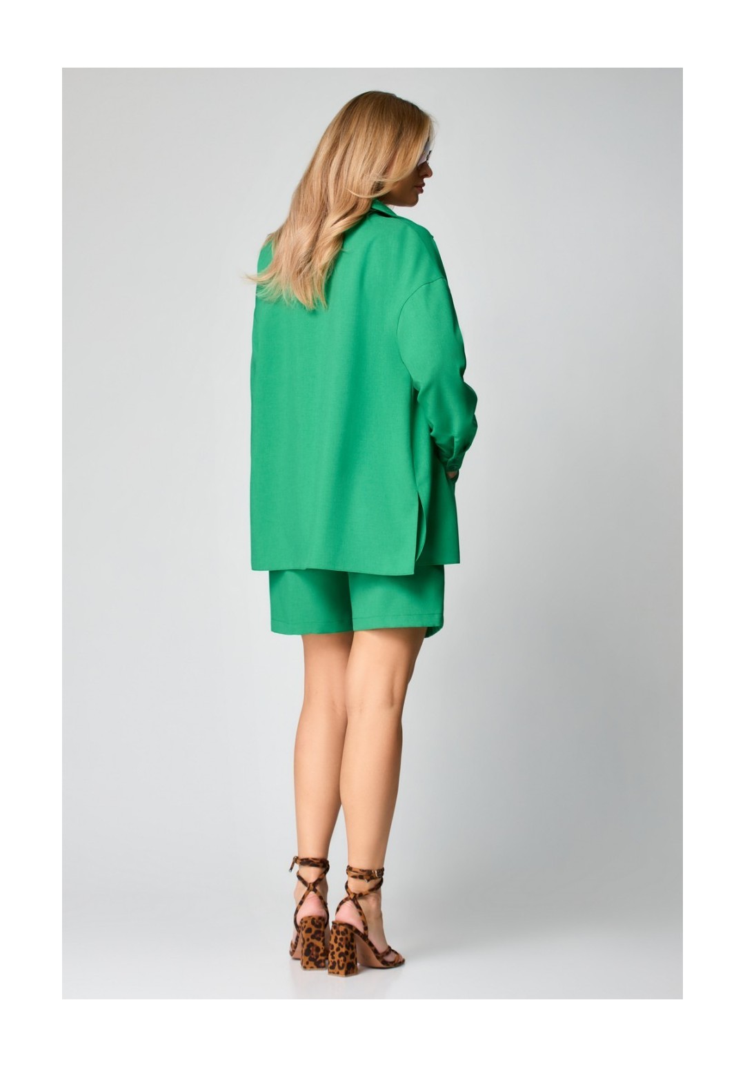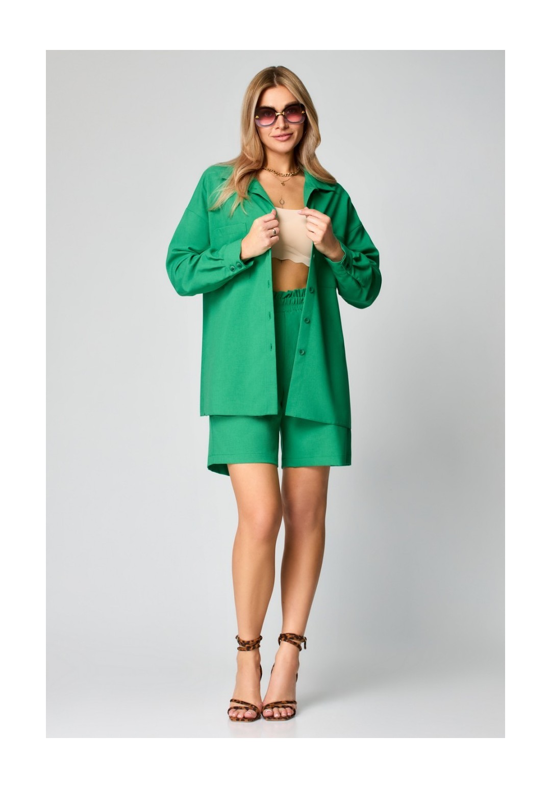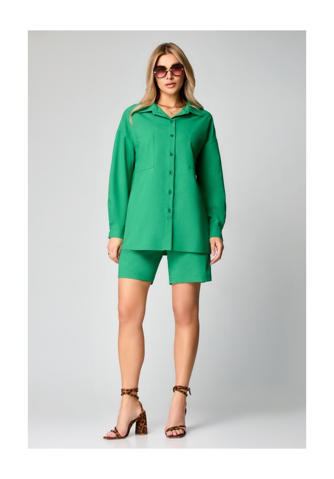 Костюм женский летний с шортами и рубашкой. Рубашка свободного прямого кроя с втачным спущенным рукавом. По переду в верхней части накладные карманы. Застежка центральная на 8 петель и пуговиц. Воротник отложной на стойке. В боковых швах обработаны разрезы. Рукав длинный, по низу притачная манжета с застежкой на 2 петли и пуговицы. Шорты прямого кроя, пояс на широкой резинке. Передние половинки с боковыми карманами. Фурнитура может меняться от наличия. Топ в комплект не входит. Длина блузки по спинке: 73 см Длина рукава от горловины: 72 см Длина шорт: 49 см