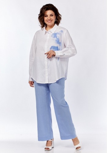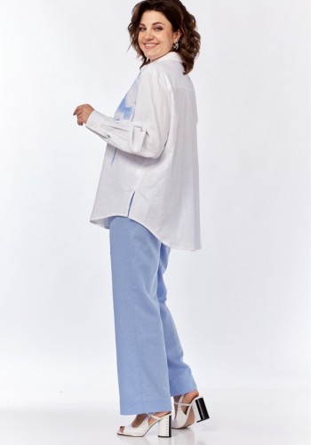 Блуза прямого,свободного силуэта с застежкой на пуговицы. Длина блузы 60 см, длина рукава 62см. Шорты состоят из двух частей, верхняя часть съемная в виде баски, по переду баски расположены настрочные клапаны, застежка центральная на кнопку, по низу баски настрочена декоративная тесьма в виде цепи. Нижние шорты с завышенной талией, в левом боковом шве расположена потайная молния.