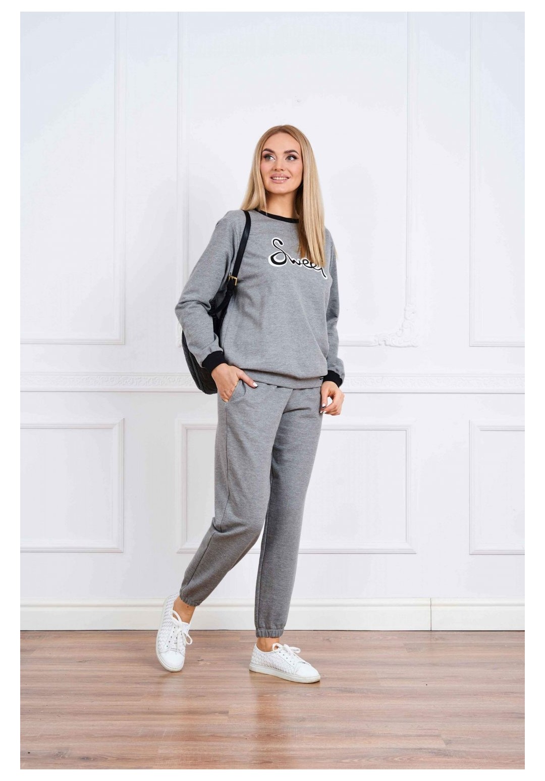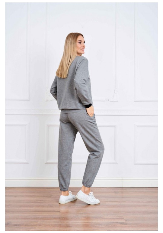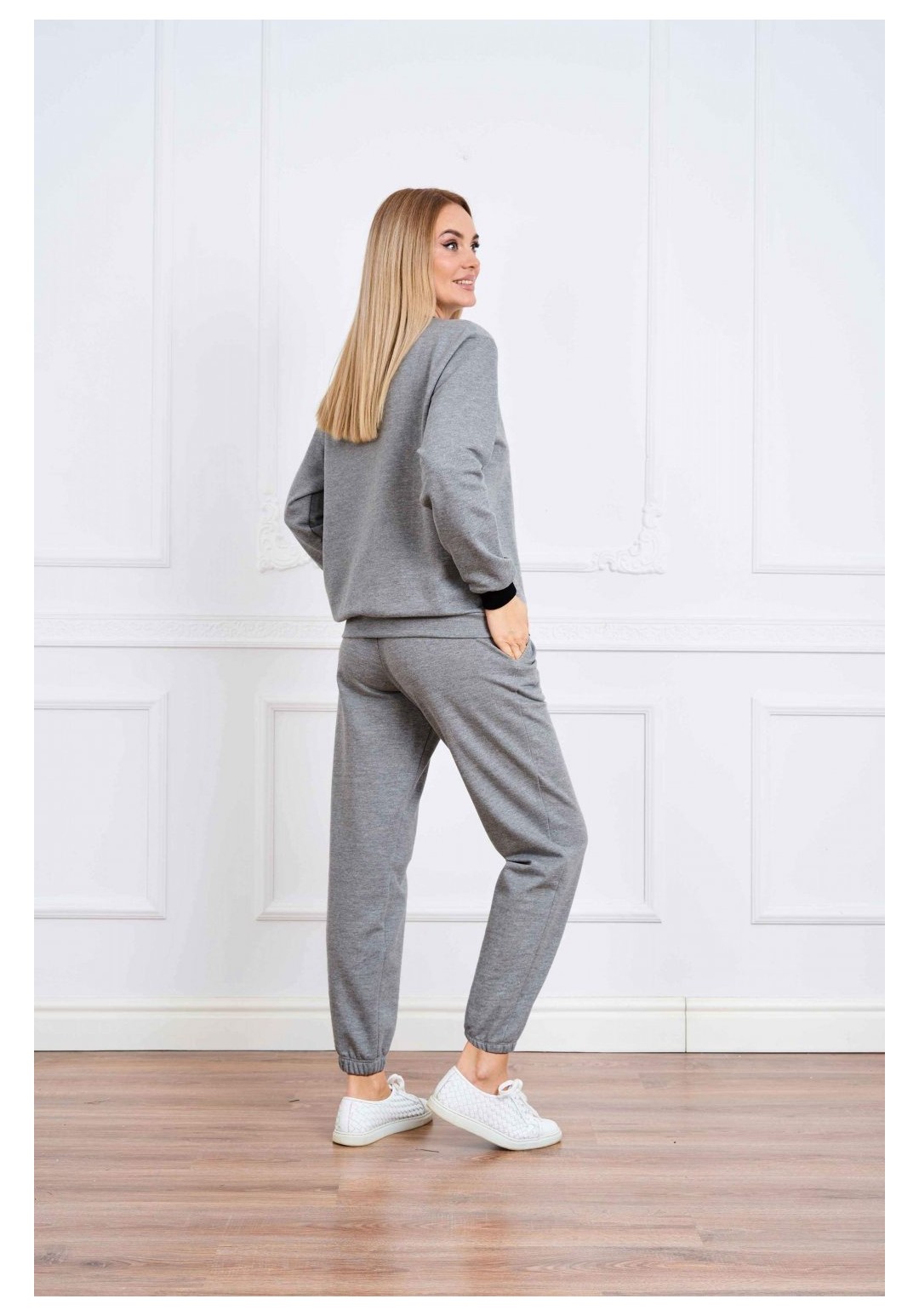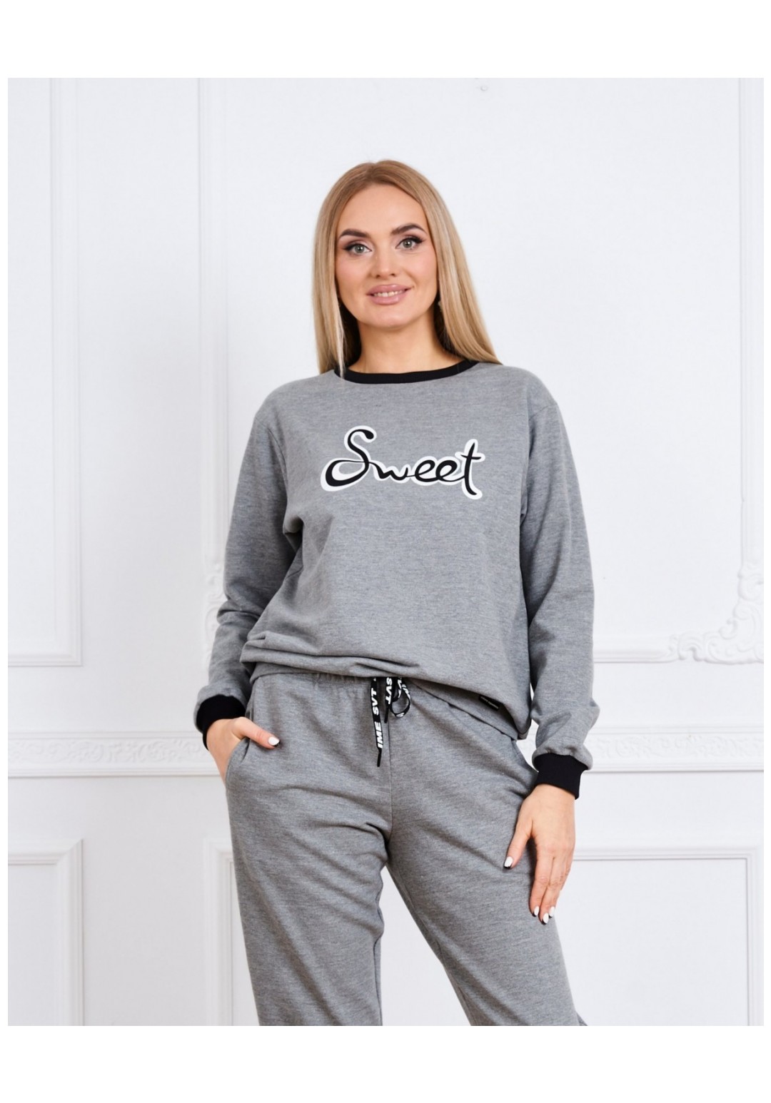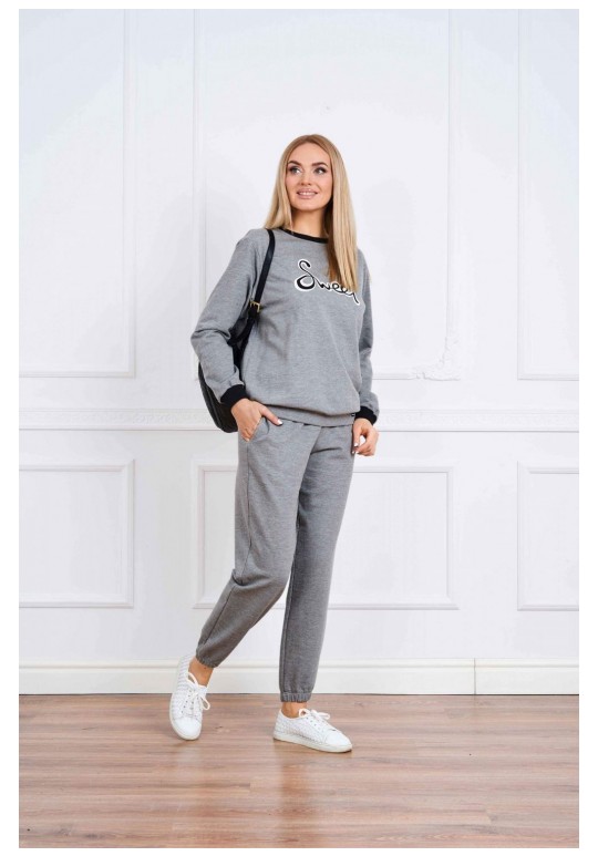 Комплект женский брючный спортивный, состоящий из джемпера и брюк. Джемпер прямого силуэта, свободный, с втачным рукавом на спущенной пройме, вырез горловины полукруглый с довязом. Брюки прямые, свободные, на поясе с элатичной тесьмой и шнурком, низ брюк заужен, караманы вертикальные по передним половинкам брюк. Длина изделия: размеры: (44-48) джемпер: 62см, брюки: 95см. размеры (50-54) джемпер: 63,5см, брюки: 95см. Длина рукава 58 см. Ширина по линии груди: джемпер(44):55см джемпер(46):57см джемпер(48):59см джемпер(50):61см джемпер(52):63см джемпер(54):65см Ширина по линии бедер: джемпер(44):47см брюки:52см джемпер(46):49см брюки:54см джемпер(48):51см брюки:56см джемпер(50):53см брюки:58см джемпер(52):55см брюки:60см джемпер(54):57см брюки:62см Ширина по линии талии: брюки(44):36см брюки(46):38см брюки(48):40см брюки(50):42см брюки(52):44см брюки(54):46см