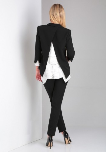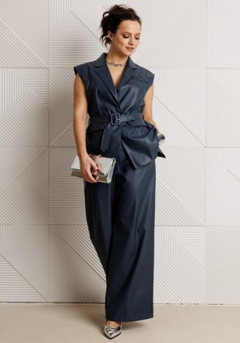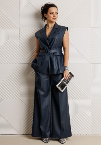 Комплект женский, состоящий из жакета и брюк из разных видов ткани. Жакет из полосатой ткани. Прилегающего силуэта, с коротким рукавом, отрезной по линии талии, 2-бортный с застежкой на петли и пуговицы, с отложным воротником и лацканами, по переду -карманы с листочкой, спинка так же с втачным поясом. Изделие без подкладки. Брюки прямые, своюодные, на поясе-кокетке, с боковыми карманами, с застежкой спереди на молнию и пуговицы. Длина жакета: (44-48) 65 см, (50-54) 67 см. Длина рукава 10 см. Длина брюк 112 см.