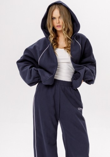 Комплект женский брючный спортивный,состоящий из джемпера и брюк. Джемпер свободгого покроя со спущенной проймой и рукавом на манжете, с застёжкой спереди на молнию, с воротником, с карманами по переду изделия. На манжете по низу изделия. Брюки прямые, расширенные к низу, на поясе с эластичной тесьмой, с карманами в боковых швах.
