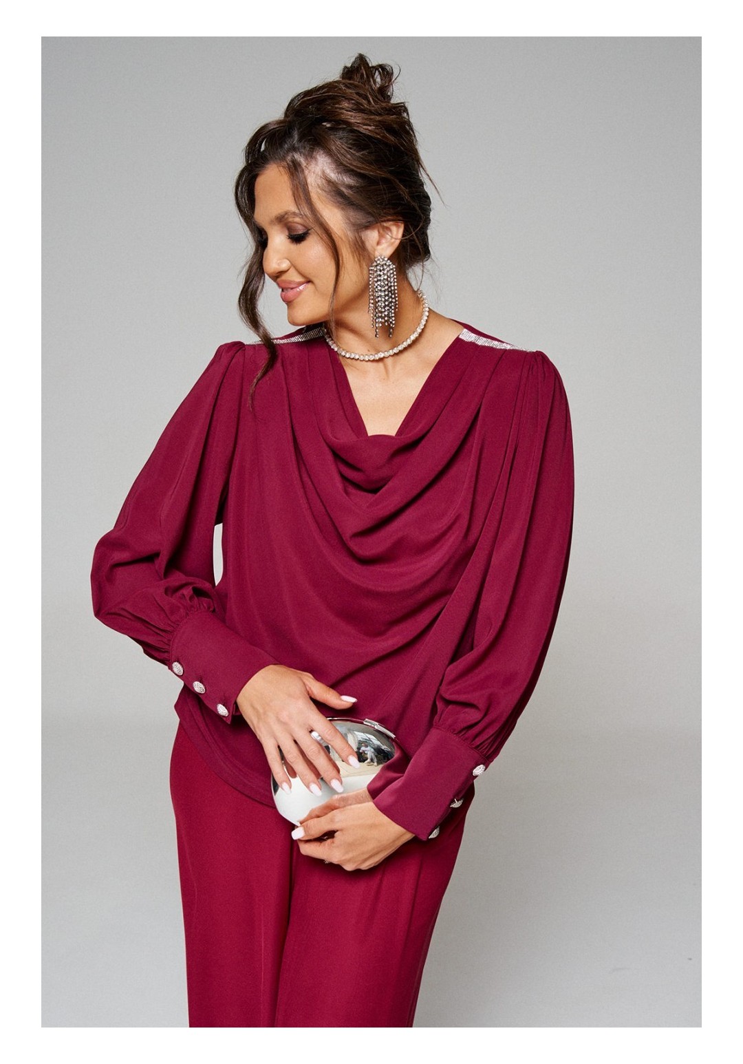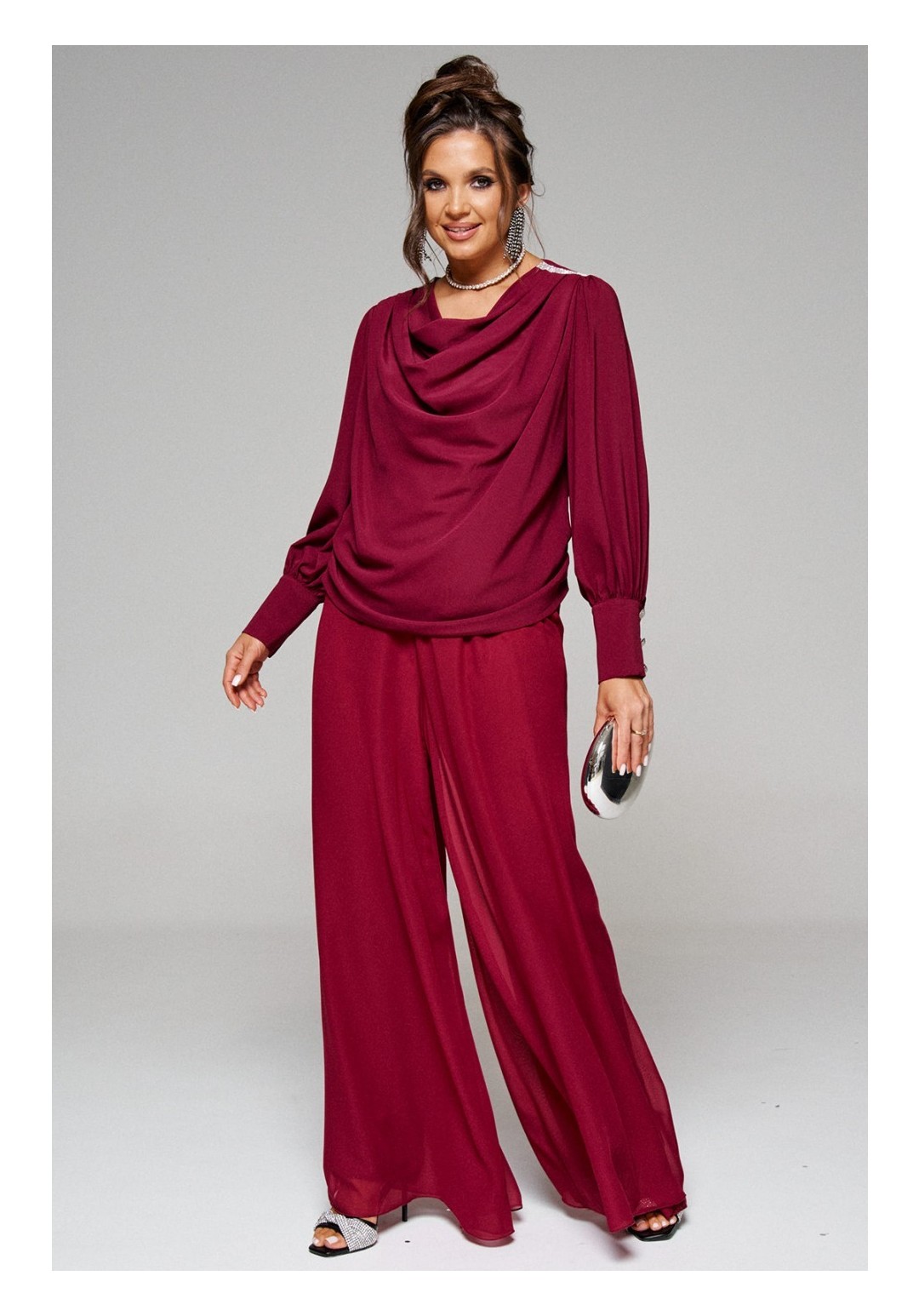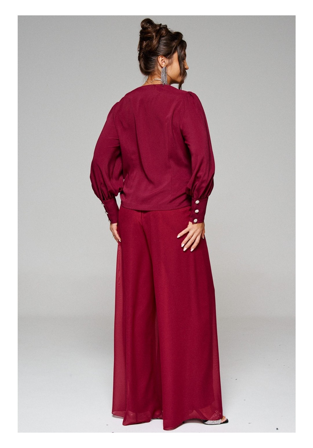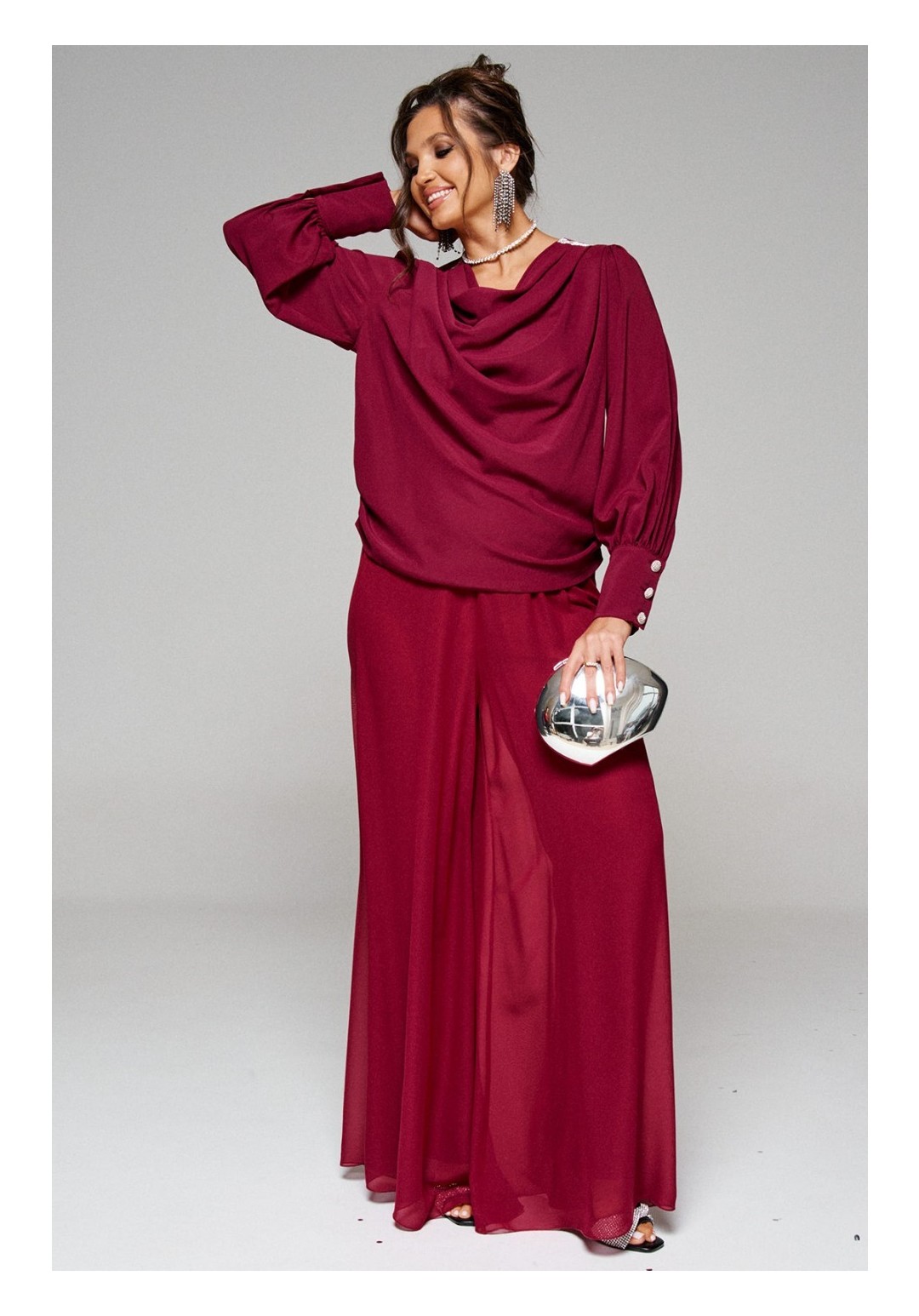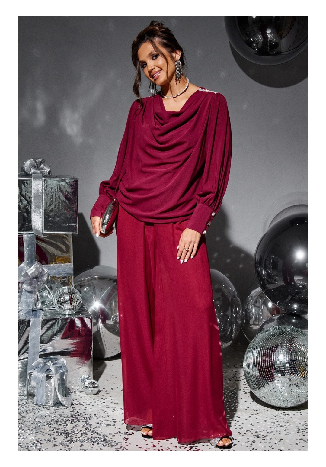 Стильный, нарядный женский комплект прекрасно вольется в ваш гардероб, благодаря своей актуальности. Оба изделия можно смело комбинировать по отдельности с другими вещами вашего гардероба. Изысканный нарядный образ состоит из 2-х элементов: блузки и брюк. Блузка полуприталенного силуэта; выполнена из костюмно - смесового полотна. У этой ткани нежная, гладко-бархатистая фактура, приятная наощупь, и матовая поверхность. Она легко драпируется и очень выгодно и дорого подчёркивает ваш неповторимый образ. Передняя часть цельнокроеная. Горловина переда с мягким, аккуратным и женственным вырезом качели. Такой вырез горловины очень гармонично смотрится в праздничных нарядах. В верхней части полочки, по линии плеча расположен декоративный элемент в виде широкой тесьмы из страз. Спинка – цельнокроеная, с двумя выточками на уровне талии. Рукав одношовный, втачной; широкий, объёмный, со сборкой в верхней части проймы и снизу. Нижняя часть рукава обработана высокой манжетой, которая фиксируется на нарядные, декоративные пуговицы. В боковых швах, в нижней части вставлена резинка, для придания изделию нужной формы. Брюки двуслойные, выполнены из двух видов ткани. Свободного, прямого силуэта. Высота сиденья классическая, высокая. Застежка отсутствует. Брюки на поясе, в который вставлена резинка по всей окружности. С учетом плюсовых прибавок подходит на рост 170 см. Длина блузки (по среднему шву спинки) – 58-59 см. (в зависимости от размера) Длина рукава – 62-63 см. (в зависимости от размера) Длина брюк – 110 см.