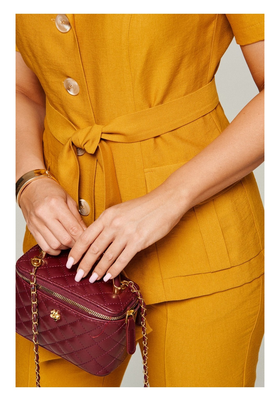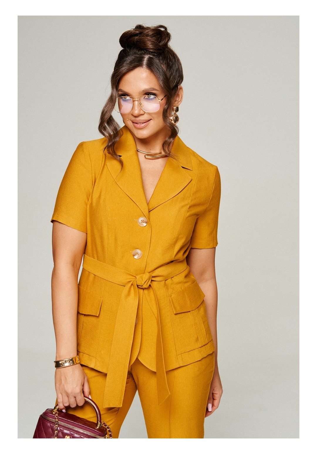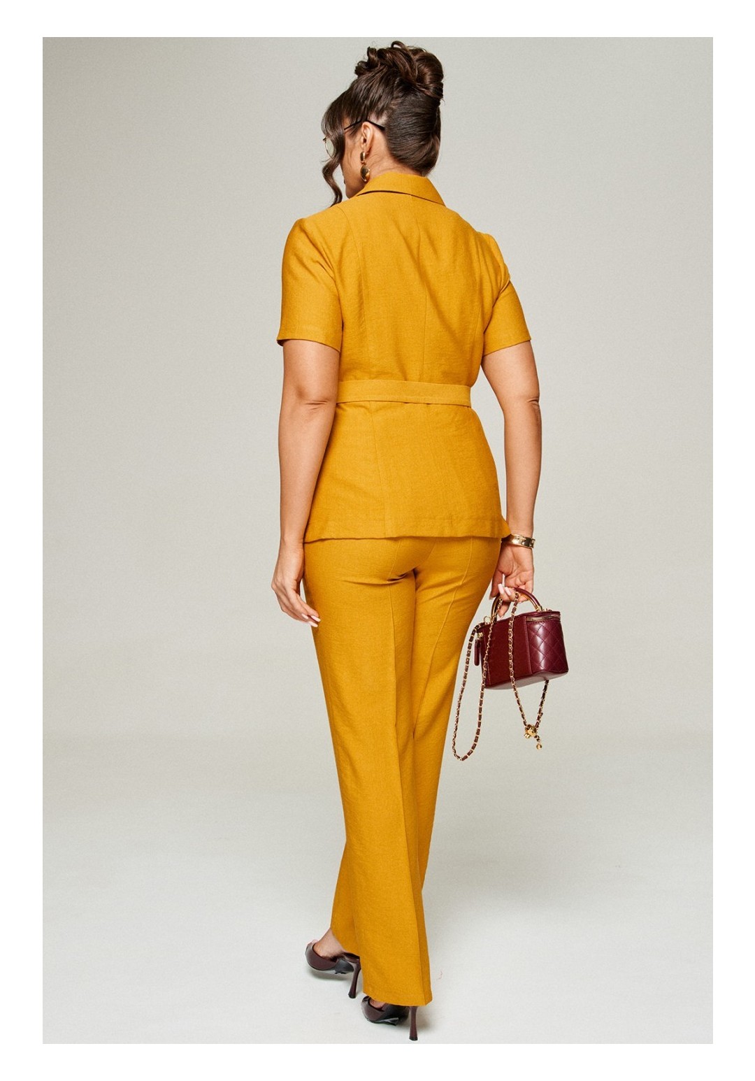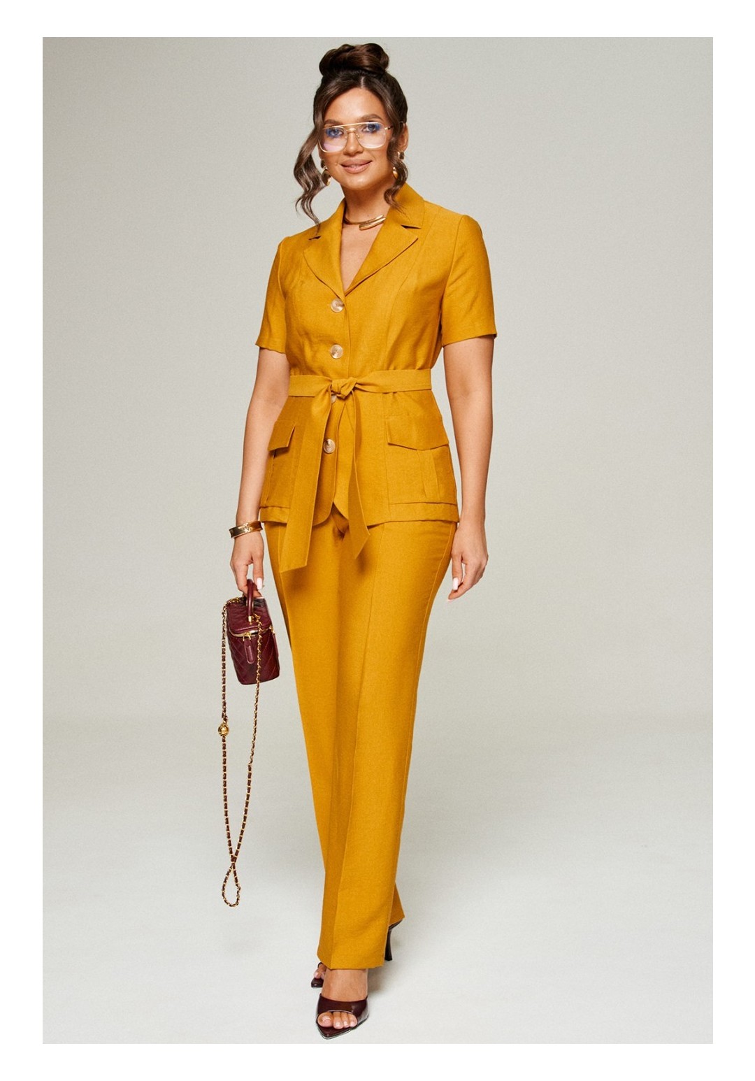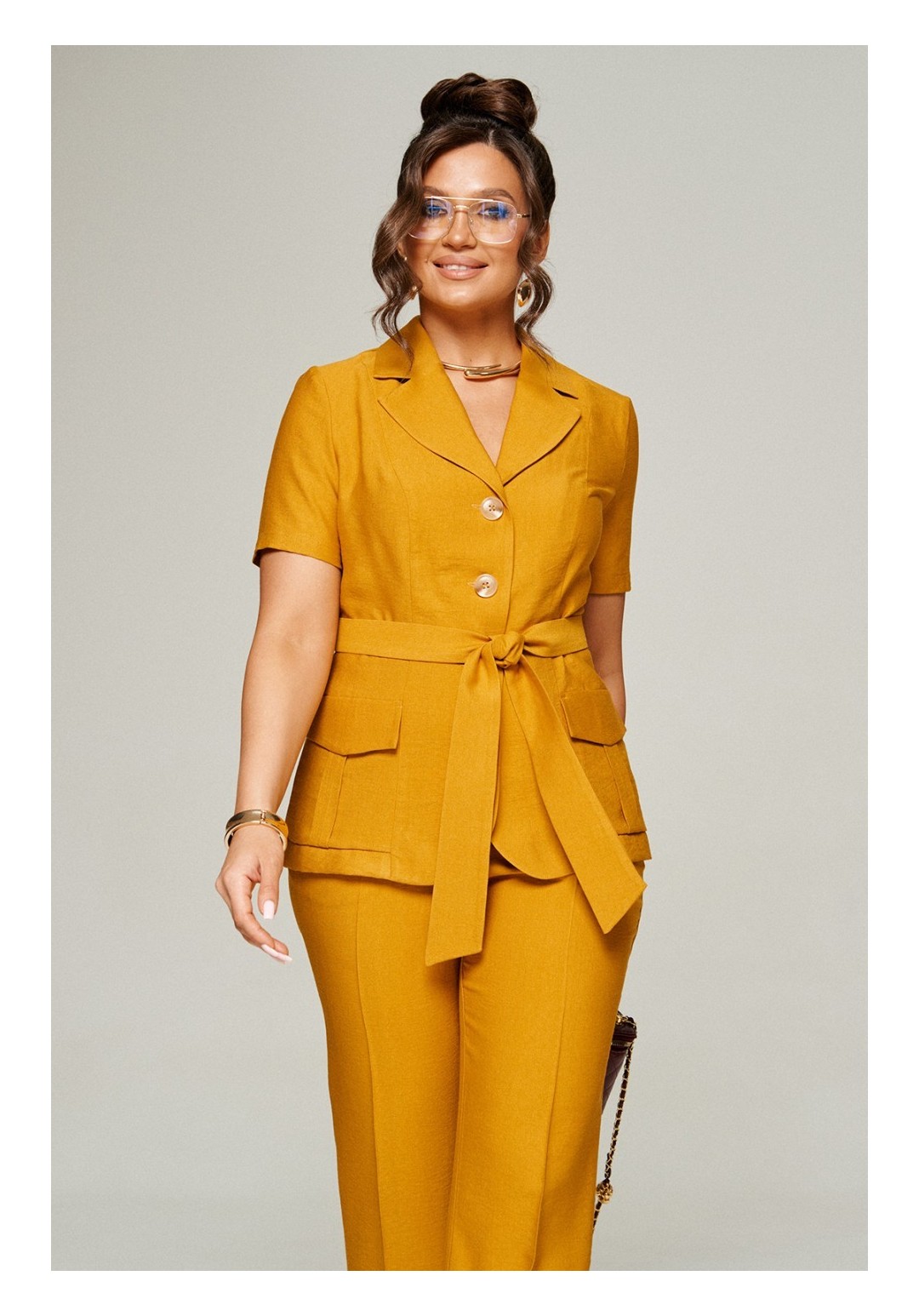 Классический с деловым акцентом женский костюм из жакета и брюк, выполнен из смесовой ткани с добавлением натуральных волокон. Жакет прилегающего силуэта однобортный без подкладки. Передняя часть жакета с двумя вертикальными рельефами от плеча. На нижней части переда предусмотрены два накладных функциональных кармана со складкой и клапаном. Спинка разрезная по среднему шву с двумя вертикальными рельефами от плеча. Рукав короткий, одношовный, втачной. Воротник классический, стояче - отложной, пиджачного типа с лацканами. Застежка центральная на четыре декоративные пуговицы. Низ борта закругленный. Брюки длинные, классические, стандартной посадки. В верхней части бокового шва брюк расположены функциональные карманы. Застежка центральная на молнию и на петлю с пуговицей на поясе. В задней части пояса брюк вставлена резинка. К костюму прилагается пояс. С учетом плюсовых прибавок подходит на рост 170 см. Длина жакета (по среднему шву спинки) ~ 66,5 см. Длина рукава (жакет) ~ 25 см. Длина брюк (по боковому шву с поясом) – 107 см.