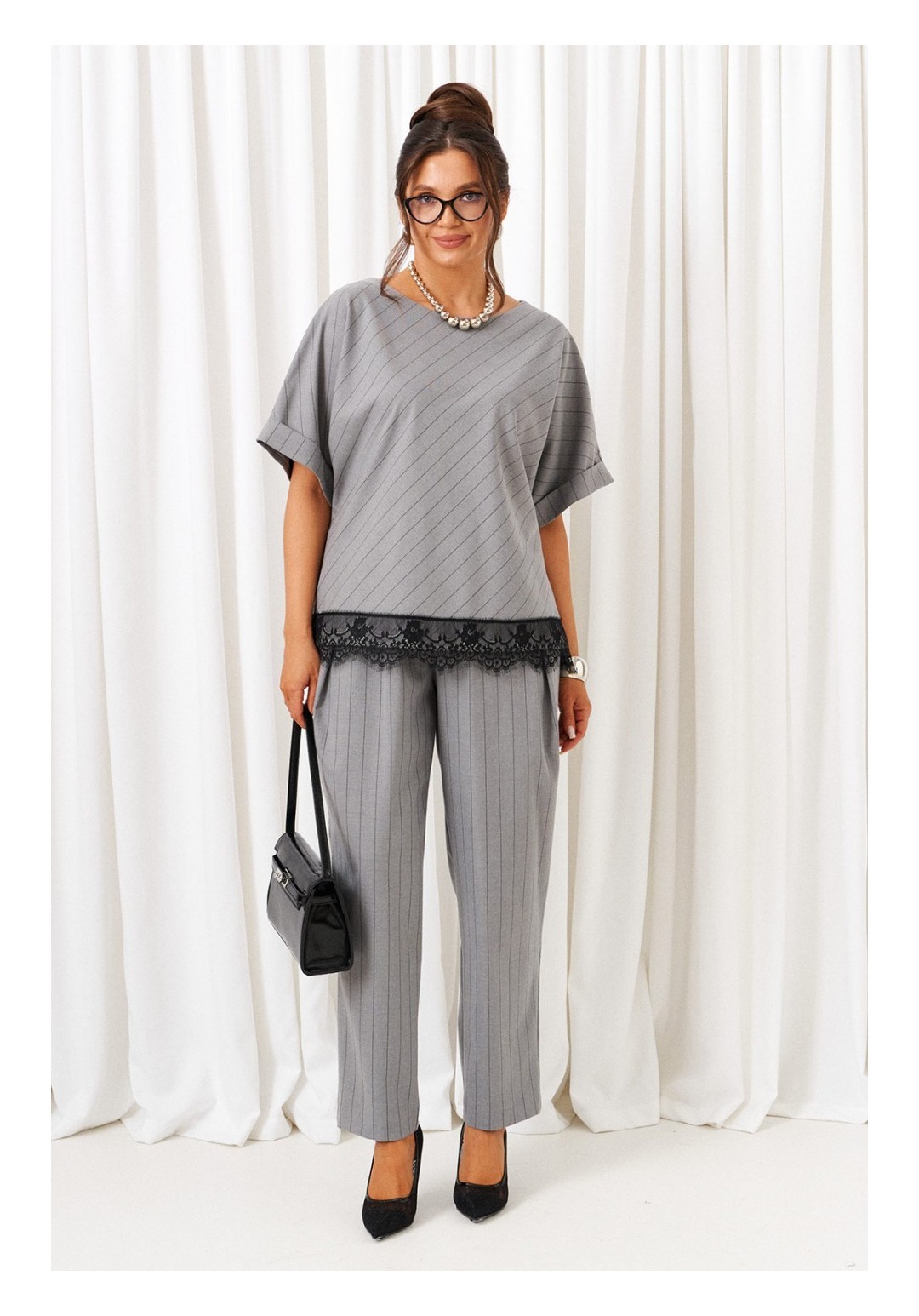 Стильный женский костюм отличительного кроя весьма актуален в будущем сезоне. Предметы костюма можно смело комбинировать по отдельности с другими вещами гардероба. Костюм состоит из 2-х предметов одежды: блузона и брюк. Выполнен из костюмной ткани стильного дизайна в полоску. Блузон прямого силуэта свободного цельнокроеного покроя, с удлиненной линией плеча. Перед выполнен по косой, симметричный. Спинка цельнокроеная по косой. Рукав длиной до локтя, с притачной манжетой-отворотом. Вырез горловины округлой формы на обтачке. Без застежки. Низ ровный. Брюки свободного силуэта расширенные вверху и слегка зауженные к низу, длиной до щиколотки, с двумя верхними боковыми карманами и двумя заложенными глубокими складками от пояса спереди. Высота сиденья классическая. Брюки на притачном поясе, по кругу которого вставлена резинка. Длина блузона (по середине спинки) ~ 62 см. Длина рукава (с плечом и отворотом) ~ 37 см. Длина брюк (с поясом) ~ 99 см.