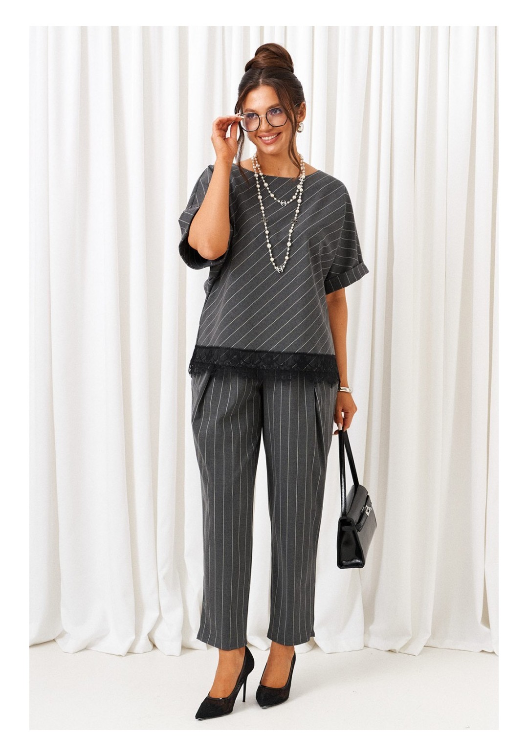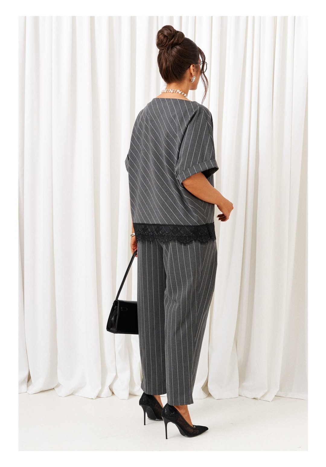 Стильный женский костюм отличительного кроя весьма актуален в будущем сезоне. Предметы костюма можно смело комбинировать по отдельности с другими вещами гардероба. Костюм состоит из 2-х предметов одежды: блузона и брюк. Выполнен из костюмной ткани стильного дизайна в полоску. Блузон прямого силуэта свободного цельнокроеного покроя, с удлиненной линией плеча. Перед выполнен по косой, симметричный. Спинка цельнокроеная по косой. Рукав длиной до локтя, с притачной манжетой-отворотом. Вырез горловины округлой формы на обтачке. Без застежки. Низ ровный. Брюки свободного силуэта расширенные вверху и слегка зауженные к низу, длиной до щиколотки, с двумя верхними боковыми карманами и двумя заложенными глубокими складками от пояса спереди. Высота сиденья классическая. Брюки на притачном поясе, по кругу которого вставлена резинка. Длина блузона (по середине спинки) ~ 62 см. Длина рукава (с плечом и отворотом) ~ 37 см. Длина брюк (с поясом) ~ 99 см.