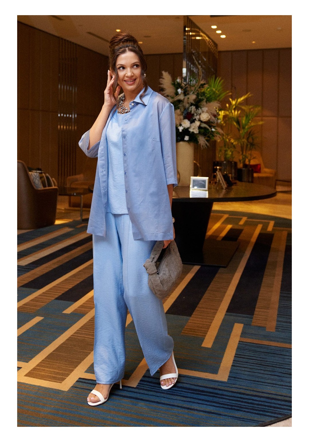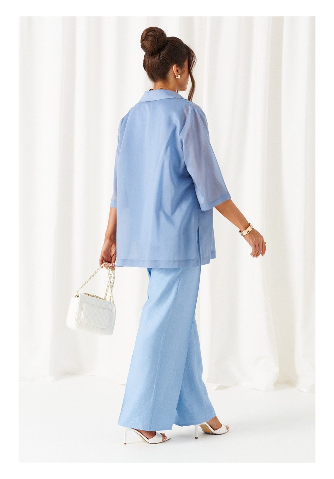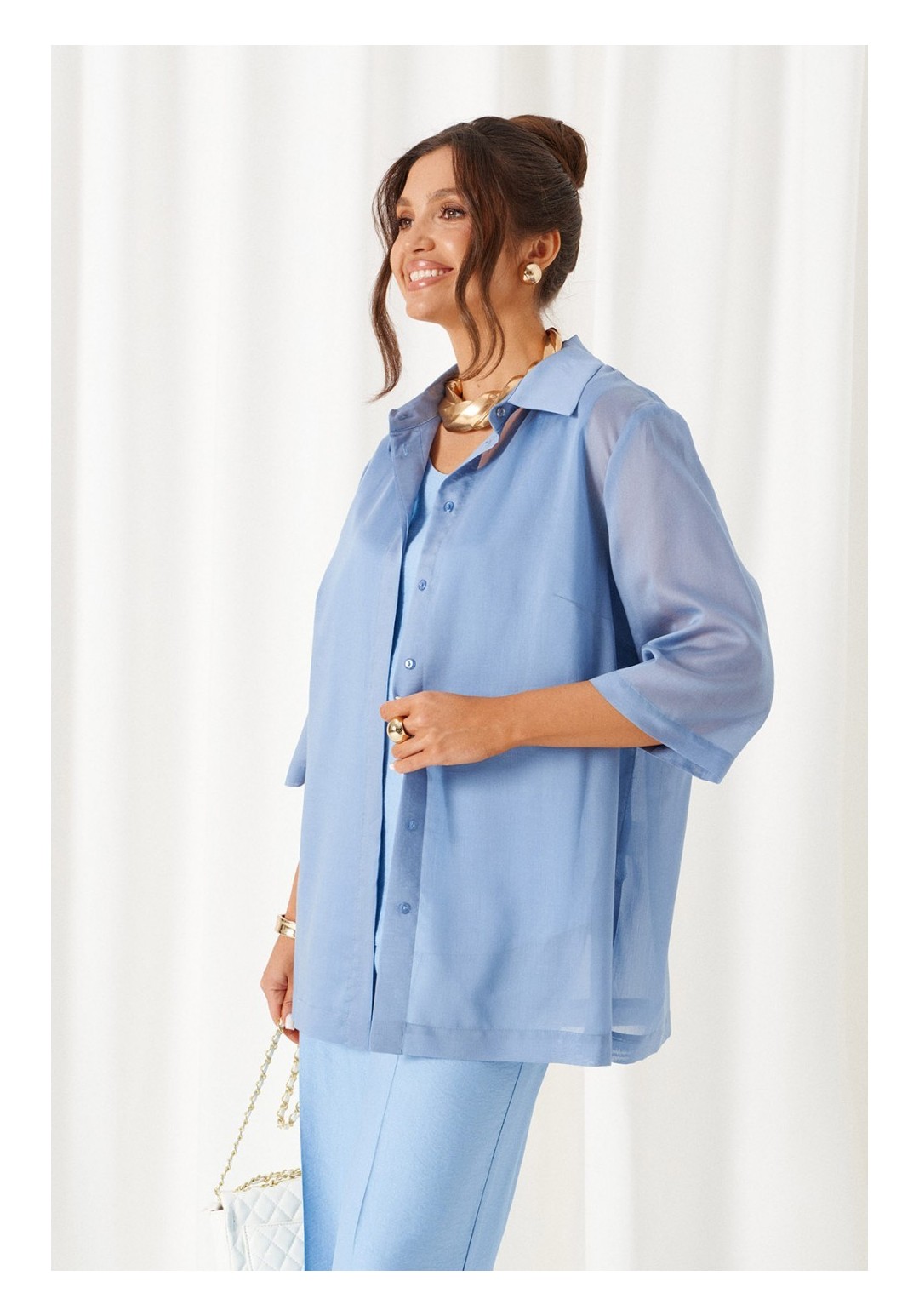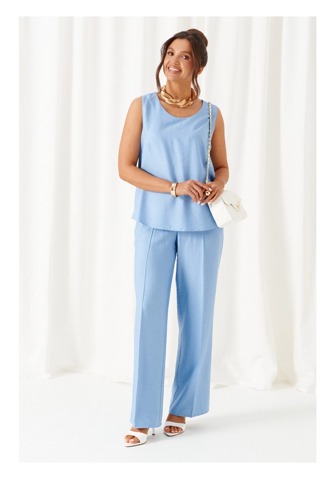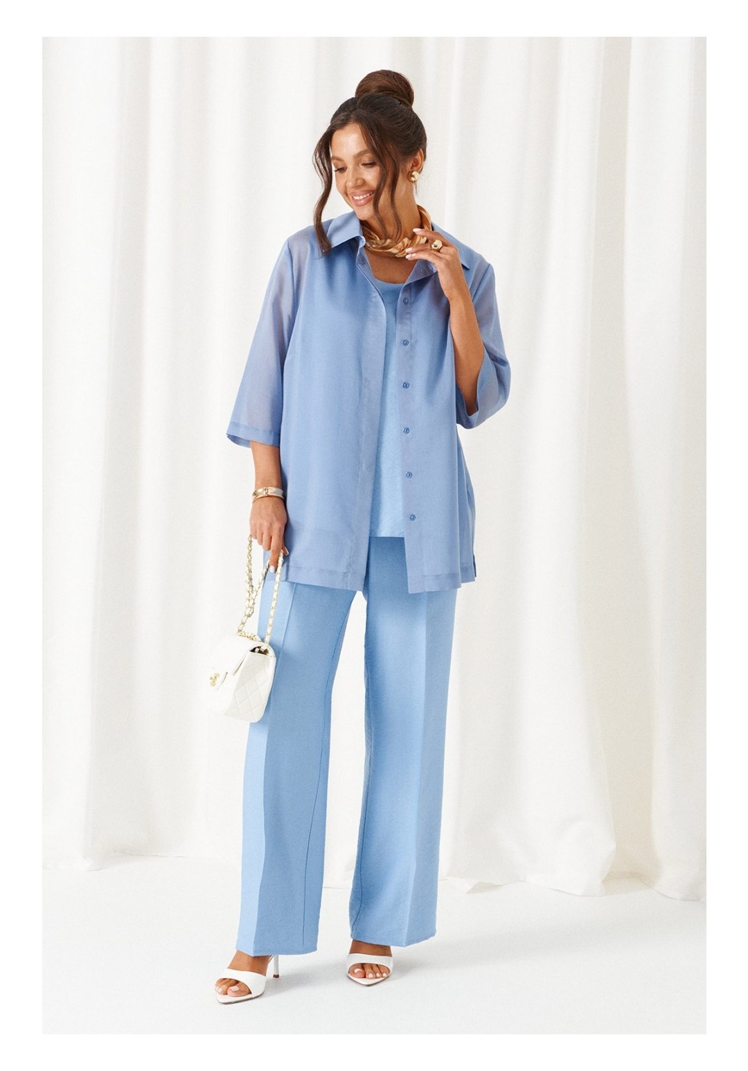 Комплект с блузкой из вуали, льняных брюк и топа – изделие вне времени и трендов, созданное в различных интерпретациях: от оверсайза до классики. Предназначен для повседневного и выходного использования. Найдет применение в жаркую и прохладную летнюю погоду. Блузка свободного силуэта выполнена из смесового полотна с содержанием вискозы. Передняя часть из двух половинок с нагрудными вытачками от бокового шва. Спинка цельная. Рукав одношовный втачной длиной ¾ свободный. Воротник классический стояче-отложной на отрезной стойке. Застежка центральная потайная. Низ изделия ровный, в боковых швах предусмотрены высокие разрезы. Топ полуприлегающего силуэта, выполнен из тонкого смесового льняного полотна. Перед цельный, с двумя нагрудными вытачками от бокового шва. Спинка цельная. Горловина округлой формы. Низ слегка закруглен к боковым участкам. Брюки длинные, прямые свободные; выполнены из смесового льняного полотна. Посадка классическая, высокая. Застежка центральная на молнию и петлю с пуговицей на поясе. Спереди расположены боковые функциональные карманы. Пояс притачной, сзади на резинке, шириной 4см. Длина блузки (по середине спинки) ~ 74 см. Длина рукава блузки (от плечевой точки до низа) ~ 41 см. Длина топа (по среднему шву спинки) ~ 62-63 см. Длина брюк (по боковому шву с поясом) ~ 108 см.