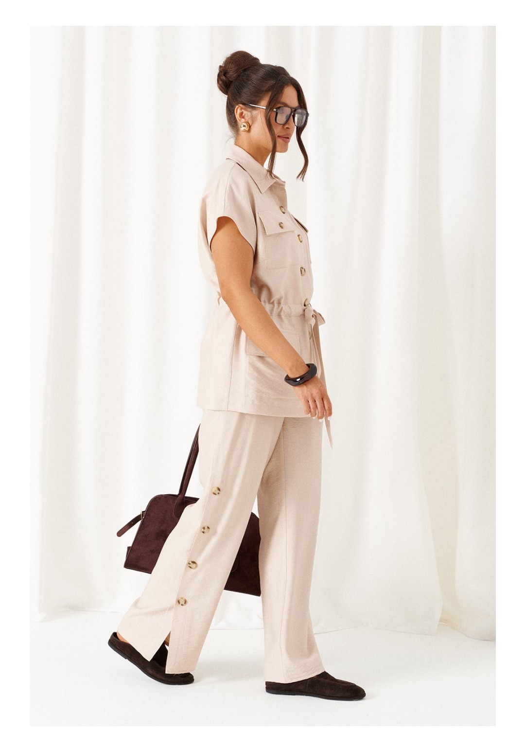 Женский льняной костюм из смесовой ткани с натуральным составом, акцентные накладные карманы и безупречные любимые оттенки. Созданный в расслабленном крое с подчеркнутыми деталями, костюм позволит чувствовать себя комфортно и непринужденно. Стильный костюм состоит из жакета-рубашки и брюк, выполнен из мягкой ткани с волокнами льна и вискозы, практичен в носке. Жакет свободного силуэта, удлиненный с кулисой и пояском-завязкой. Передняя часть из двух половинок, с нагрудными вытачками от бокового шва и накладными верхними и нижними функциональными карманами с клапанами. Спинка разрезная со средним швом. Воротник классический стояче-отложной на отрезной стойке. Линия плеча удлиненная, спущенная, переходящая в цельнокроеный рукав. Застежка центральная на петли и пуговицы. Низ прямой. Брюки длинные, прямые свободные. Посадка стандартная. В боковом шве на одной брючине ниже уровня колена выполнена шлица с закреплением на декоративные пуговицы, вторая брючина классического кроя. Пояс притачной, шириной 4см с эластичной тесьмой по кругу. длина жакета (по среднему шву спинки) - 72 см. длина брюк (по боковому шву с поясом) – 108 см.