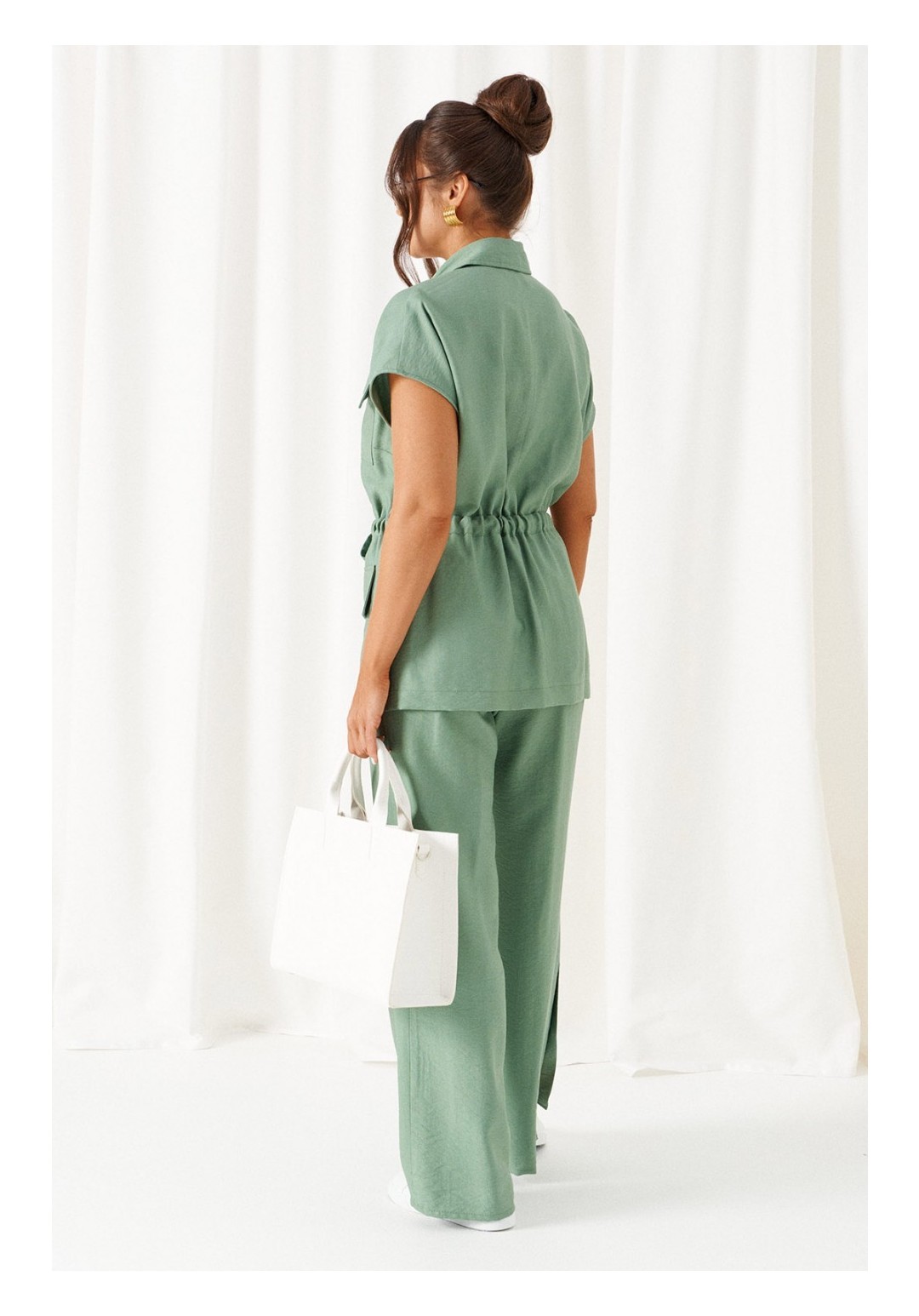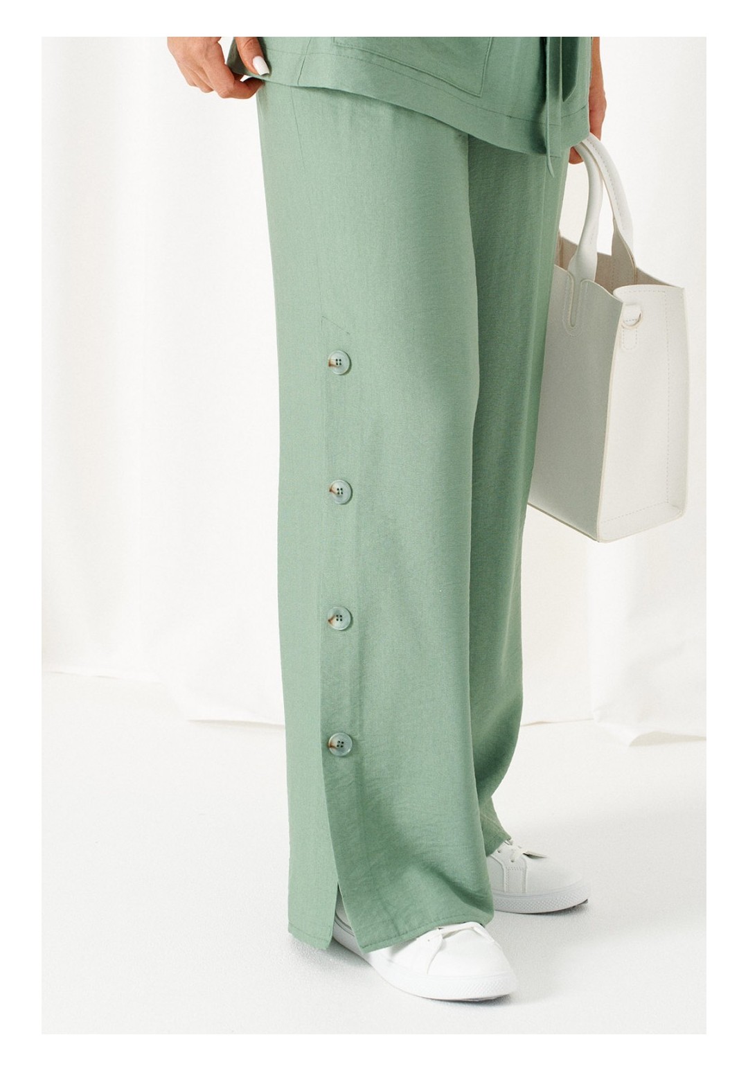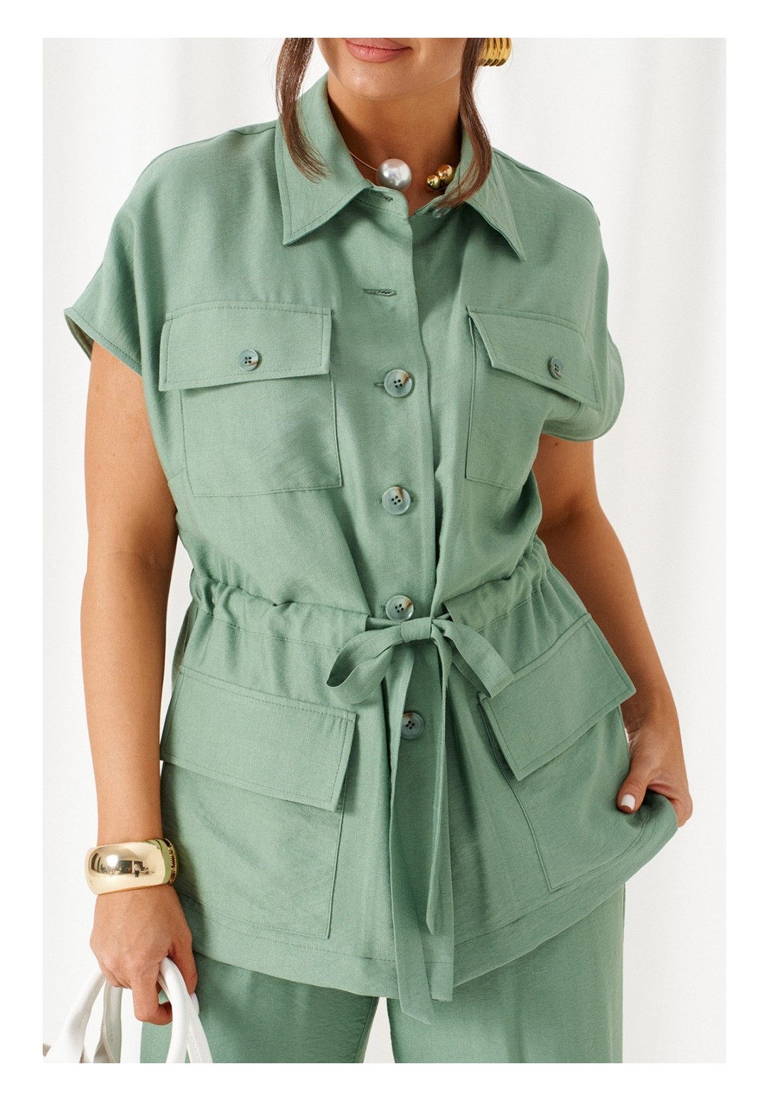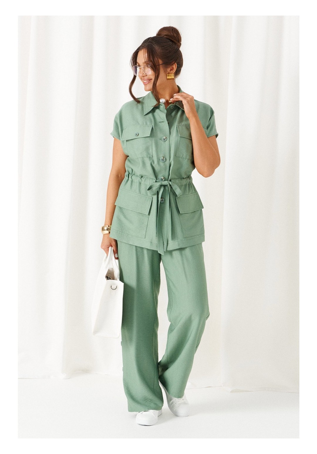 Женский льняной костюм из смесовой ткани с натуральным составом, акцентные накладные карманы и безупречные любимые оттенки. Созданный в расслабленном крое с подчеркнутыми деталями, костюм позволит чувствовать себя комфортно и непринужденно. Стильный костюм состоит из жакета-рубашки и брюк, выполнен из мягкой ткани с волокнами льна и вискозы, практичен в носке. Жакет свободного силуэта, удлиненный с кулисой и пояском-завязкой. Передняя часть из двух половинок, с нагрудными вытачками от бокового шва и накладными верхними и нижними функциональными карманами с клапанами. Спинка разрезная со средним швом. Воротник классический стояче-отложной на отрезной стойке. Линия плеча удлиненная, спущенная, переходящая в цельнокроеный рукав. Застежка центральная на петли и пуговицы. Низ прямой. Брюки длинные, прямые свободные. Посадка стандартная. В боковом шве на одной брючине ниже уровня колена выполнена шлица с закреплением на декоративные пуговицы, вторая брючина классического кроя. Пояс притачной, шириной 4см с эластичной тесьмой по кругу. длина жакета (по среднему шву спинки) - 72 см. длина брюк (по боковому шву с поясом) – 108 см.