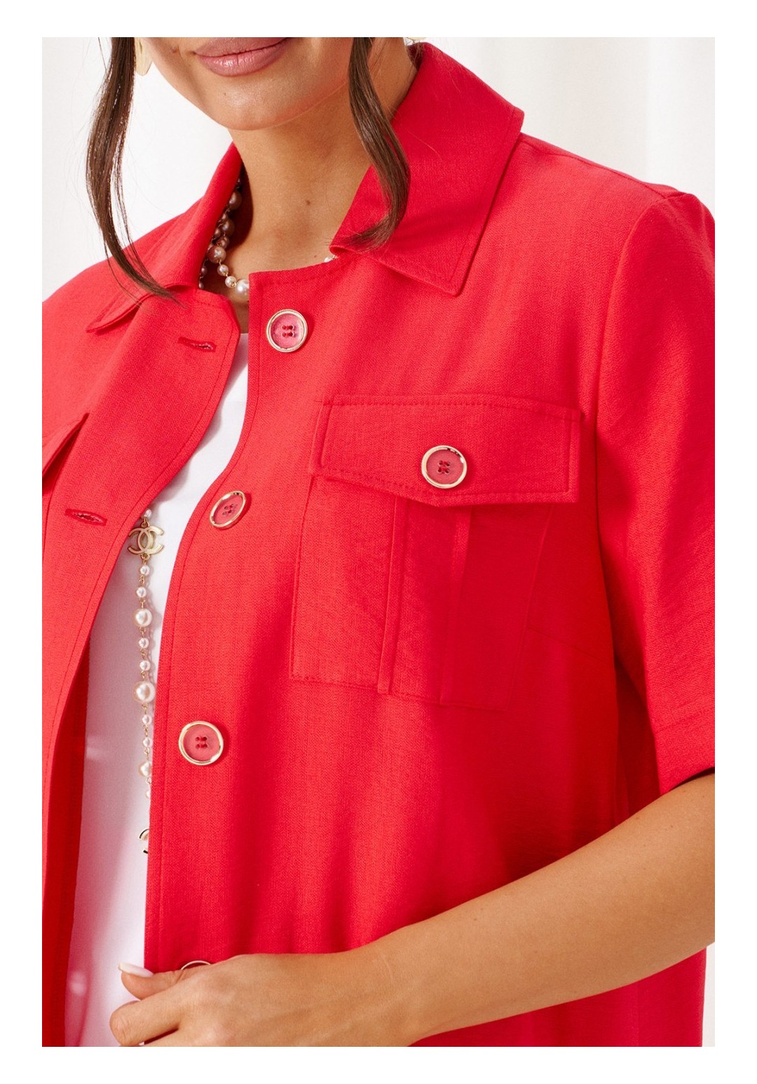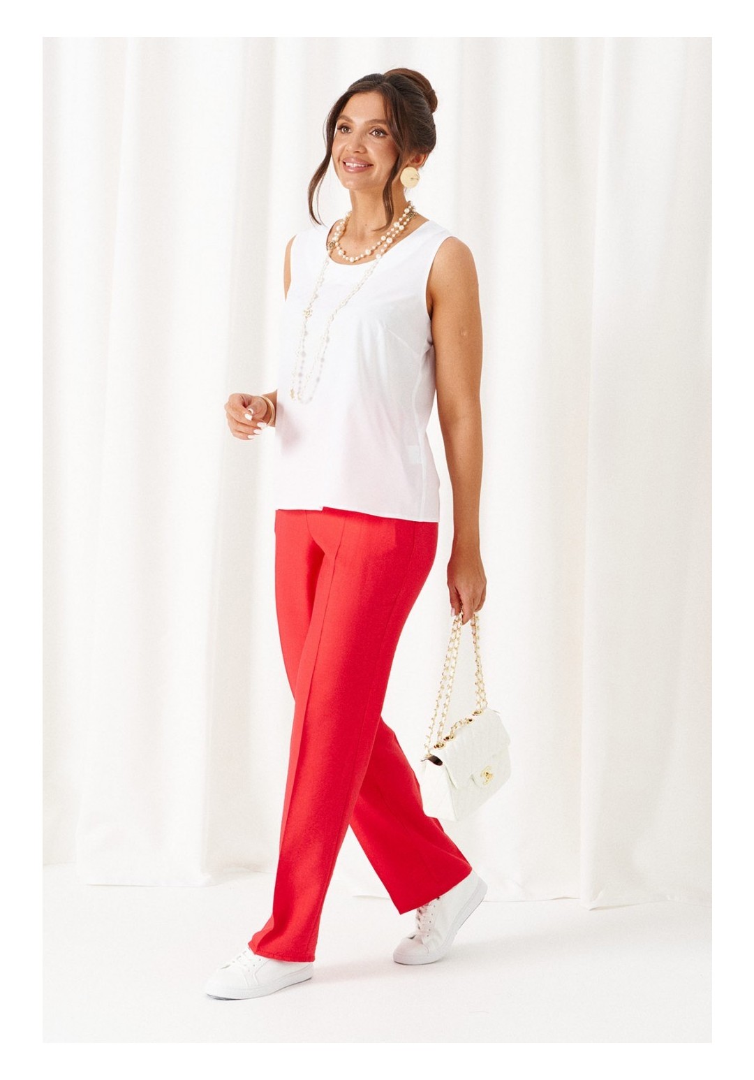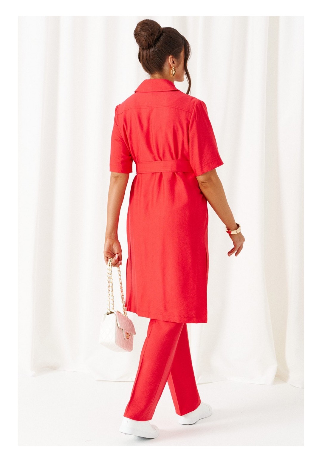 Универсальный комплект из блузки, брюк и топа – изделие вне времени и трендов, созданное в различных интерпретациях: от оверсайза до классики. Выполнен из смесового полотна с содержанием натуральных волокон – льна и вискозы, предназначен для повседневного и выходного использования. Найдет применение в жаркую и прохладную летнюю погоду. Блузка удлинённая, свободного силуэта. Передняя часть распашная с нагрудными вытачками от бокового шва. Вверху расположены функциональные накладные карманы с клапанами. Спинка с кокеткой в верхней части. Рукав одношовный втачной длиной до локтя, свободный. Воротник стояче-отложной на стойке. Застежка центральная на петли и пуговицы. Низ изделия ровный, в боковых швах предусмотрены высокие разрезы. Топ полуприлегающего силуэта. Перед цельный, с двумя нагрудными вытачками от бокового шва. Спинка со средним швом, оформленным у горловины разрезом с фиксацией на навесную петлю и пуговицу. Горловина округлой формы. Брюки длинные, умеренной ширины. Посадка классическая. Спереди расположены боковые функциональные карманы. Застежка центральная на молнию и петлю с пуговицей на поясе. Пояс притачной, сзади на резинке, шириной 4см. Длина блузки (по середине спинки) ~ 100 см. Длина рукава блузки (от плечевой до низа) ~ 30 см. Длина топа (по среднему шву спинки) ~ 62 см. Длина брюк (по боковому шву с поясом) ~ 107 см.