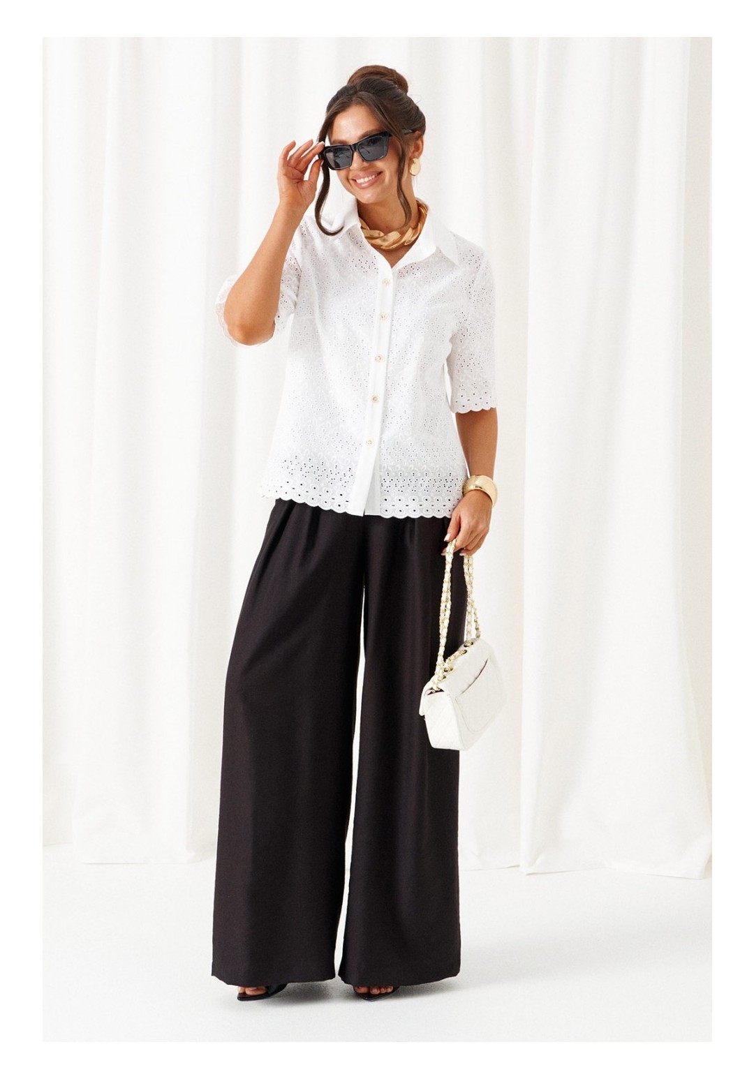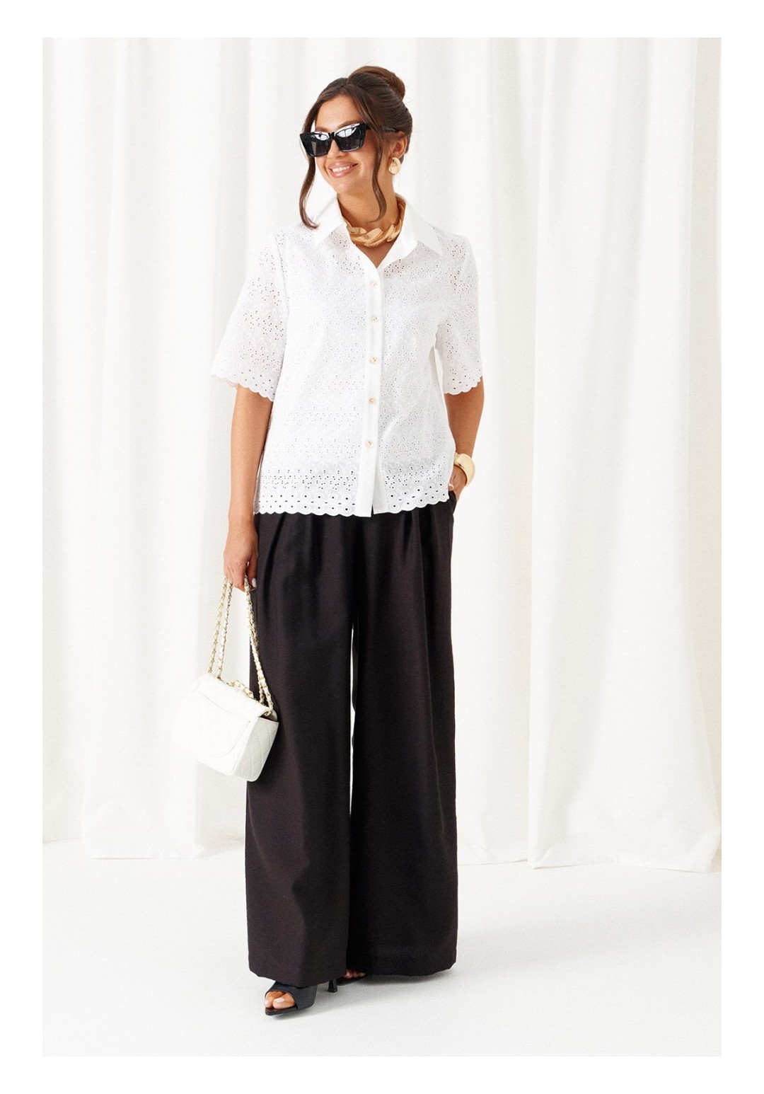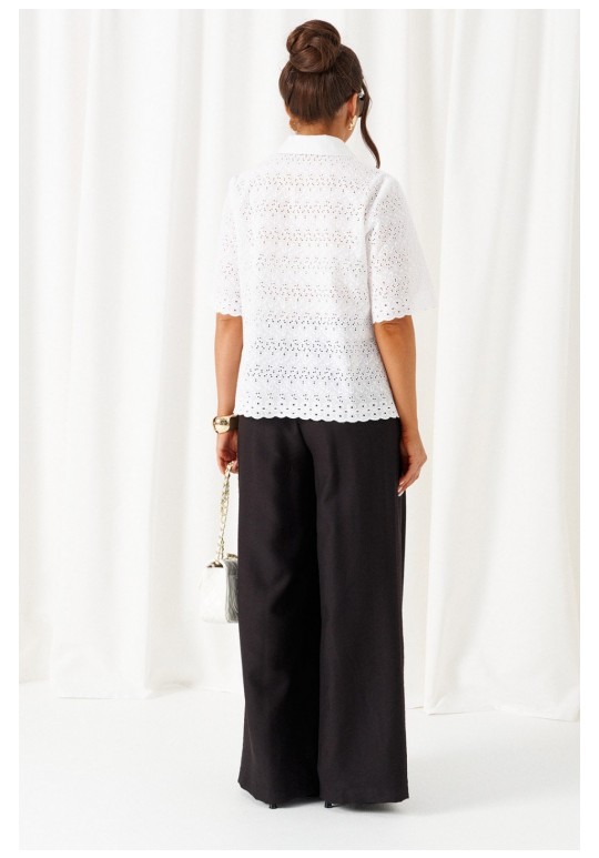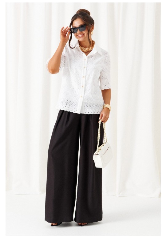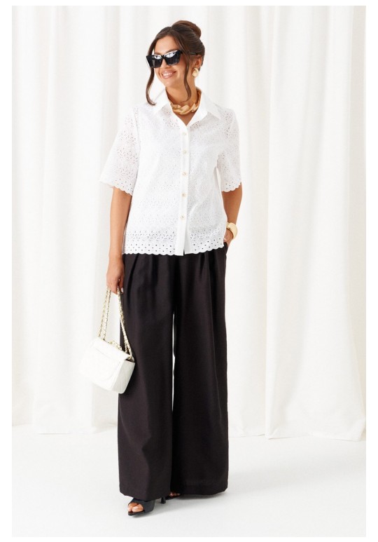 При выборе модели стоит обратить внимание на брючный комплект из нашей коллекции. Комплект с широкими брюками палаццо идеально подойдет для создания лаконичных офисных луков, а также для повседневного использования. Такие модели смотрятся необыкновенно женственно и эффектно. Предлагаемый комплект предназначен для повседневного использования, выполнен из смесовых тканей с добавлением натуральных волокон. Блузка свободного силуэта. Классический рубашечный стояче-отложной воротник. Передняя часть с нагрудными вытачками от бокового шва. Спинка цельная. Рукав короткий, одношовный, втачной. Застежка центральная на притачной планке на петли и пуговицы. Низа блузки и рукавов ровный. Планка блузки выполнена из однотонной ткани соответствующего цвета. Перед блузки на хлопковой подкладке. Брюки палаццо - акцент комплекта. Широкие с карманами в верхней части бокового шва и глубокими складками по переду. Застежка центральная, классическая, на молнию и петлю с пуговицей на поясе. Пояс брюк притачной, с резинкой сзади, что придает изделию дополнительный комфорт при носке. длина блузки (по среднему шву спинки) – 61 см. длина рукава блузки - 31 см. длина брюк (по боковому шву с поясом) – 108 см.