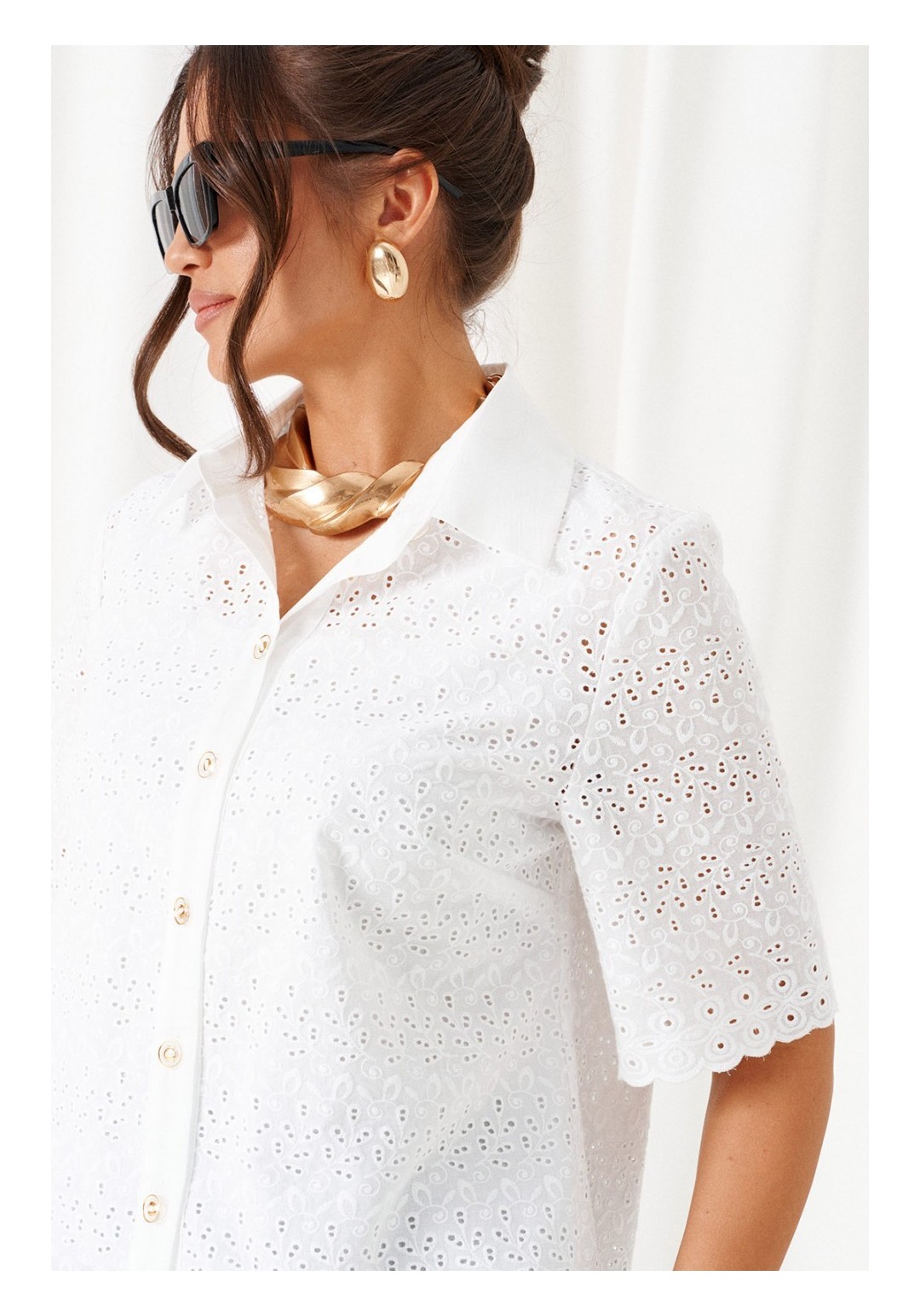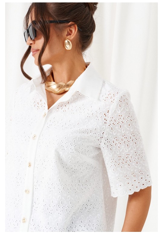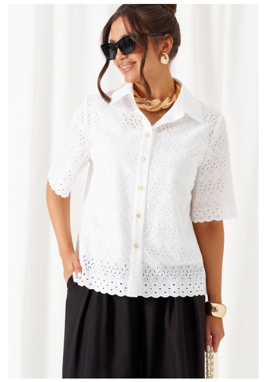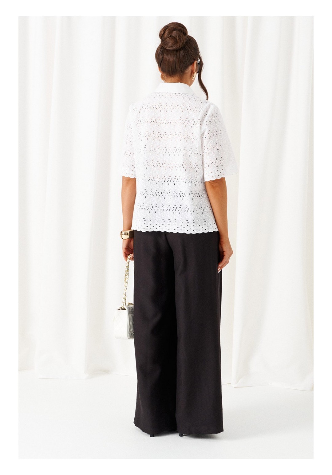 При выборе модели стоит обратить внимание на брючный комплект из нашей коллекции. Комплект с широкими брюками палаццо идеально подойдет для создания лаконичных офисных луков, а также для повседневного использования. Такие модели смотрятся необыкновенно женственно и эффектно. Предлагаемый комплект предназначен для повседневного использования, выполнен из смесовых тканей с добавлением натуральных волокон. Блузка свободного силуэта. Классический рубашечный стояче-отложной воротник. Передняя часть с нагрудными вытачками от бокового шва. Спинка цельная. Рукав короткий, одношовный, втачной. Застежка центральная на притачной планке на петли и пуговицы. Низа блузки и рукавов ровный. Планка блузки выполнена из однотонной ткани соответствующего цвета. Перед блузки на хлопковой подкладке. Брюки палаццо - акцент комплекта. Широкие с карманами в верхней части бокового шва и глубокими складками по переду. Застежка центральная, классическая, на молнию и петлю с пуговицей на поясе. Пояс брюк притачной, с резинкой сзади, что придает изделию дополнительный комфорт при носке. длина блузки (по среднему шву спинки) – 61 см. длина рукава блузки - 31 см. длина брюк (по боковому шву с поясом) – 108 см.