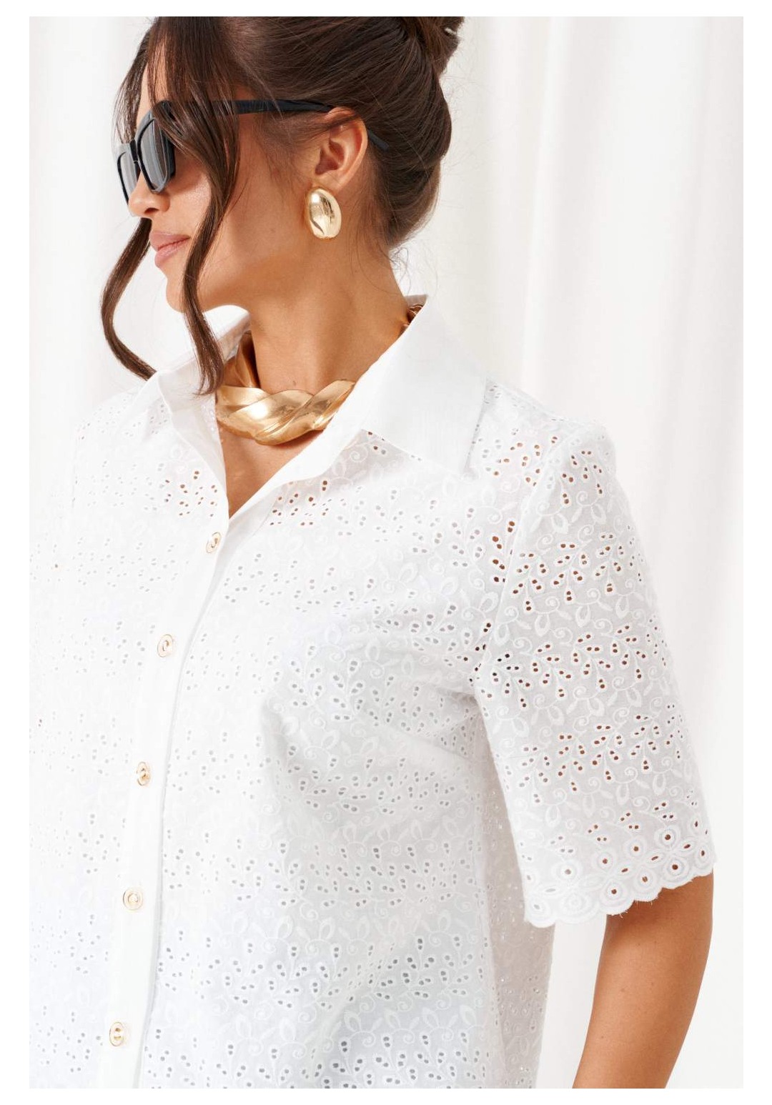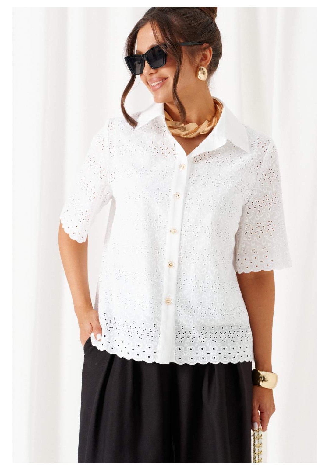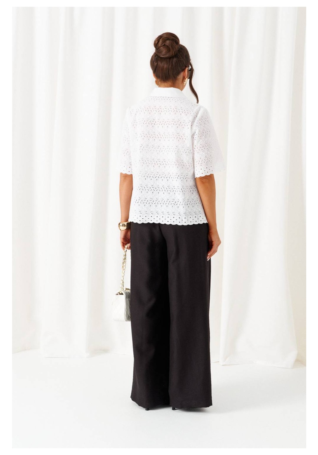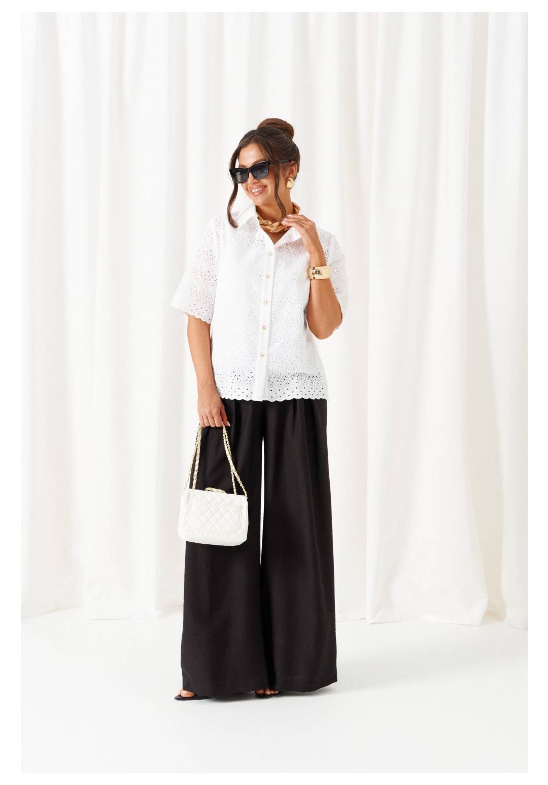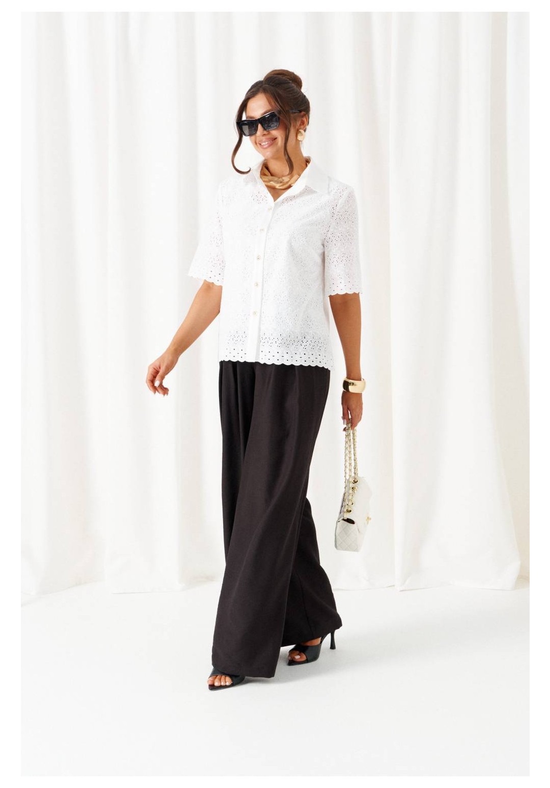 При выборе модели стоит обратить внимание на брючный комплект из нашей коллекции. Комплект с широкими брюками палаццо идеально подойдет для создания лаконичных офисных луков, а также для повседневного использования. Такие модели смотрятся необыкновенно женственно и эффектно. Предлагаемый комплект предназначен для повседневного использования, выполнен из смесовых тканей с добавлением натуральных волокон. Блузка свободного силуэта. Классический рубашечный стояче-отложной воротник. Передняя часть с нагрудными вытачками от бокового шва. Спинка цельная. Рукав короткий, одношовный, втачной. Застежка центральная на притачной планке на петли и пуговицы. Низа блузки и рукавов ровный. Планка блузки выполнена из однотонной ткани соответствующего цвета. Перед блузки на хлопковой подкладке. Брюки палаццо - акцент комплекта. Широкие с карманами в верхней части бокового шва и глубокими складками по переду. Застежка центральная, классическая, на молнию и петлю с пуговицей на поясе. Пояс брюк притачной, с резинкой сзади, что придает изделию дополнительный комфорт при носке. длина блузки (по среднему шву спинки) – 61 см. длина рукава блузки - 31 см. длина брюк (по боковому шву с поясом) – 108 см.