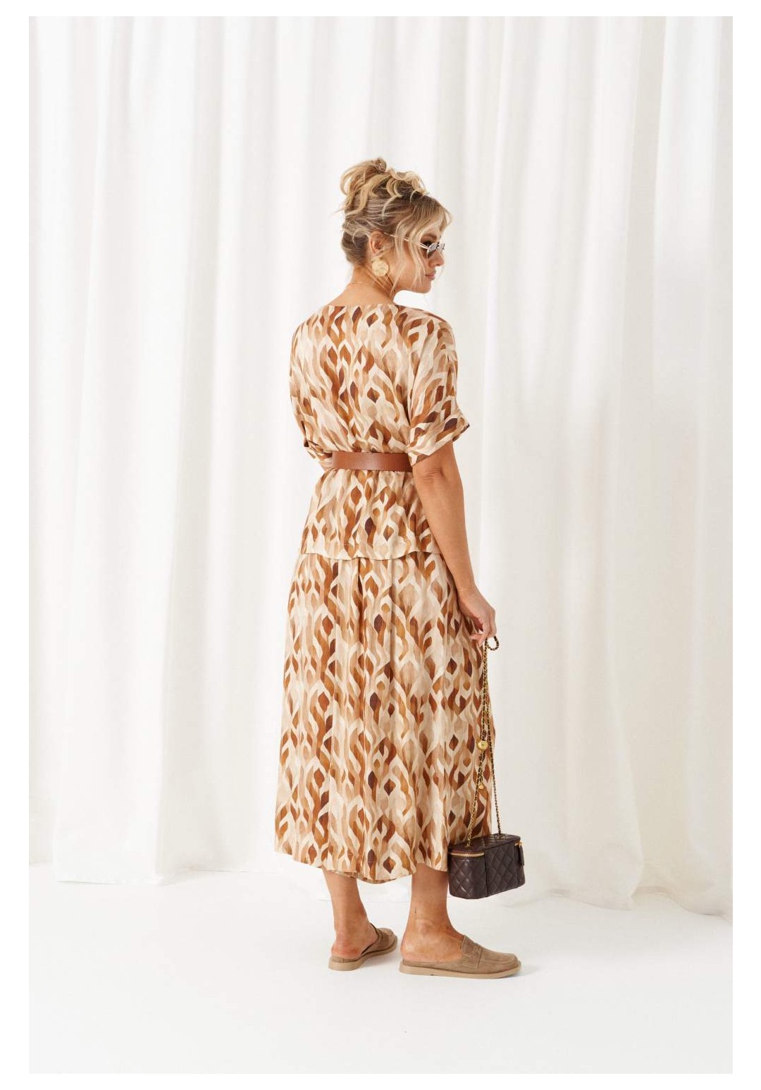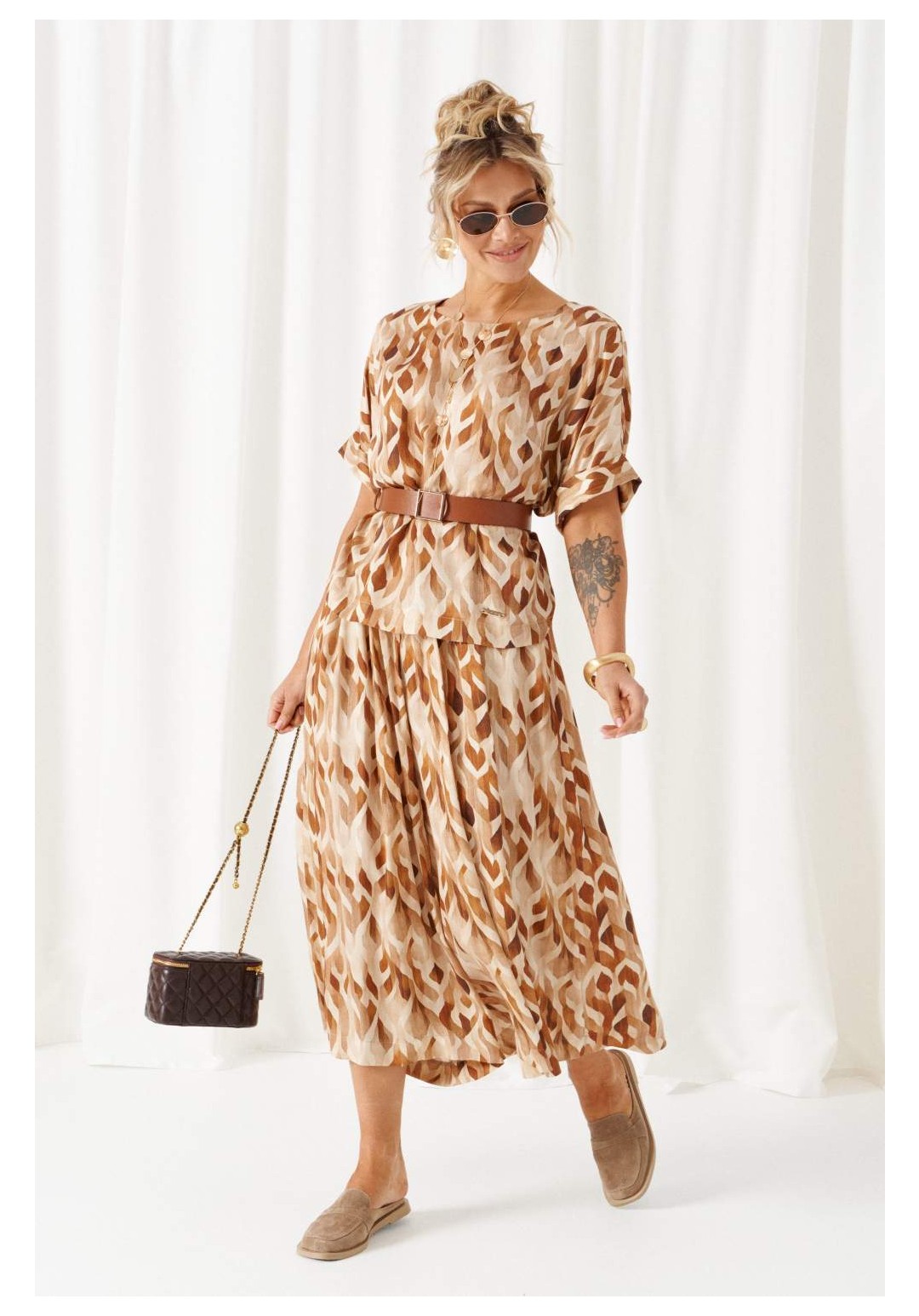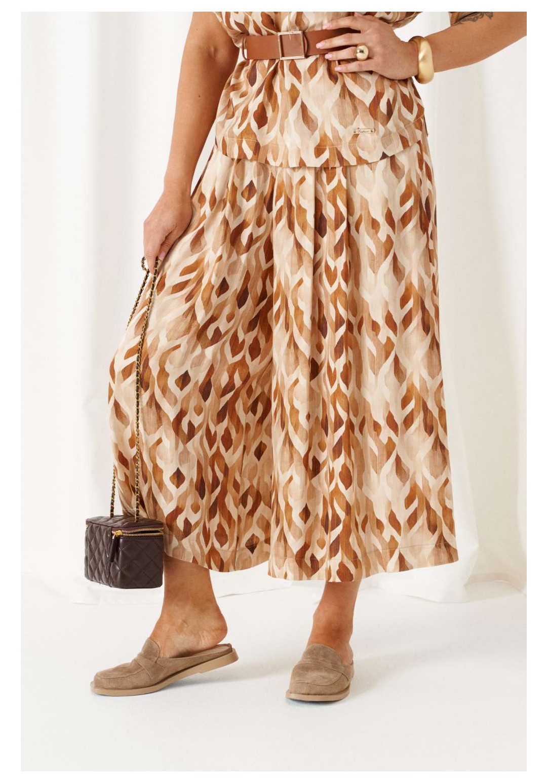 Женский легкий костюм из вискозной ткани, любимые и удобные юбка-брюки, свободная и непринужденная блуза. Созданный в расслабленном крое с подчеркнутыми деталями, костюм позволит чувствовать себя комфортно и уверенно. Стильный костюм состоит из блузы и брюк, выполнен из мягкой ткани с волокнами вискозы, практичен в носке. Дополнен декоративным поясом с пряжкой. Блуза полуприлегающего силуэта, длиной до бедра с удлиненной линией плеча. Передняя часть цельная, с нагрудными вытачками от бокового шва. Снизу слева расположен декоративный металлический элемент. Спинка из двух симметричных половинок. Рукав цельнокроеный короткий, спущенный, заканчивается притачной прямоугольной манжеткой. Вырез горловины округлой формы, обработан обтачкой. Низ прямой, в боковых швах внизу выполнены небольшие разрезы. Юбка-брюки длиной миди, свободные, трапециевидного силуэта. Передняя и задняя половинки с двумя заложенными складками от пояса. Посадка стандартная, в боковых швах выполнены карманы. Пояс притачной, шириной 4см с эластичной тесьмой по кругу. длина блузы (по среднему шву спинки) - 61,5 см. длина рукава (+плечо) блузы – 32 см. длина юбки-брюк (по боковому шву с поясом) – 87 см.