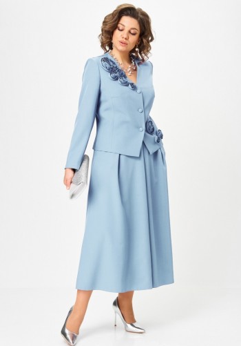 Есть вещи, которые незаметно становятся любимыми и остаются в гардеробе надолго. Комплект в романтическом стиле, состоящий из блузки и брюк, будет идеально сопровождать на любой выход. Блузка полуприлегающего силуэта выполнена из смесовой ткани с содержанием вискозной нити, дополнена несъемным пояском-завязками, которые регулируют прилегание по талии. Передняя часть симметричная, разрезная по центру и с вертикальными рельефами от плеча, спрятанными под тремя воланами разной ширины. Спинка цельная по середине и с двумя дополнительными вертикальными рельефами от плеча, в которые переходят воланы с переда. Вырез горловины V-образной формы. Брюки классические, свободные с боковыми подрезами, имитирующими карманы. Посадка стандартная. В задней части пояса для удобства использования вставлена резинка. Застежка центральная на молнию и петлю с пуговицей на поясе. Длина блузки (по середине спинки) – 63 см. Длина брюк (по боковому шву с поясом) – 108 см.