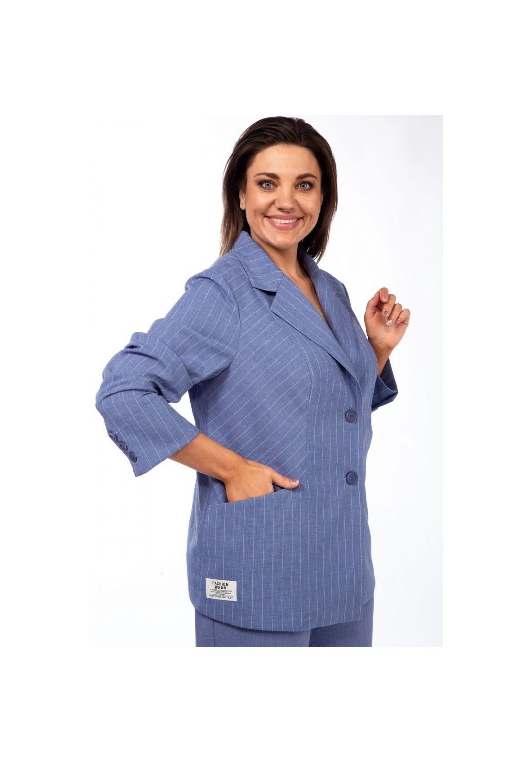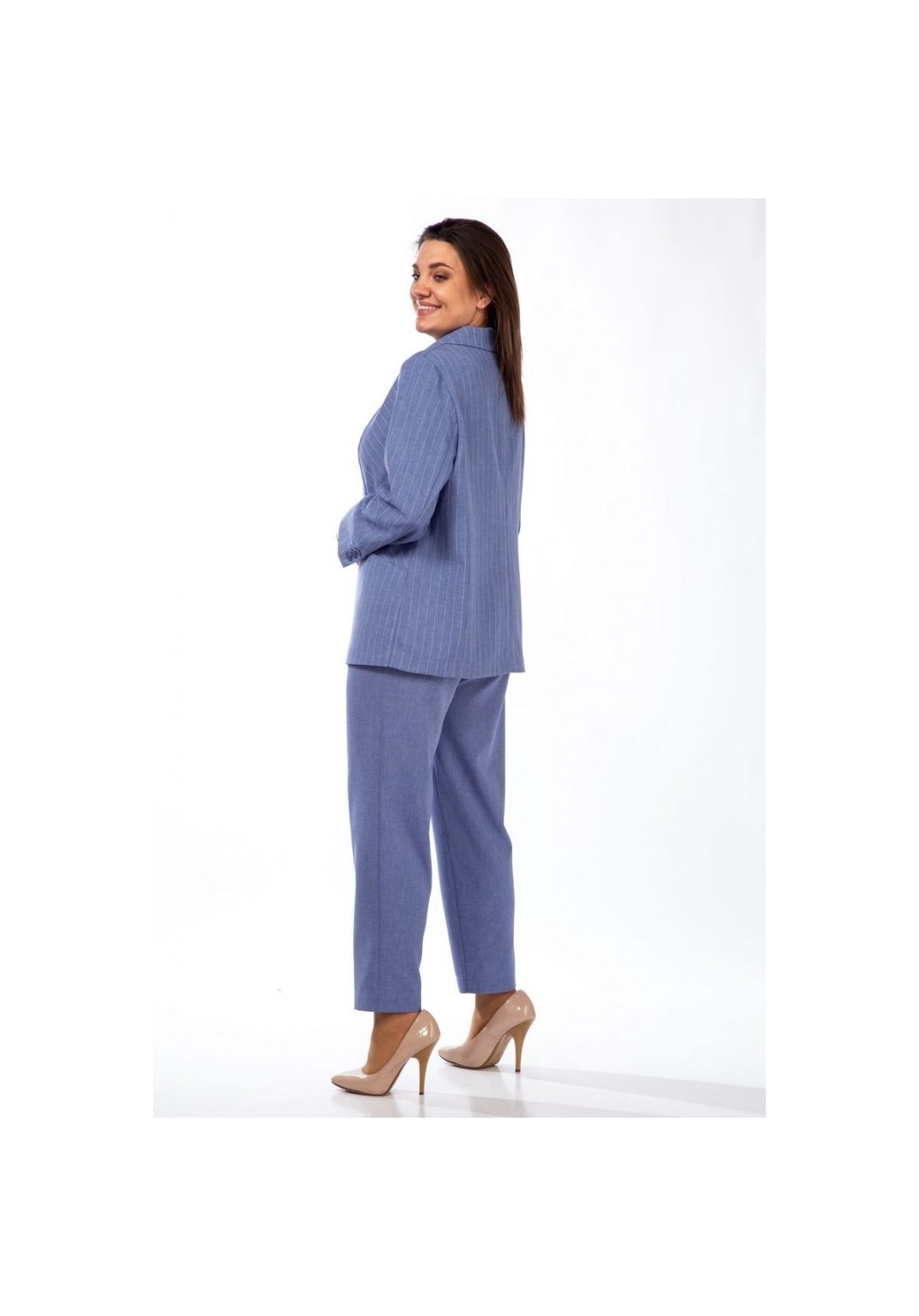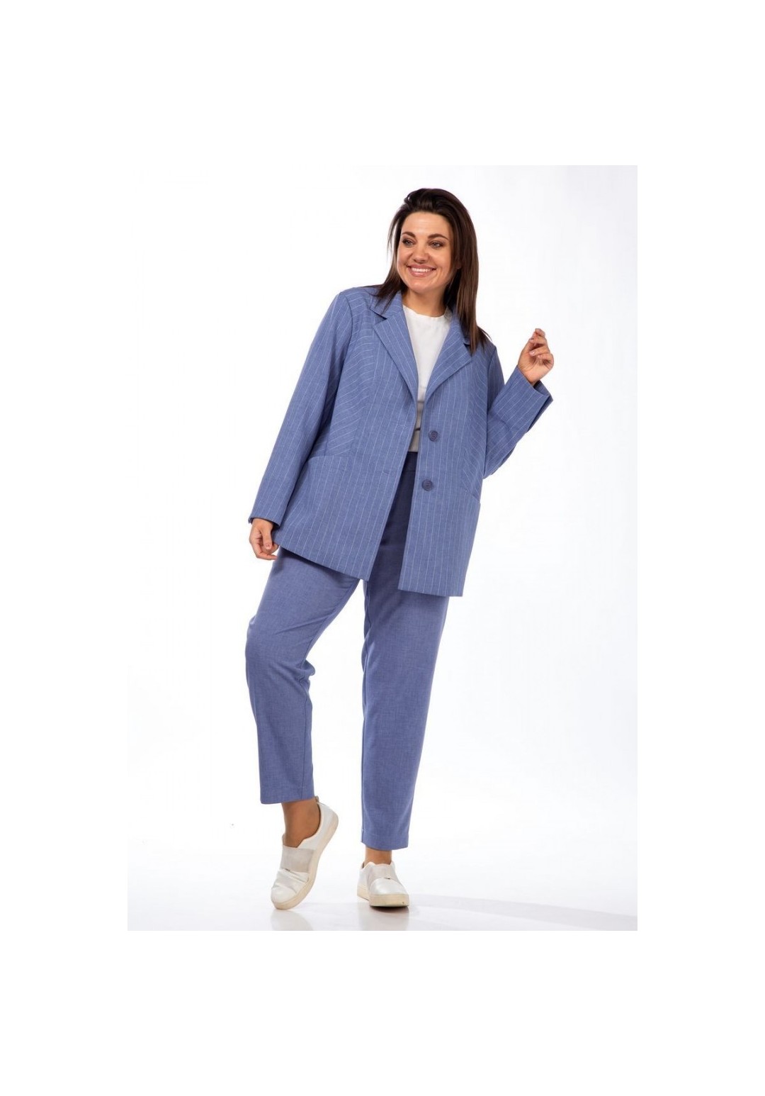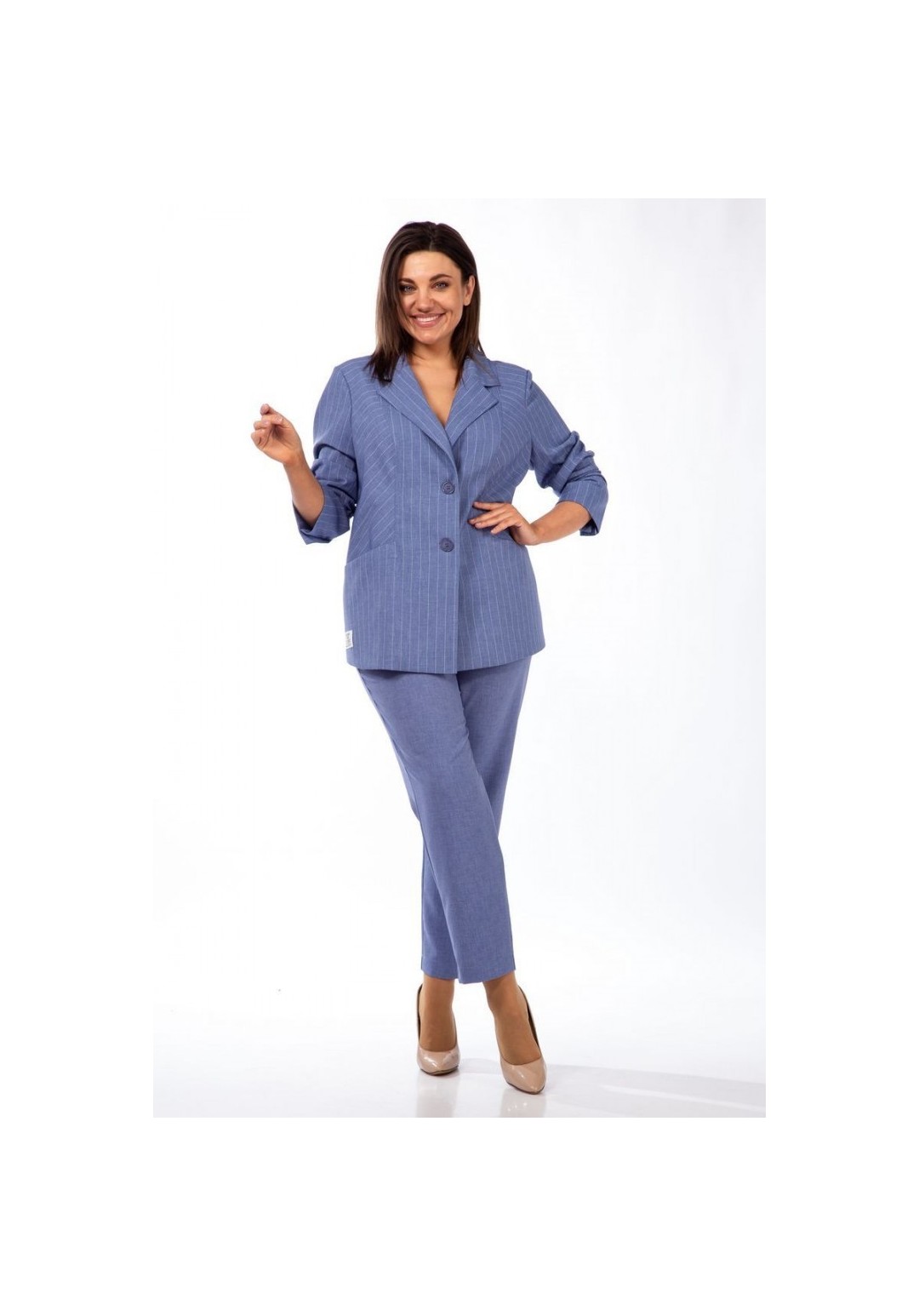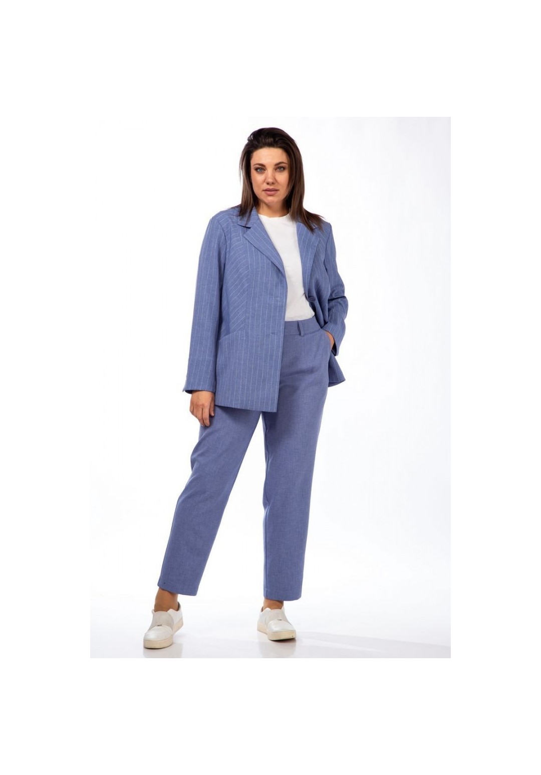 Жакет полуприлегающего силуэта с застёжкой на две петли и пуговицы. Спинка со средним швом. Перед с отрезными бочками, в которых обработаны карманы. Рукав втачной двушовный со шлицей с петлями и пуговицами. Воротник стояче-отложной с лацканами. Брюки зауженные к низу с застёжкой на молнию спереди. ПЕредние и задние половинки с вытаччками.Карманы по бокам, пояс на резинке. Длина по спинке 128 см, длина рукава 39 см.
