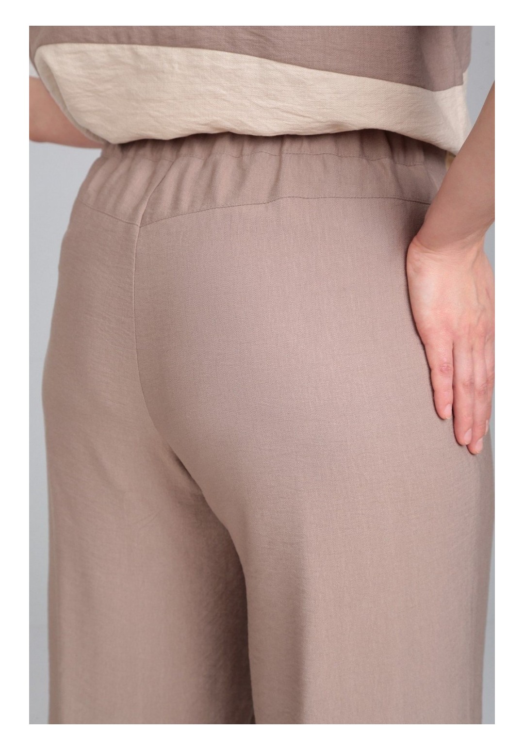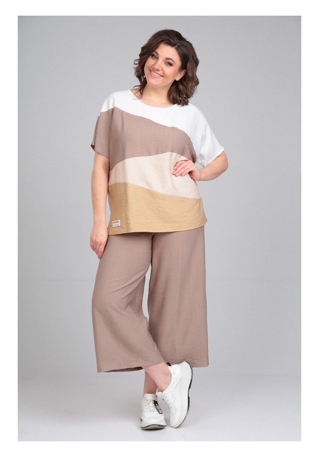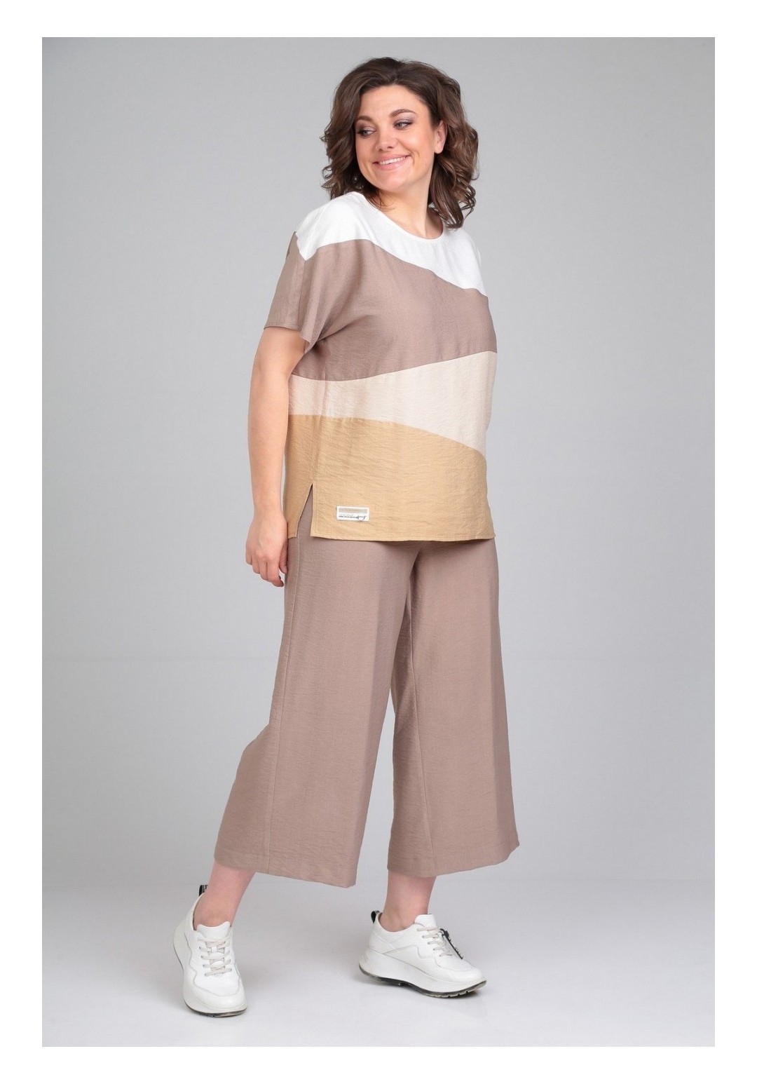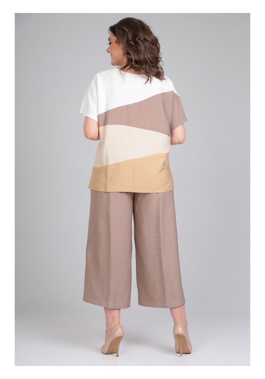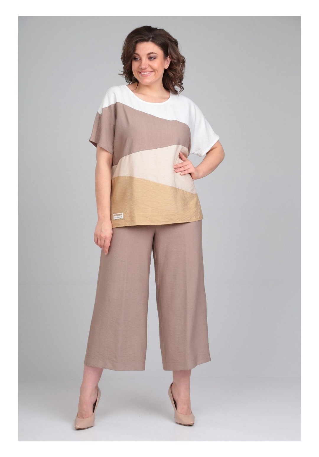 Комплект брючный: блуза+кюлоты. Блуза выполнена из 4-х цветов ткани. Перед и спинка с тремя волнообразными подрезами. Блуза с цельнокройным рукавом со спущенной линией плеча. В боковых швах обработаны разрезы.Брюки- кюлоты с застёжкой молния спереди. На кокетке сзади. Пояс притачной , сзади на резинке.