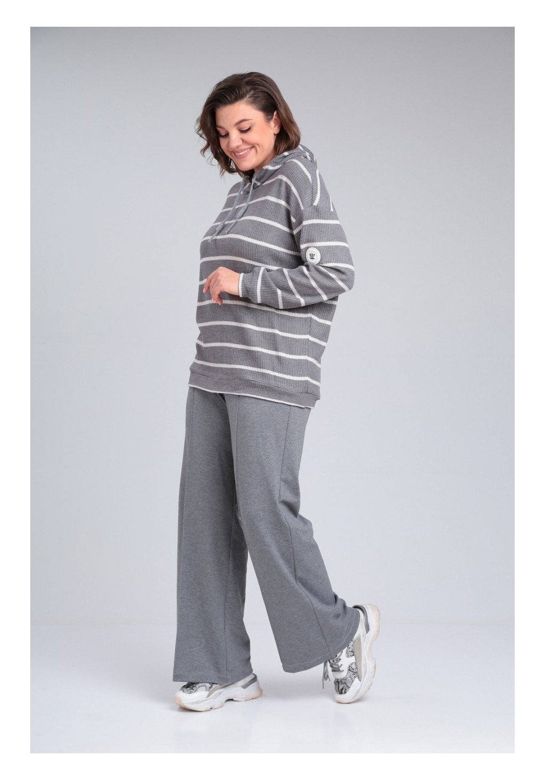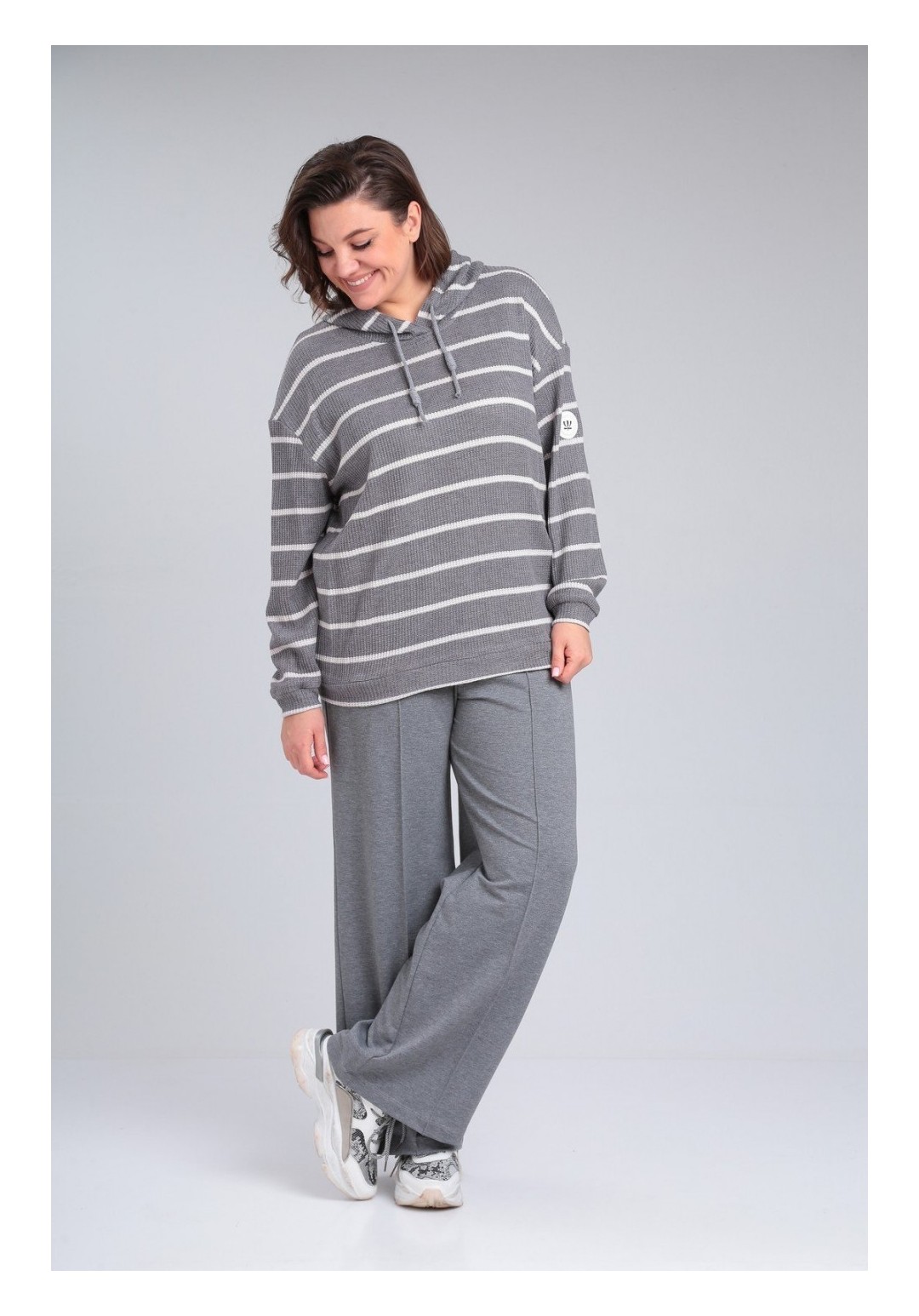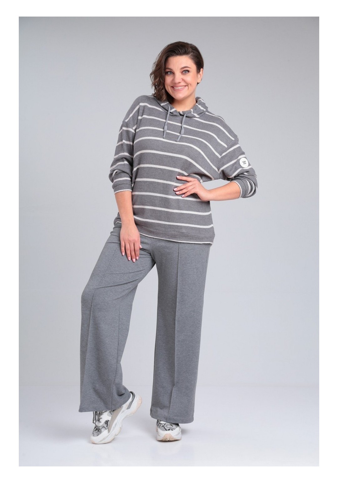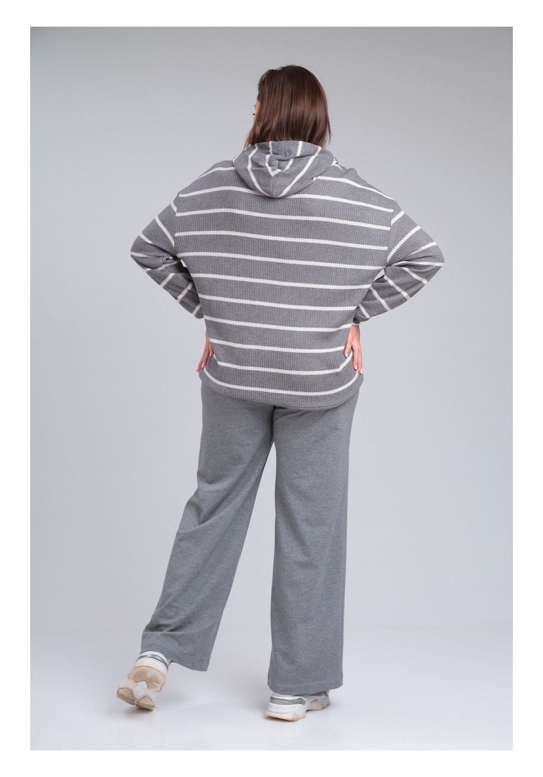 Комплект брючный:кофта +брюки.Кофта прямого силуэта с втачным рукавом. По низу рукава и кофты приталенные манжеты. Капюшон со средним швом, фиксируется шнурком. Брюки расширенные к низу. Пояс на резинке. На передних половинах застрочены стрелки.
