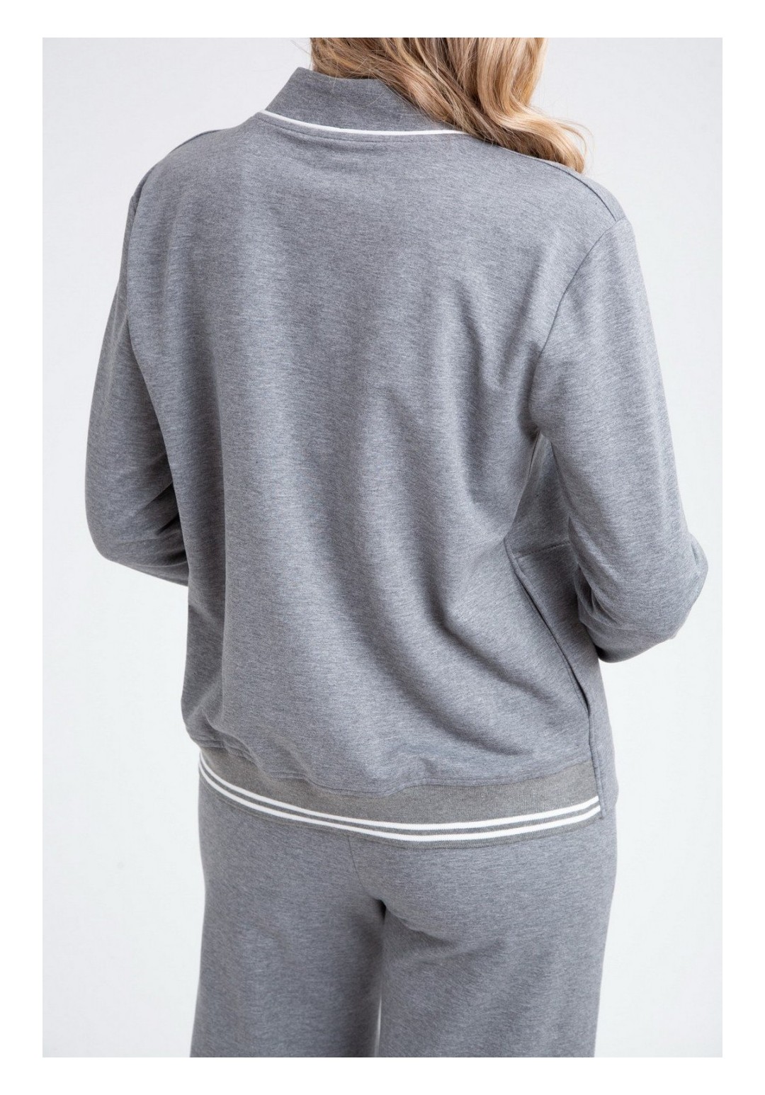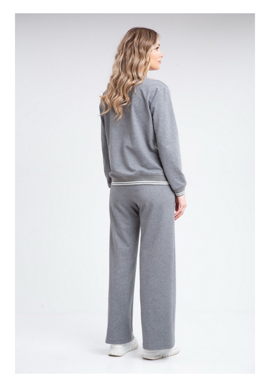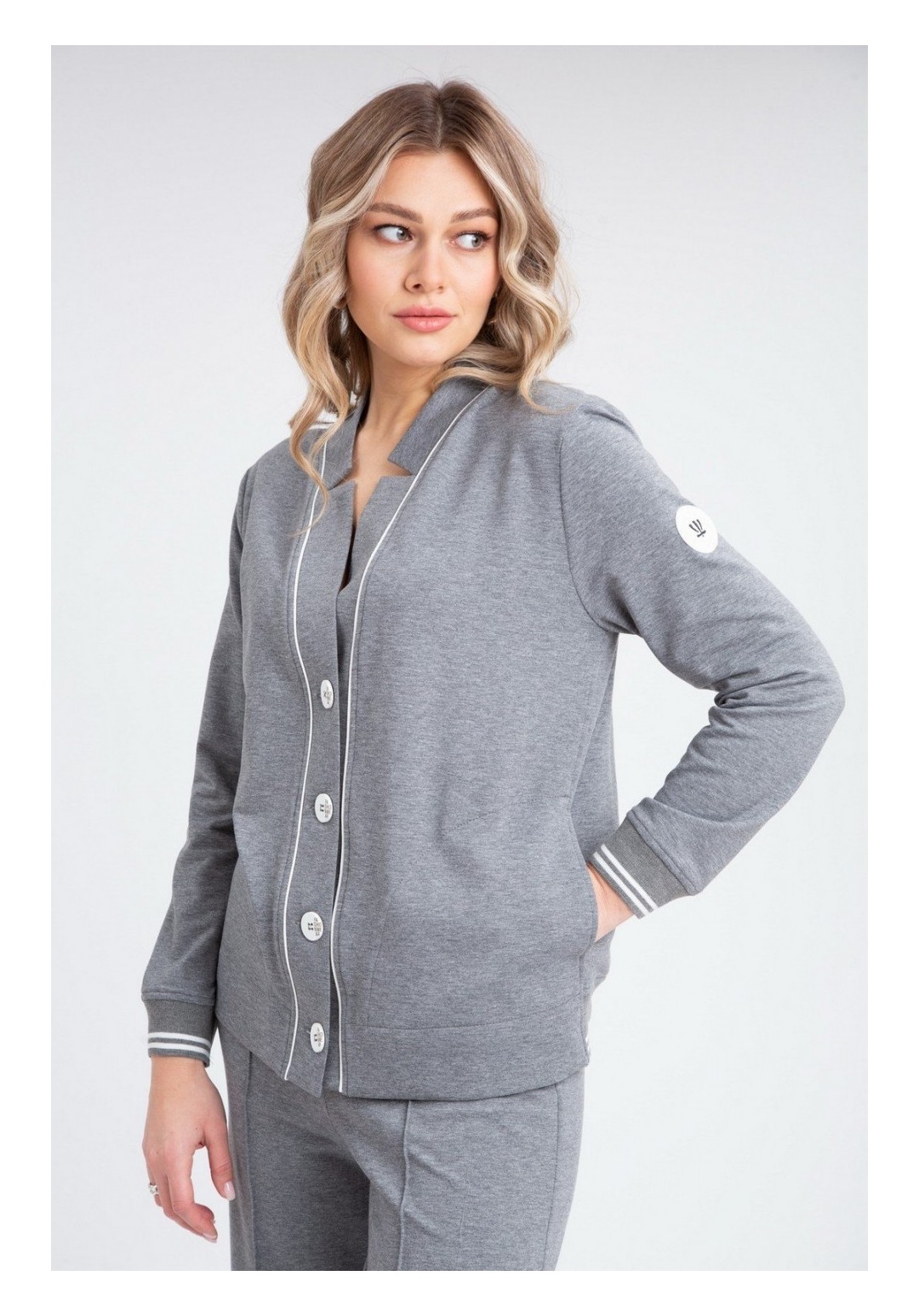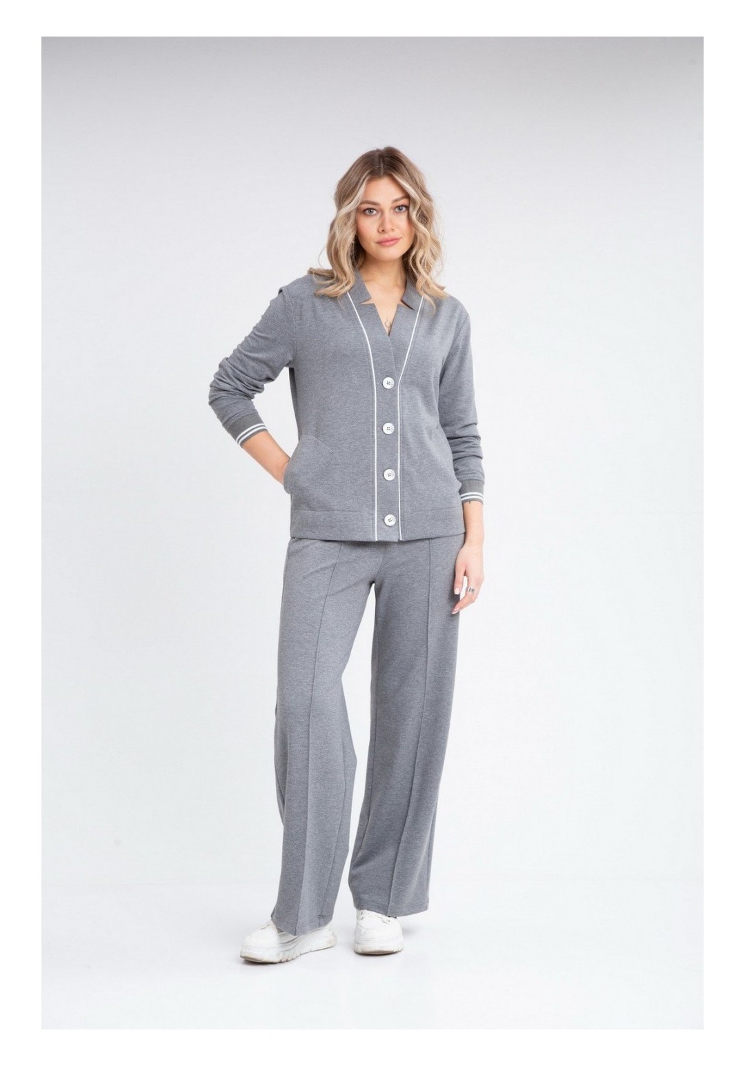 Комплект брючный:кардиган +брюки. Кардиган прямого силуэта с центральной застежкой на петли и пуговицы. Отрезная планка-зстежка. В боковых швах обработаны карманы. Рукав втачной одношовный с притачным манжетом по низу. В качестве отделки используется кант и фурнитура. Брюки прямые, верхний срез обработан поясом с резинкой, по переду застрочена стрелка. Длина по спинке 61-63 см. , длина рукава 60-61 см. Длина брюк 105 см.