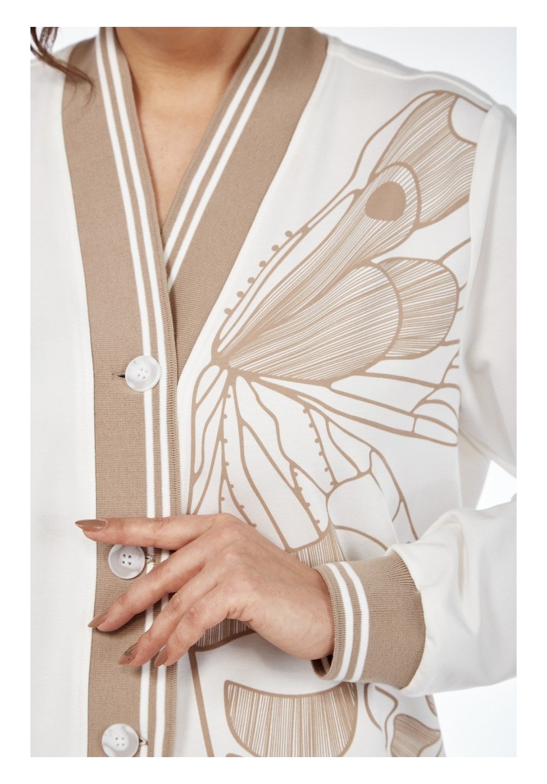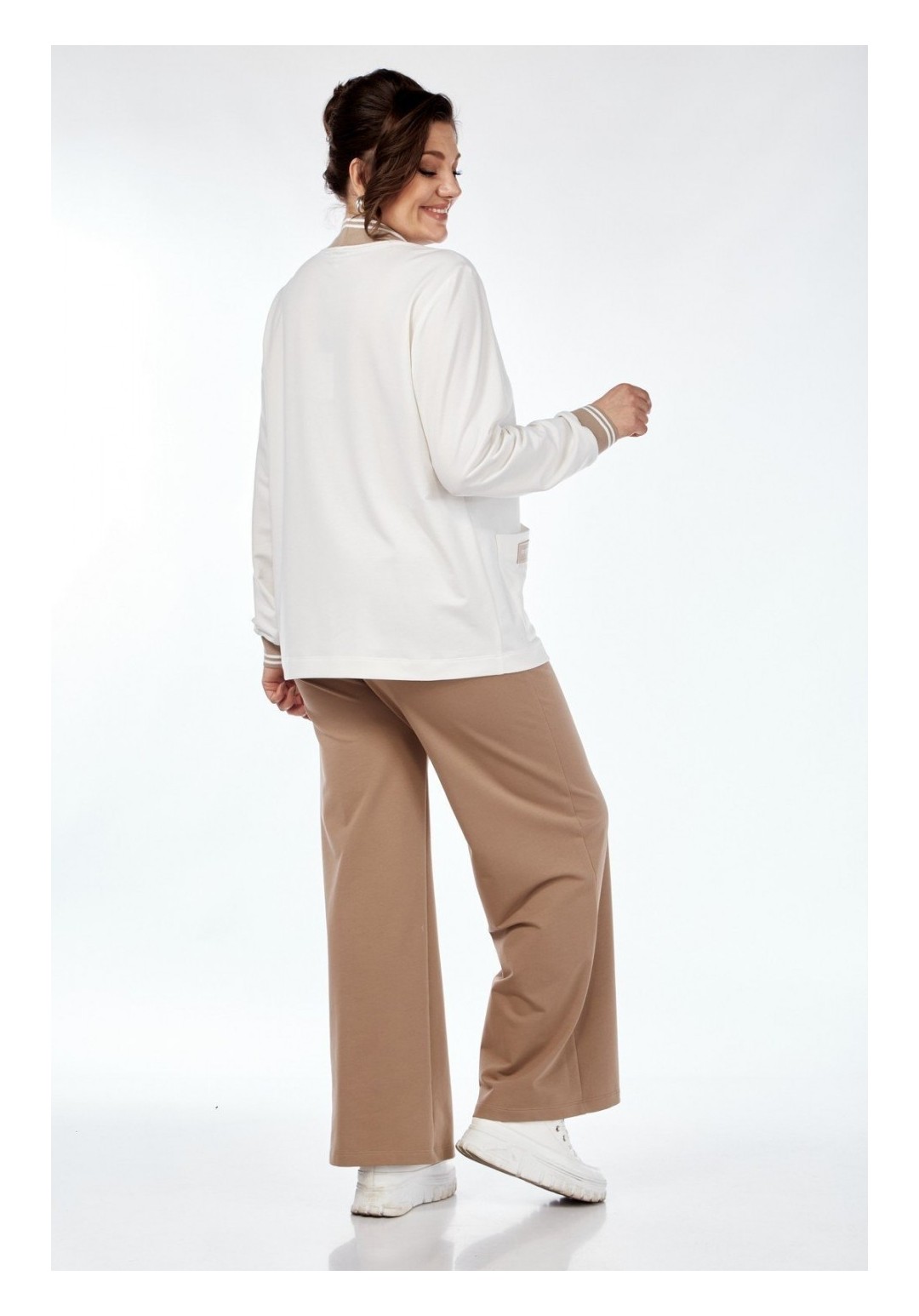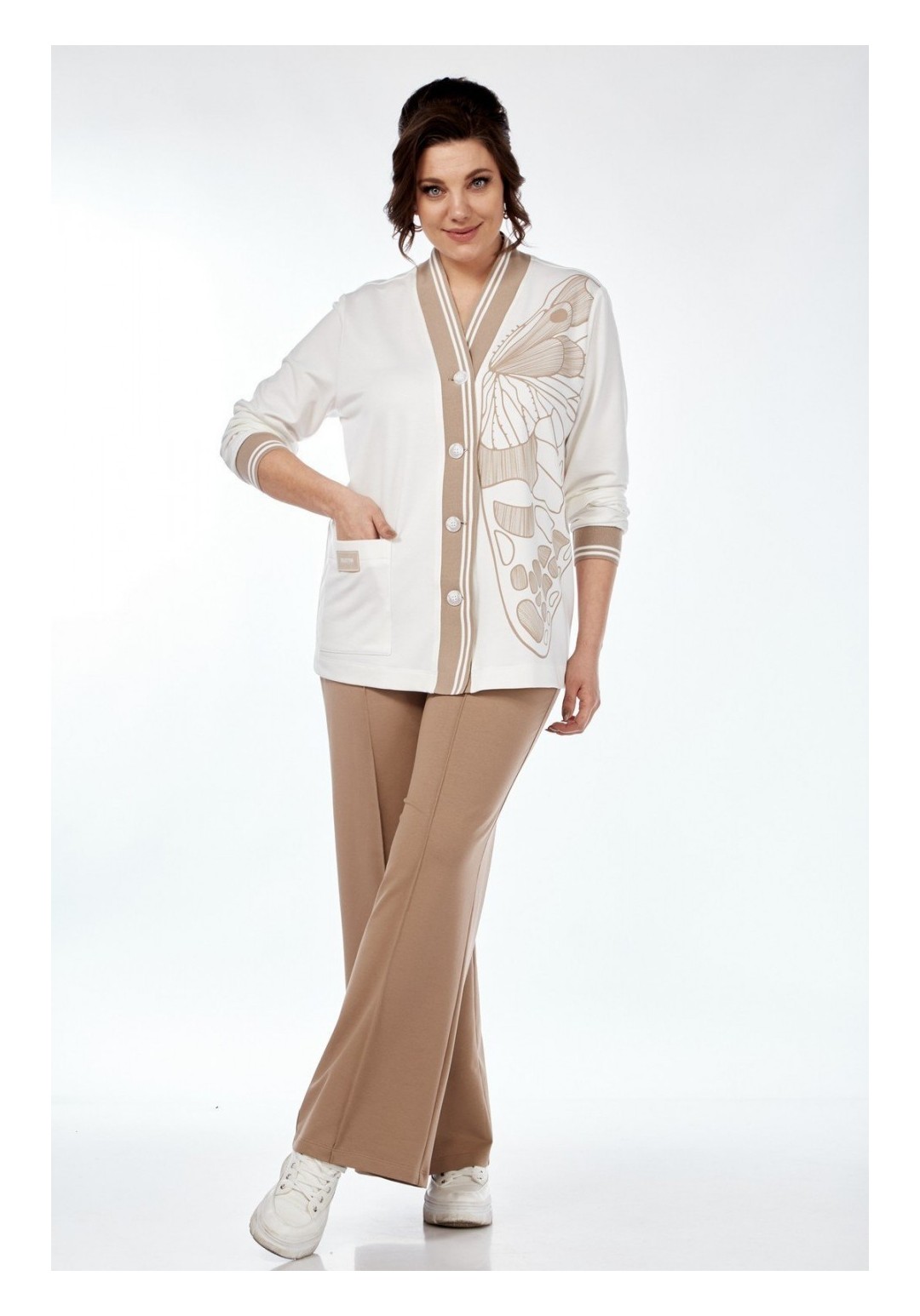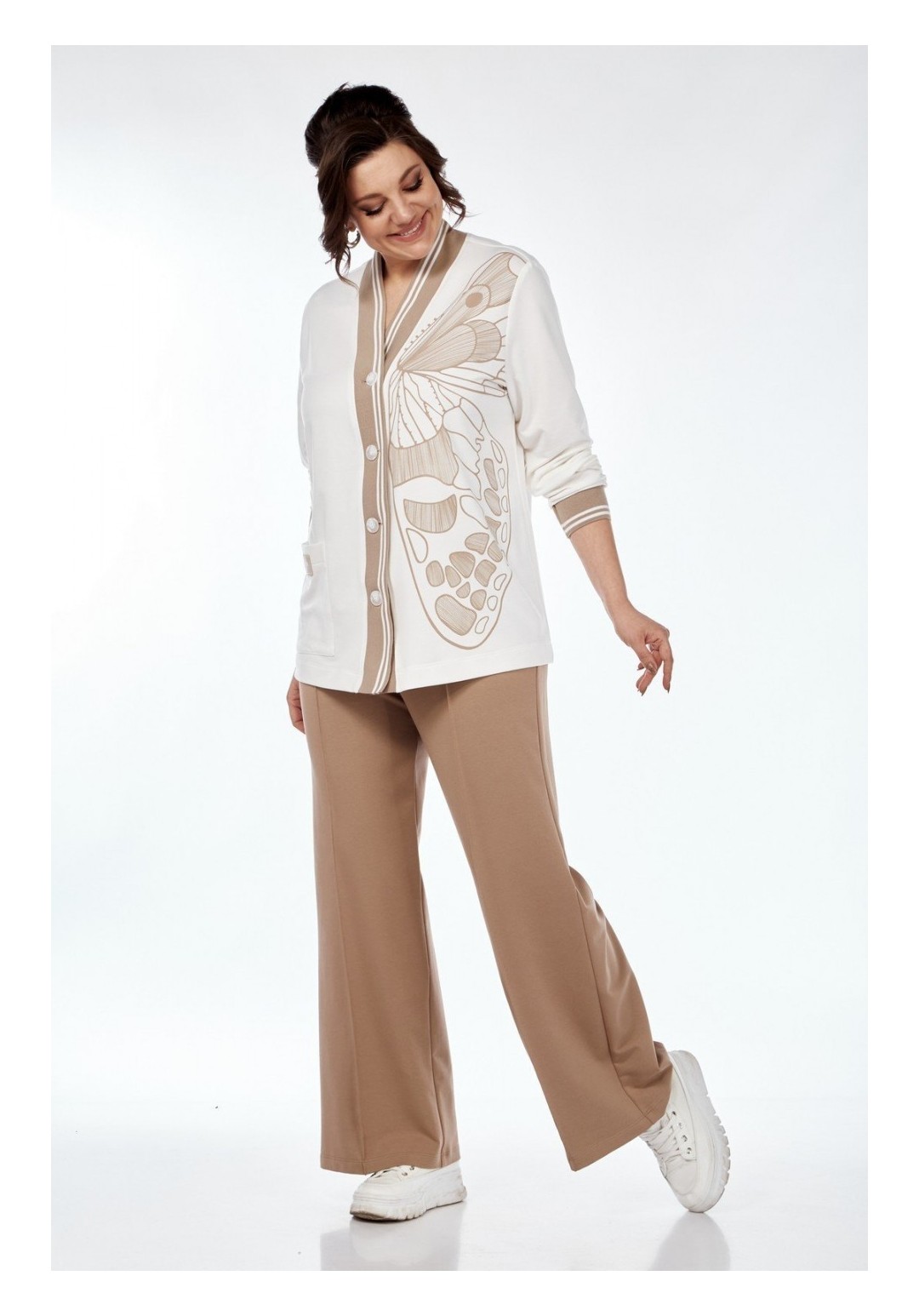 Комплект брючный из трикотажного полотна. Кардиган с центральной застежкой на 4 петли и пуговицы. Перед с накладным карманом на правой полочке и печатью в виде крыла бабочки на левой полочке. Рукав втачной одношовный с манжетом из довяза в полоску. По борту и горловине довяз в полоску. Брюки прямого силуэта с поясом на резинке. По передним половинам брюк отстрочена стрелка. Длина по спинке 68 см. , длина рукава 61 см. Длина брюк 106 см