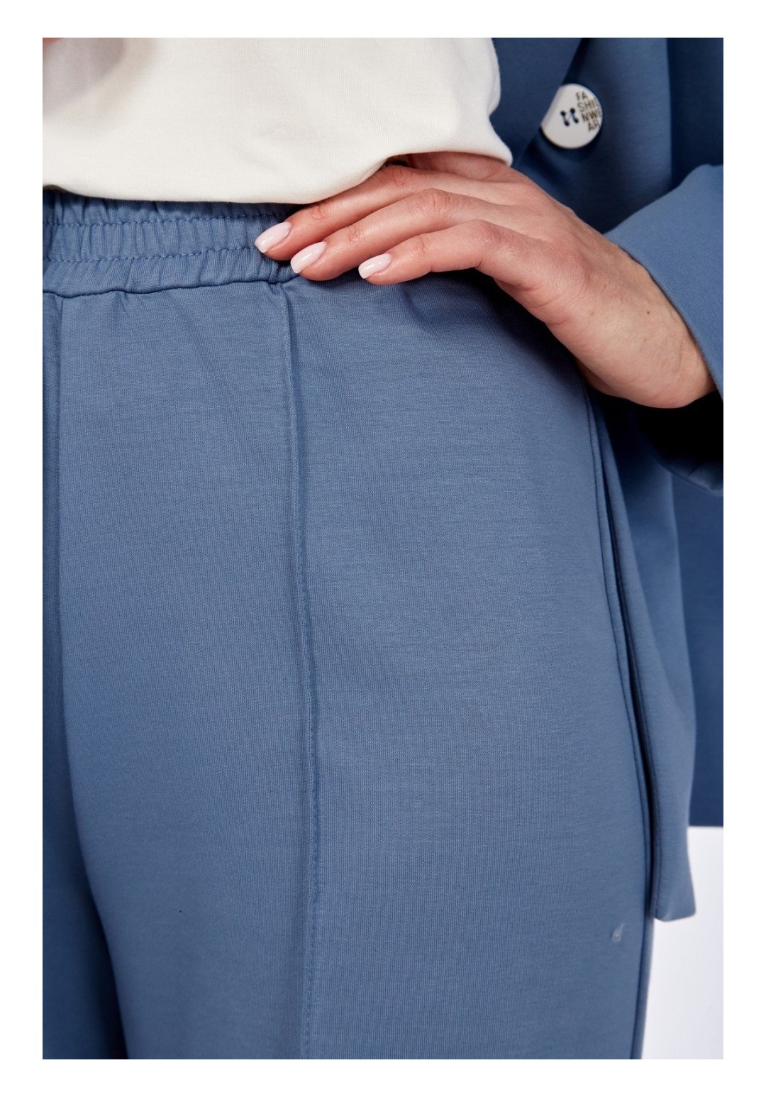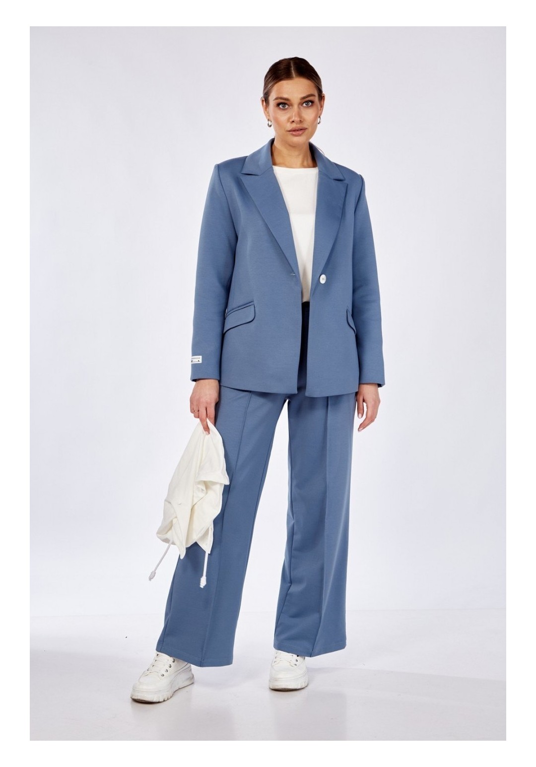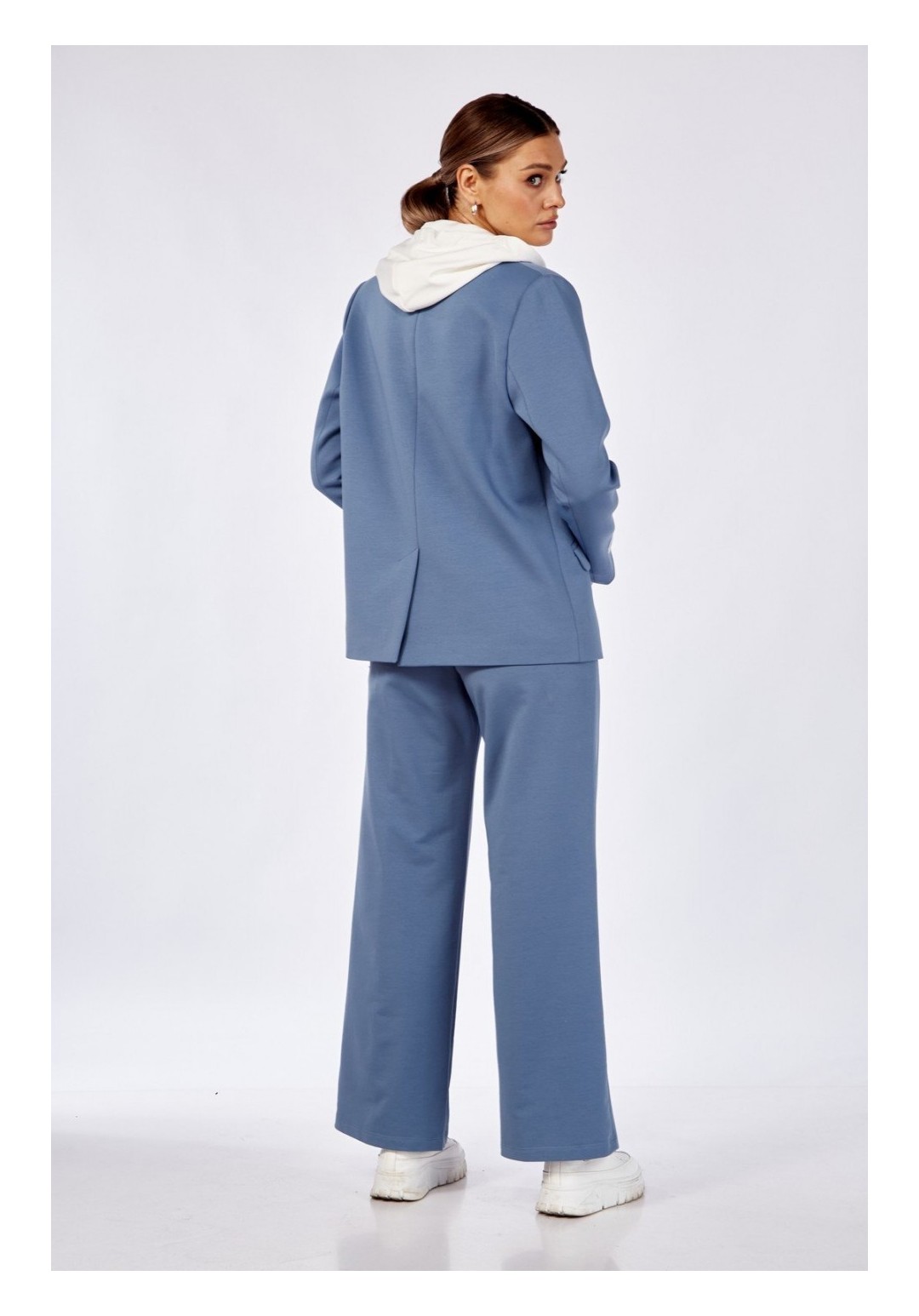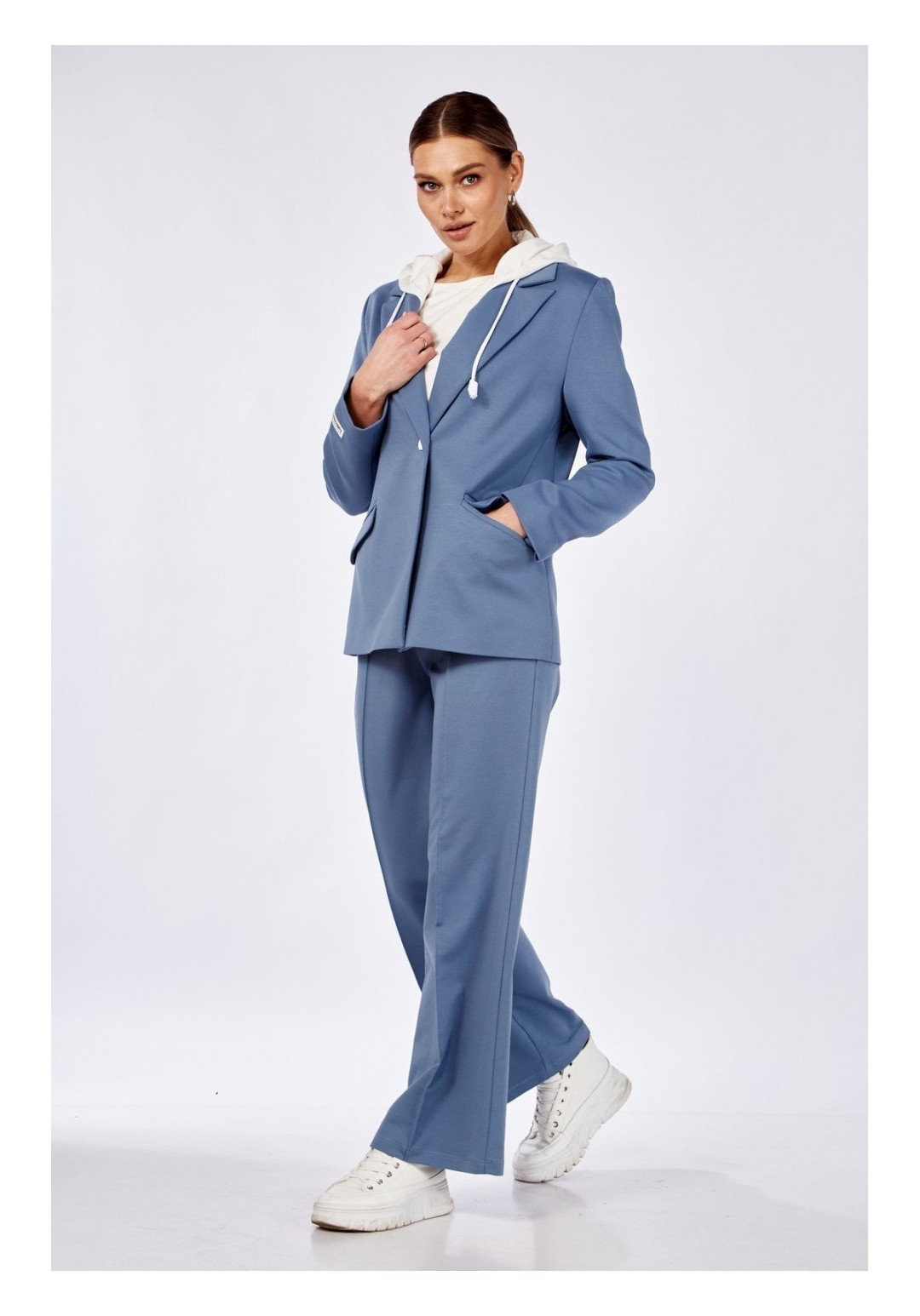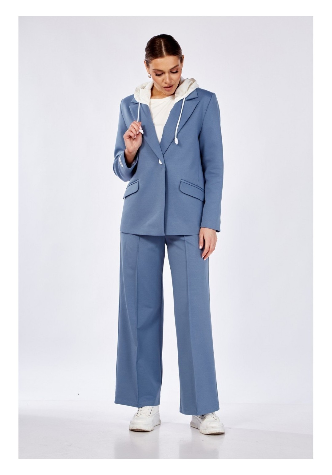 Комплект брючный:кофта +брюки+блузон. Жакет полуприлегающего силуэта с центральной застежкой на петлю и пуговицу. По спинке средний шов со шлицей, прорезные карманы с клапаном и обтачками. Рукав втачной. Воротник стояче-отложной с отрезной стойкой, лацканы с открытыми бртами. Капюшон съемный. Блузон полуприлегающего силуэта, рукав втачной одношовный, короткий. Брюки прямые, верхний срез обработан поясом с резинкой, по переду застрочены стрелки. В качестве отделки используется фурнитура. Длина жакета по спинке 68-70 см, длина рукава 63 см. Длина блузона по спинке 58-60 см, длина рукава 23 см.Длина брюк 105 см.