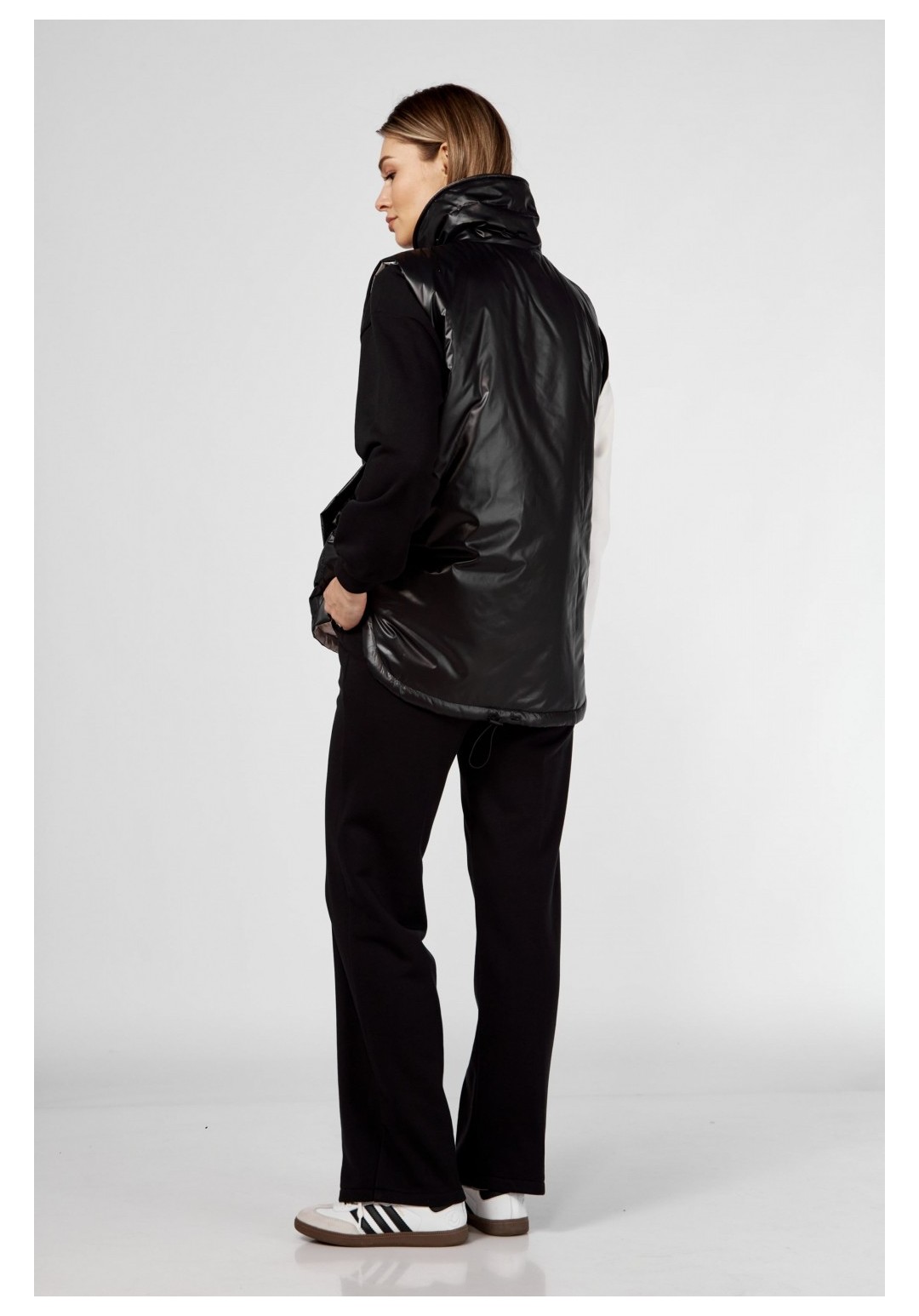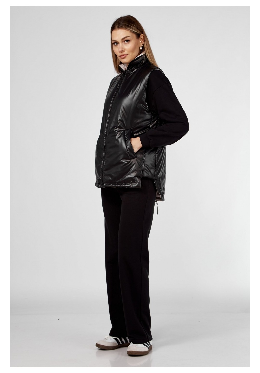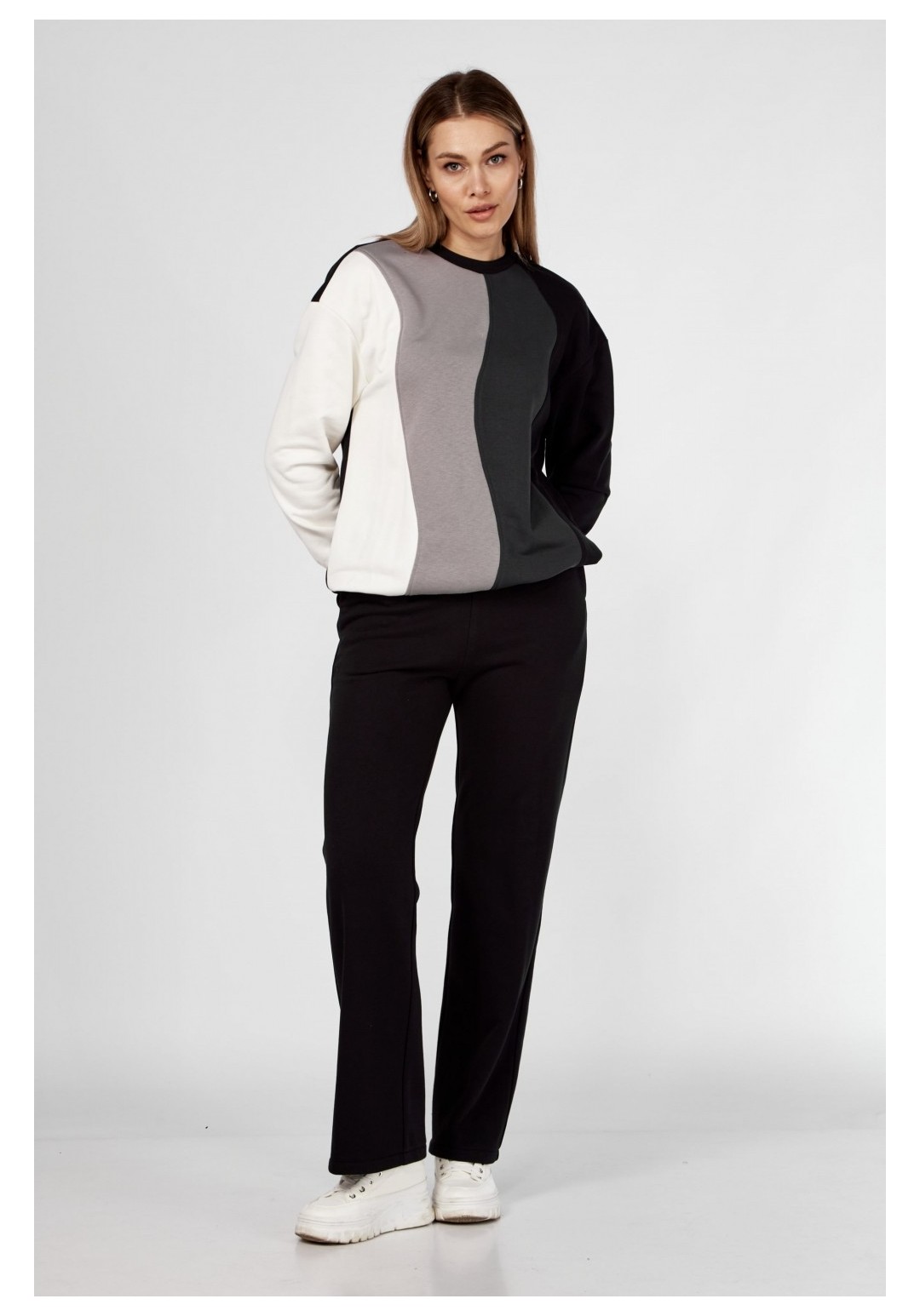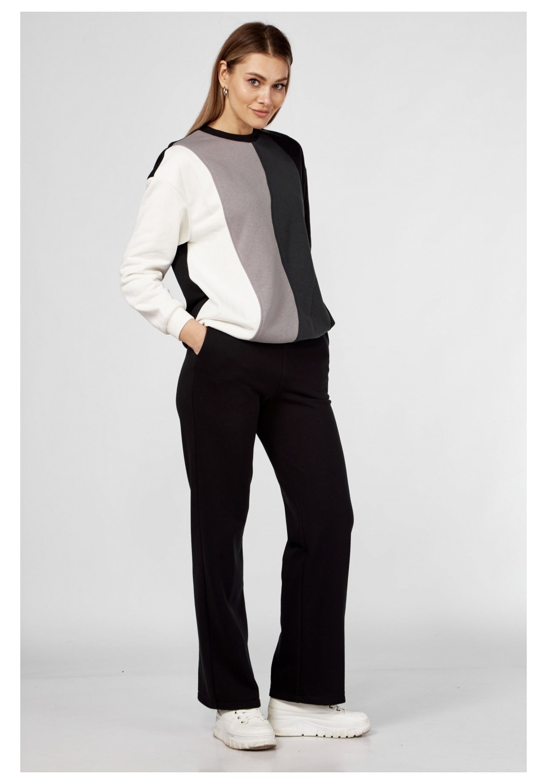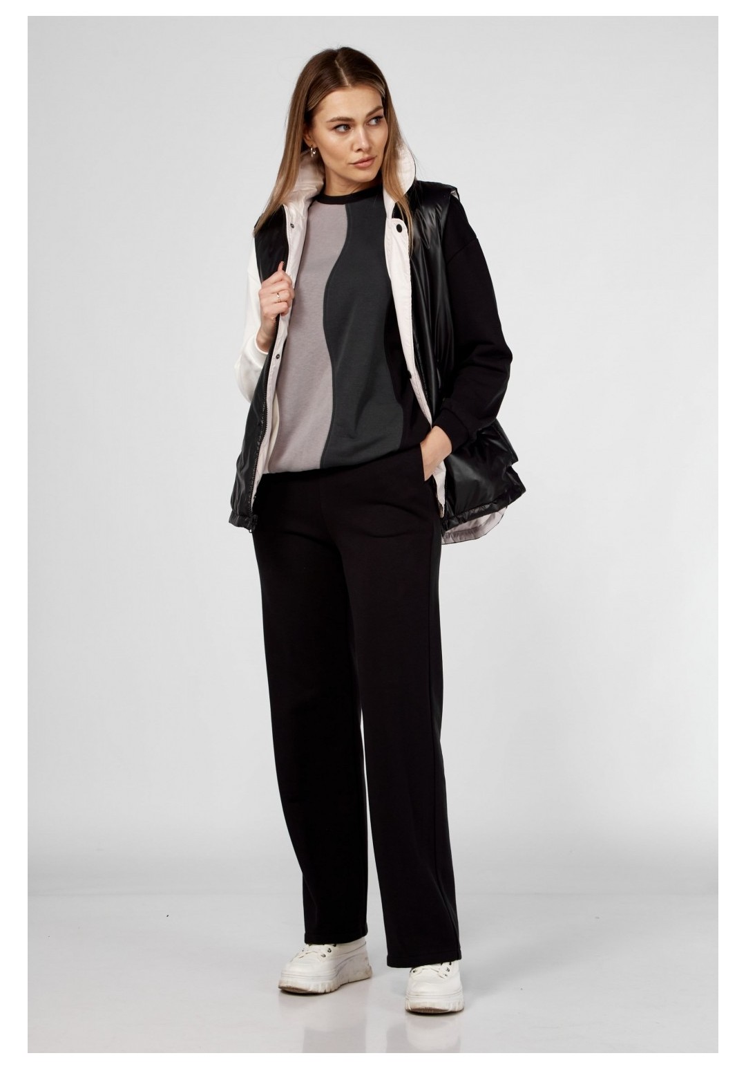 Комплект брючный(жилетка+кофта+брюки)Кофта прямого силуэта со спущенным плечом , рукав втачной одношовный с притачным манжетом, по низу изделия притачной пояс. Горловина обработана бейкой. По переду рельефы. Брюки прямые,верхний срез обработан поясом с резинкой. По бокам прорезные карманы.Жилетка женская (двухсторонняя) с центральной застежкой на молнию. С отрезными бочками. Воротник-стойка. Спинка по низу с кулисой (резинка+фиксатор). Лицевая сторона:обработаны карманы прорезные с листочкой; вторая сторона :накладные карманы, отделочная планка с застежкой на кнопки.