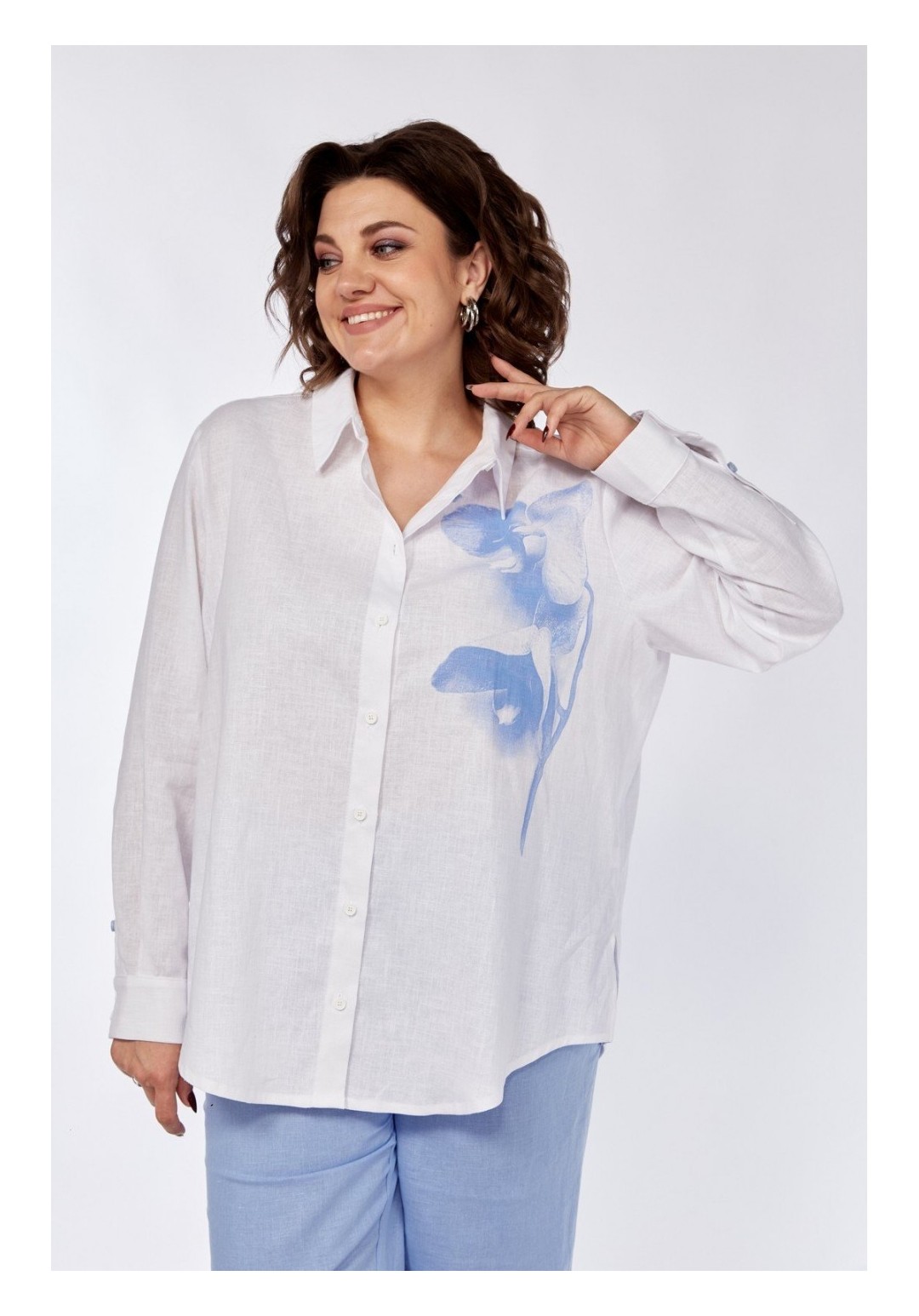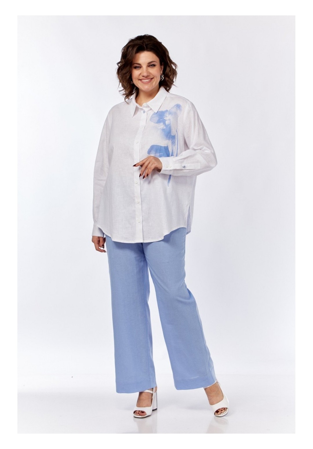 Комплект брючный состоит из рубашки и брюк. Рубашка прямого силуэта с центральной застежкой на петли и пуговицы. По спинке кокетка, по шву притачивания заложена встречная складка. Рукав втачной одношовный с притачным манжетом с застежкой на петли и пуговицы. Воротник стояче-отложной с отрезной стойкой. На левой центральной части переда -печать. Брюки прямые. Верхний срез обработан поясом с резинкой, застежка на молнию, пояс с петлей и пуговицей, в боковых швах обработаны карманы. Длина рубашки по спинке 77 см.,длина рукава 62 см. Длина брюк по боку 107 см