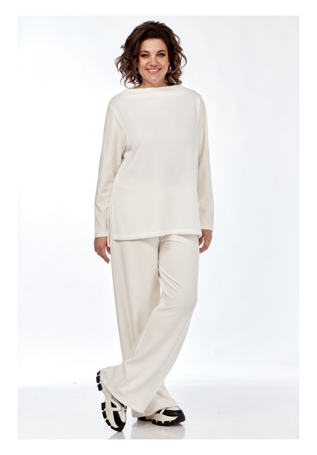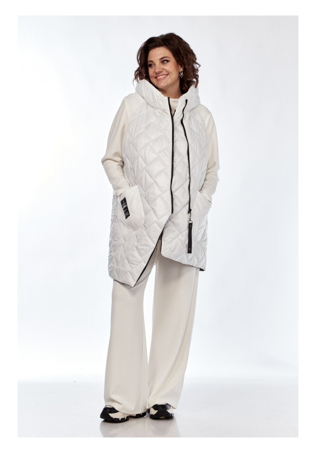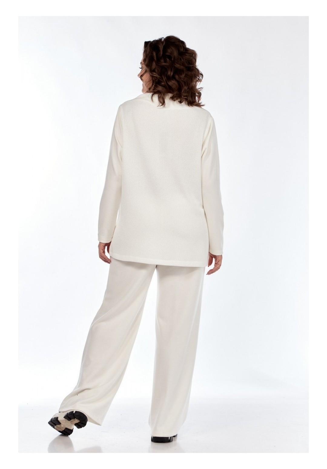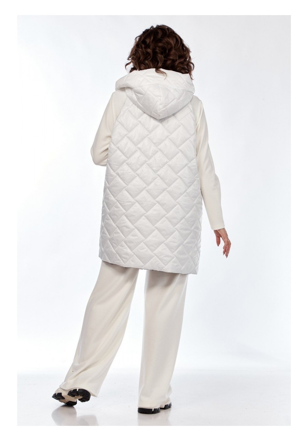 Комплект брючный (тройка). Кофта прямого силуэта, по боковым швам разрезы, пройма квадратная, рукав втачной одношовный, стойка цельнокроенная. Брюки широкие, верхний срез обработан поясом с резинкой. Жилетка расширенная к низу, со смещенной застежкой на тесьму-молнию, ассиметричный низ. Накладные карманы, широкая пройма. Капюшон с отделочной деталью по отлету. В качестве отделки используется фурнитура. Длина жилетки по спинке 86 см., Длина кофты по спинке 76 см, длина рукава 61 см. Длина брюк 109 см