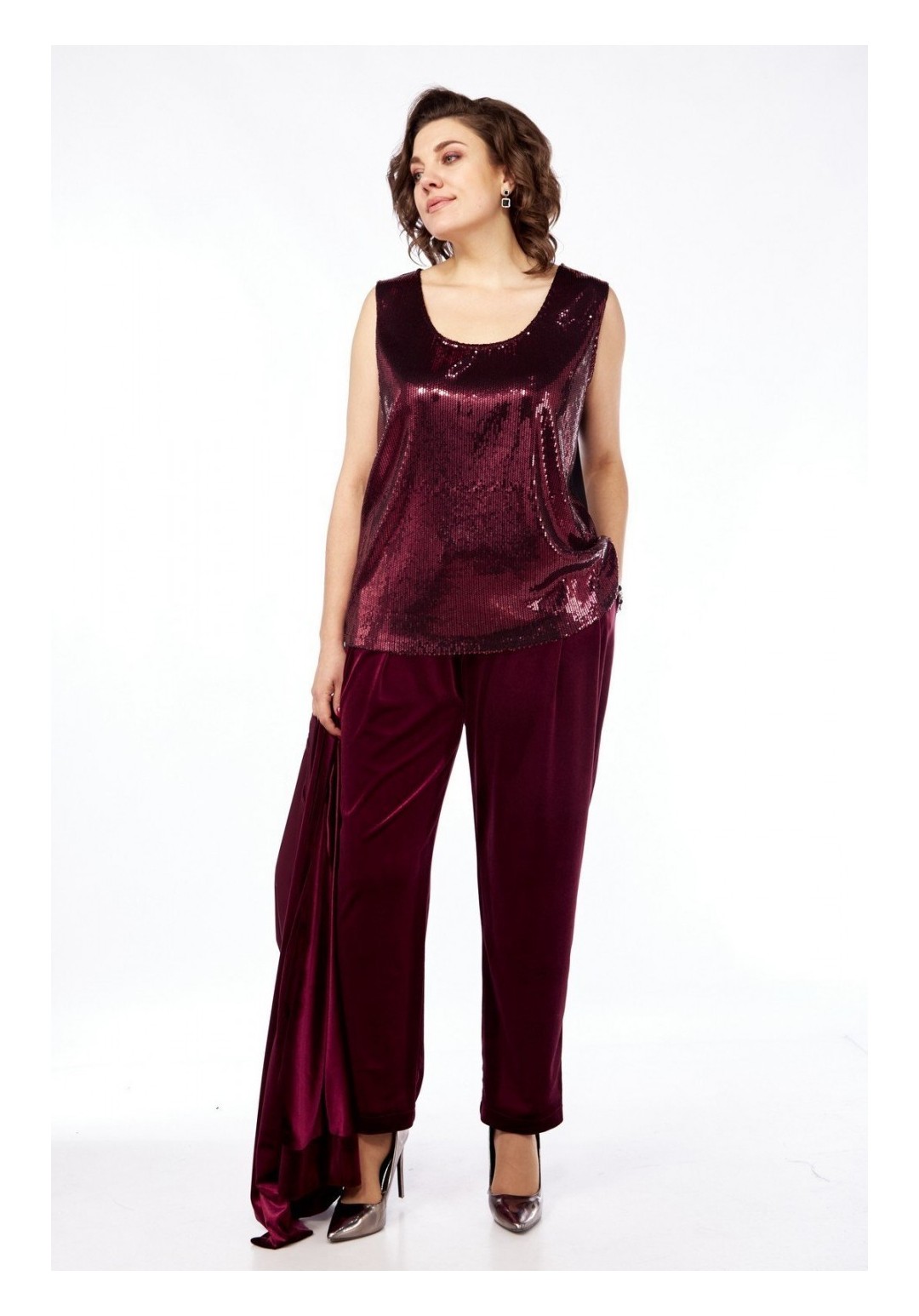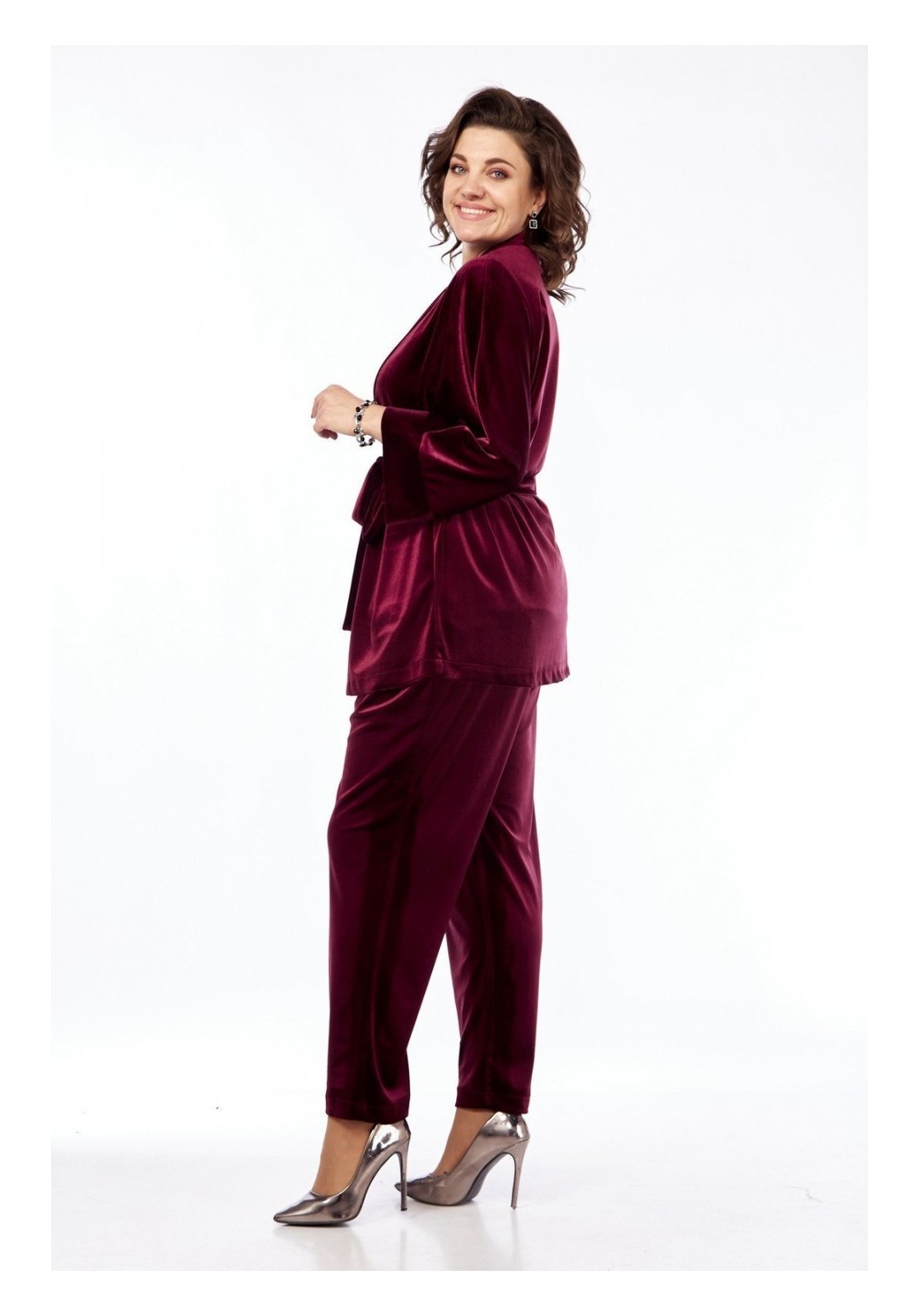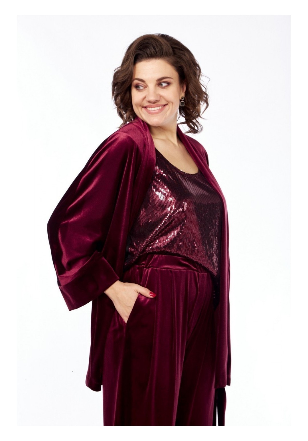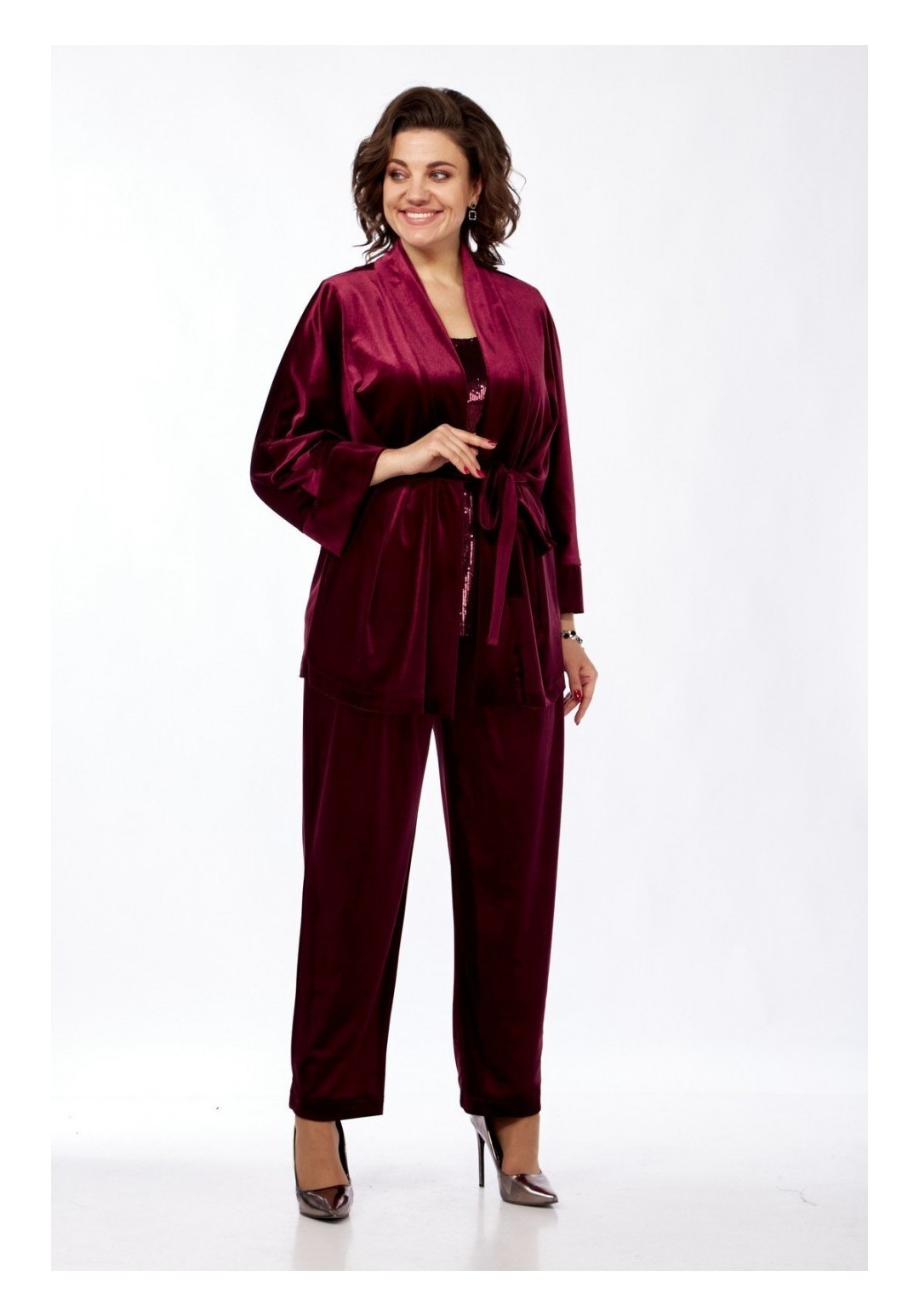 Комплект брючный состоит из жакета, майки и брюк. Жакет-кимоно свободного кроя без застежки. Рукав цельнокройный с притачным манжетом. Пояс съемный. Майка из отделочной ткани. Перед с пайетками, спинка из тонкого трикотина. Горловина округлой формы. Брюки свободного кроя, чуть заужены к низу. Передние половинки брюк с талиевыми вытачками . Задние половинки со складками и отстрочкой по гульфику. Пояс притачной на резинке. Длина жакета по спинке 73 см, длина плечак+длина рукава 64 см, длина майки по спинке 62 см. Длина брюк 105 см.