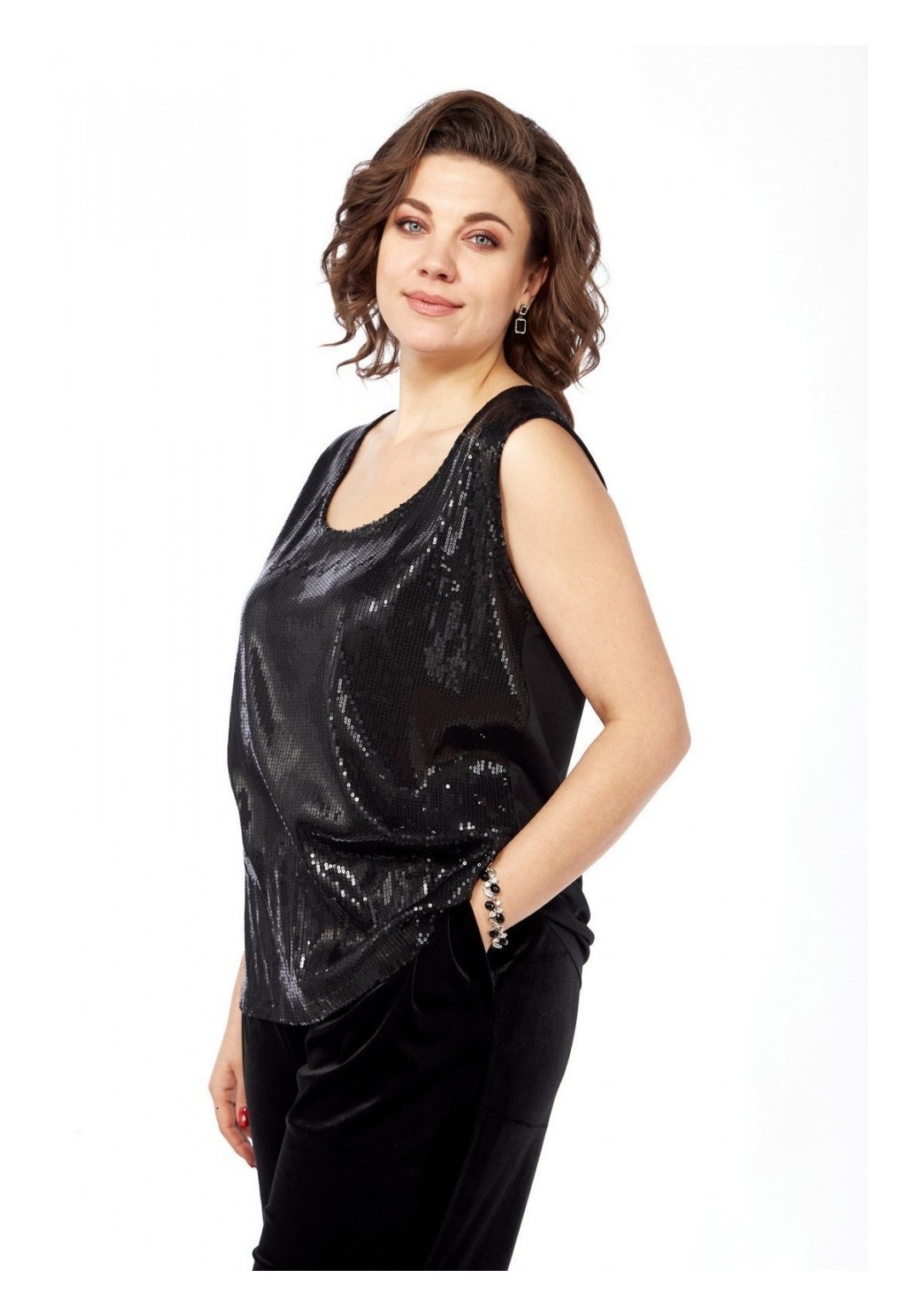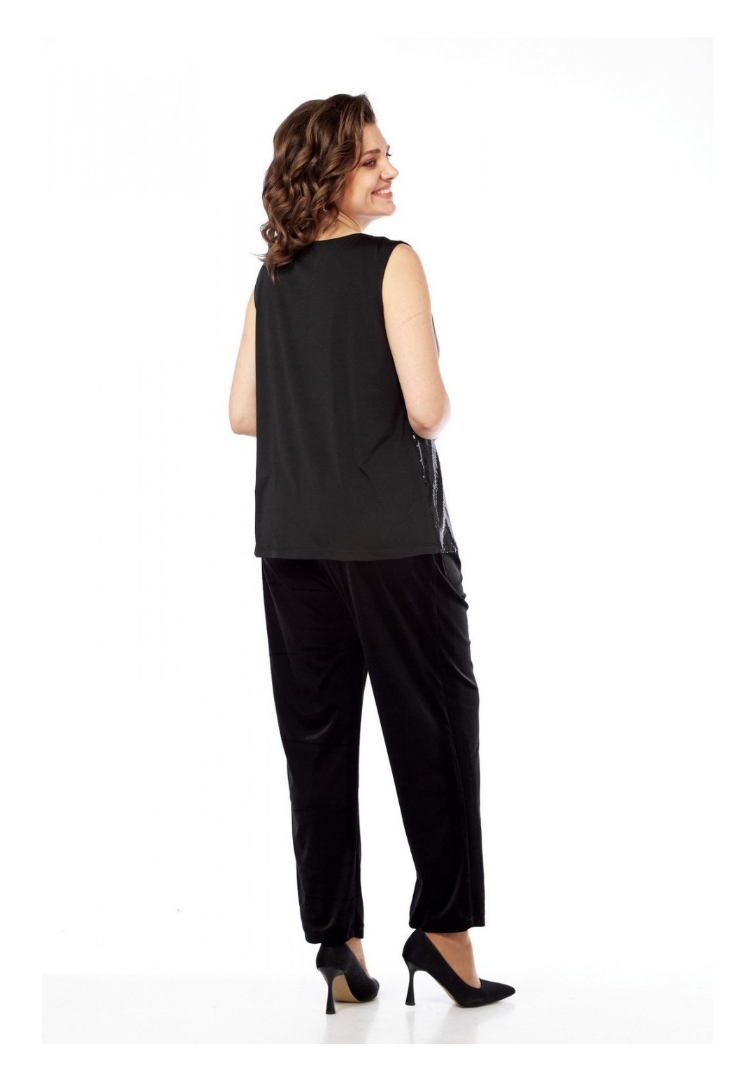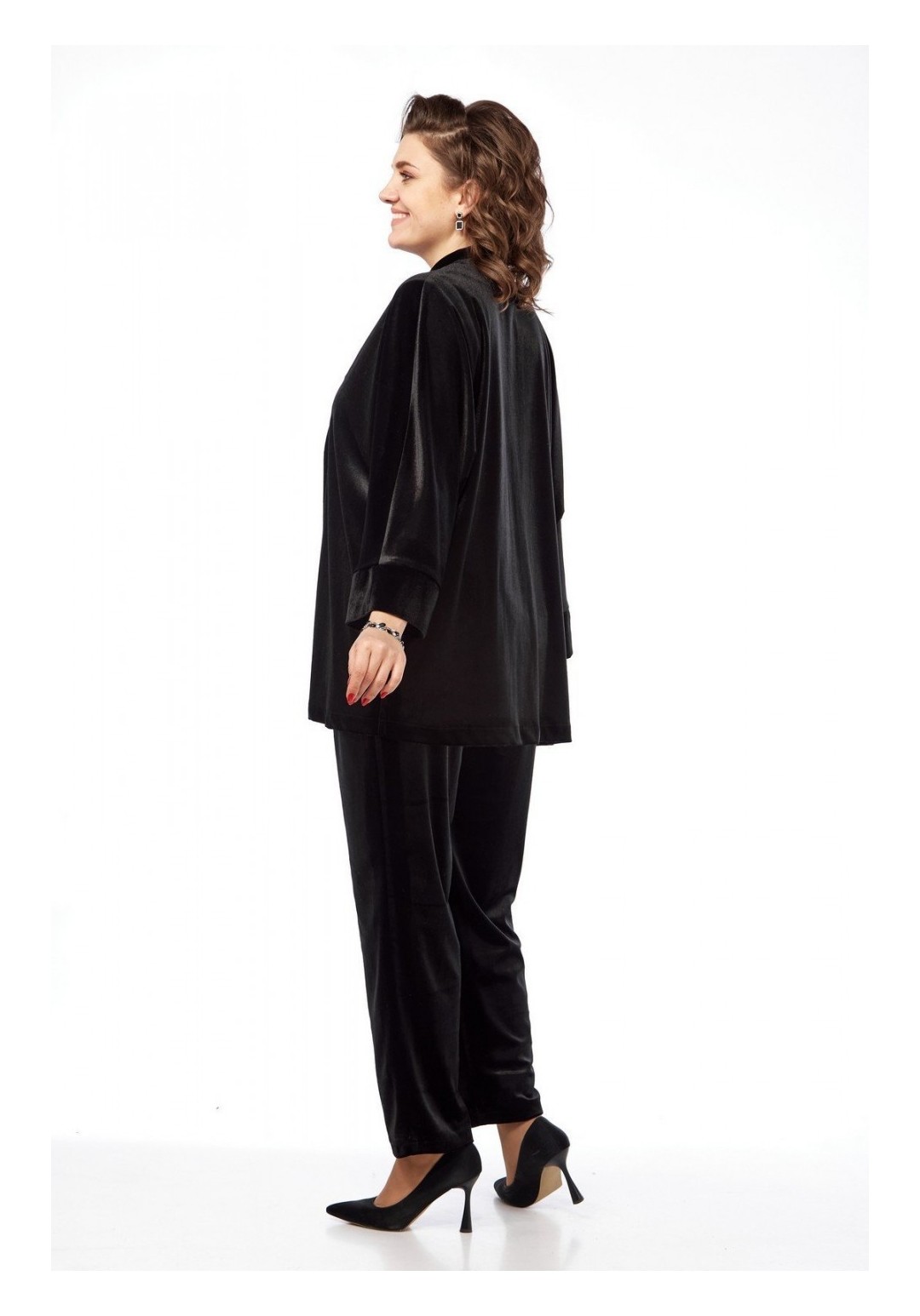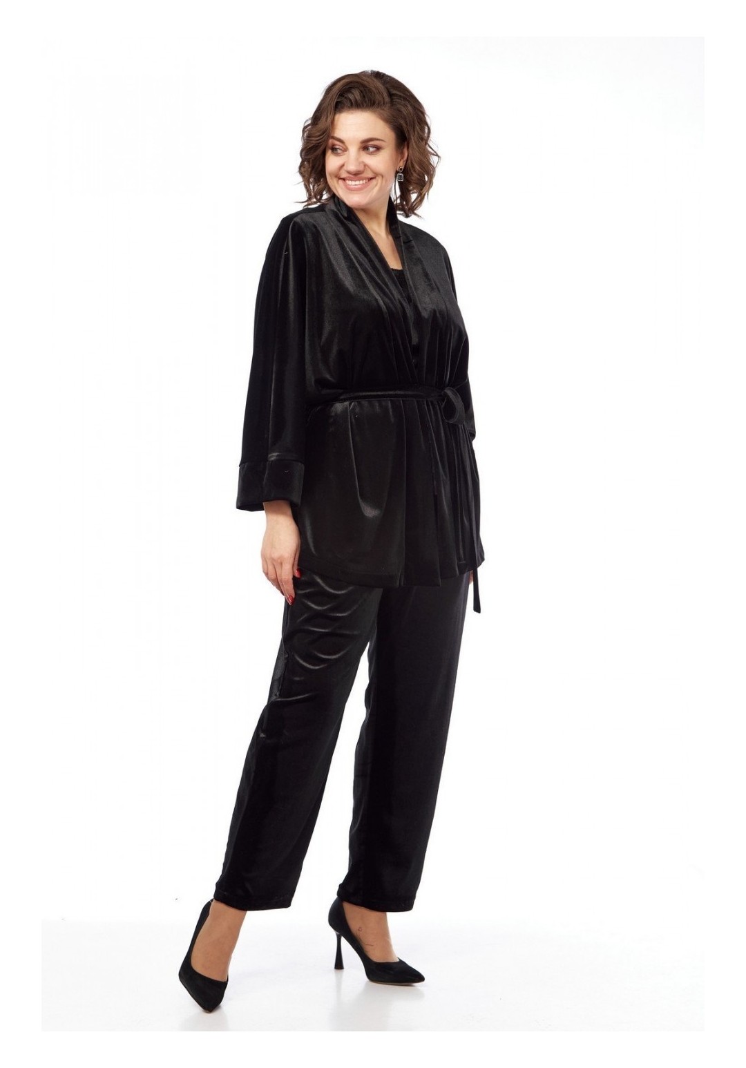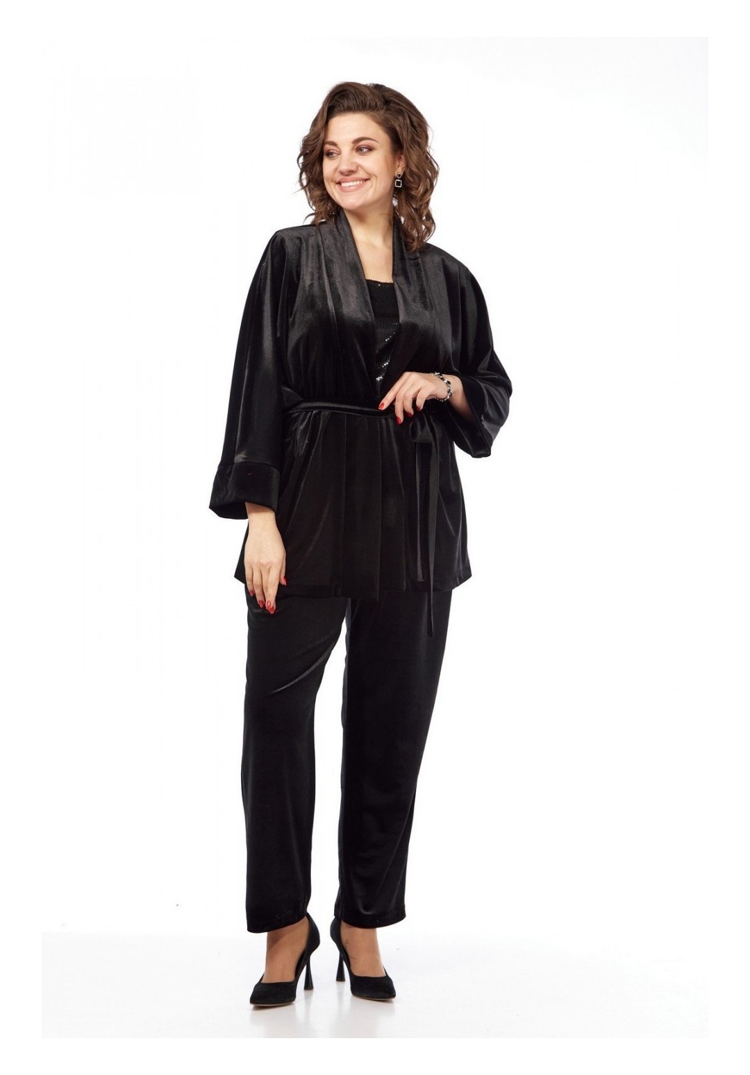 Комплект брючный состоит из жакета, майки и брюк. Жакет-кимоно свободного кроя без застежки. Рукав цельнокройный с притачным манжетом. Пояс съемный. Майка из отделочной ткани. Перед с пайетками, спинка из тонкого трикотина. Горловина округлой формы. Брюки свободного кроя, чуть заужены к низу. Передние половинки брюк с талиевыми вытачками . Задние половинки со складками и отстрочкой по гульфику. Пояс притачной на резинке. Длина жакета по спинке 73 см, длина плечак+длина рукава 64 см, длина майки по спинке 62 см. Длина брюк 105 см.
