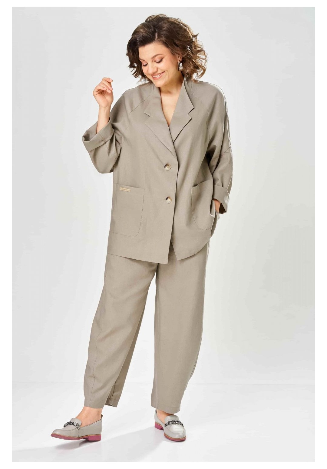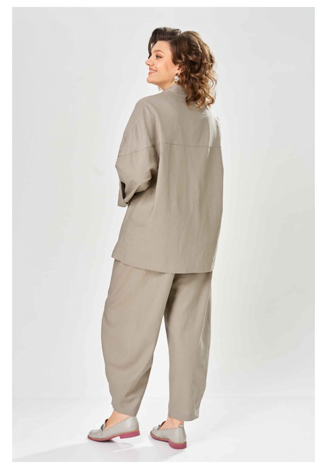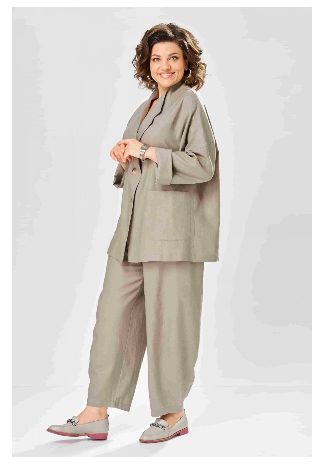 Комплект брючный свободного кроя состоит из жакета и брюк. Жакет прямого силуэта, с застежкой на 2 петли и пуговицы. Спинка с кокеткой, переходящей в рукав-реглан, перед с боковыми накладными карманами. Воротник стойка, переходящая в отворот с лацканами. На правом кармане декор-нашивка. Брюки О-образного силуэта с отрезными бочками. Задние половинки с кокеткой. Задние половинки брюк с застежкой молния и боковыми карманами в швах. Пояс частично на резинке со шлевками. Фурнитура может отличаться от заявленной на фото.