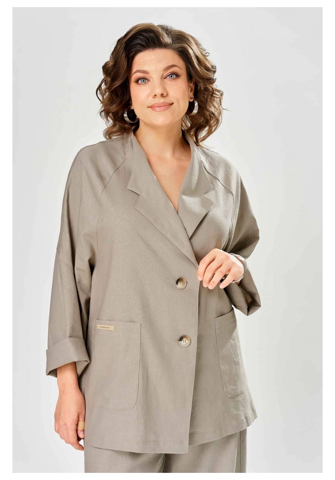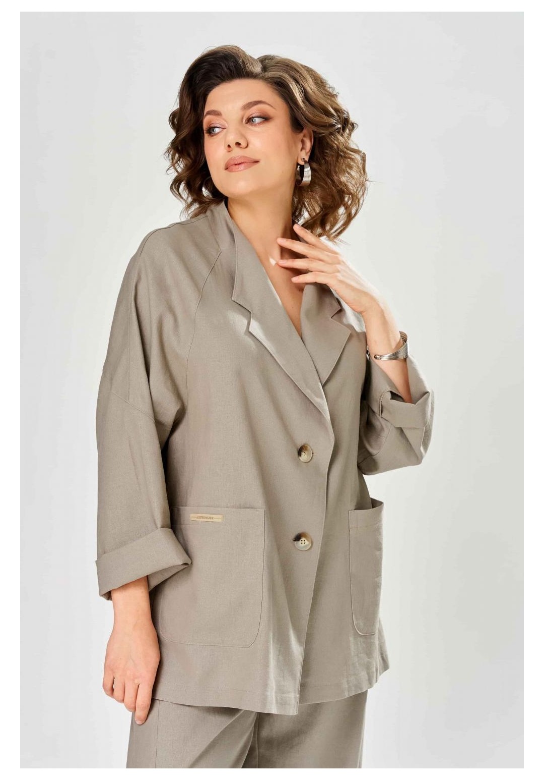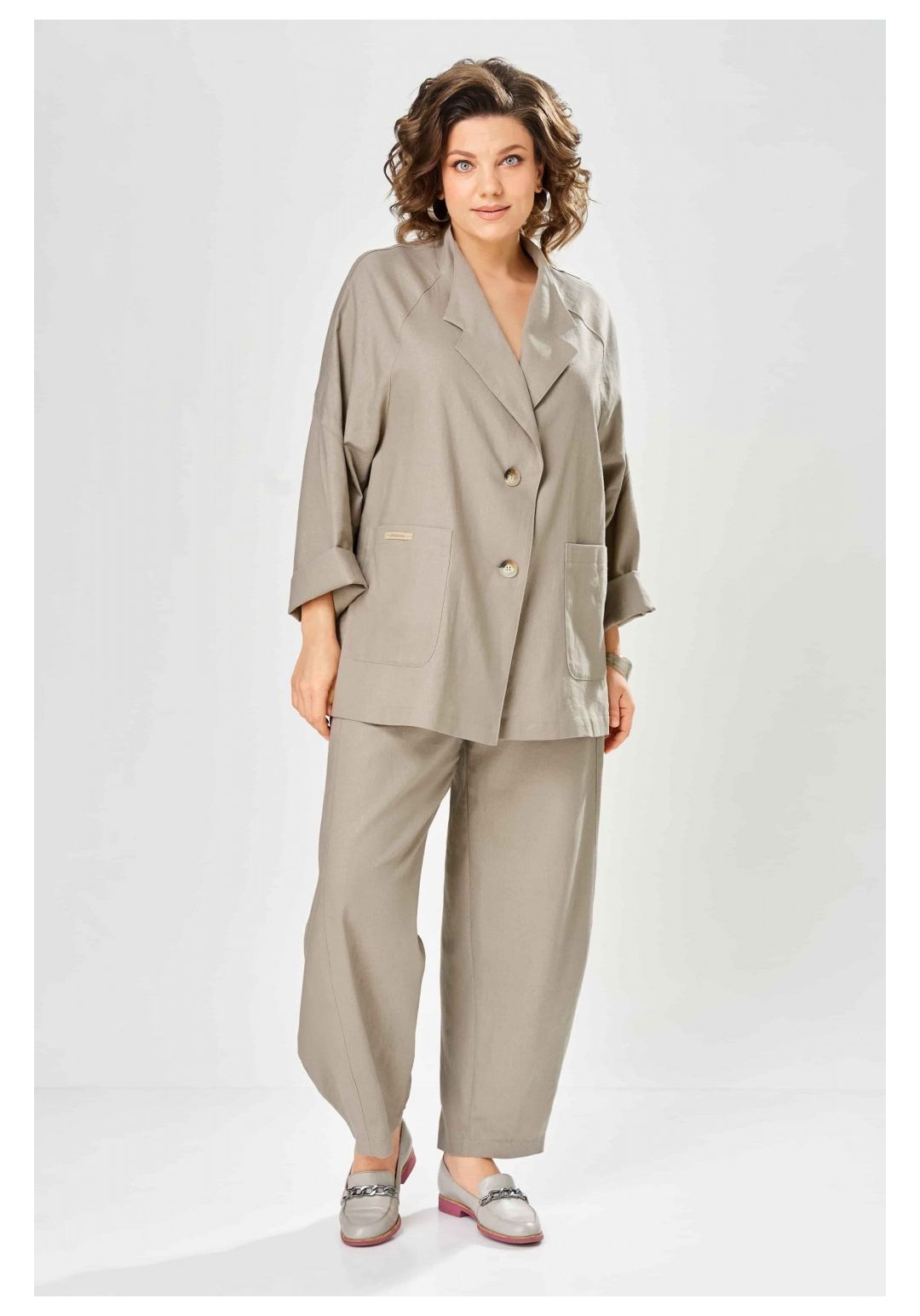 Комплект брючный свободного кроя состоит из жакета и брюк. Жакет прямого силуэта, с застежкой на 2 петли и пуговицы. Спинка с кокеткой, переходящей в рукав-реглан, перед с боковыми накладными карманами. Воротник стойка, переходящая в отворот с лацканами. На правом кармане декор-нашивка. Брюки О-образного силуэта с отрезными бочками. Задние половинки с кокеткой. Задние половинки брюк с застежкой молния и боковыми карманами в швах. Пояс частично на резинке со шлевками. Фурнитура может отличаться от заявленной на фото.