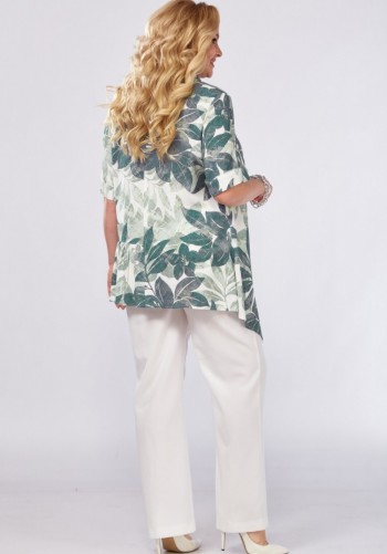 Костюм женский, состоящий из жакета и брюк. Жакет свободного силуэта длиной ниже линии бедер. Спинка со швом. Жакет с центрально-бортовой застежкой на 2 петли и пуговицы. Перед с нагрудными вытачками из бокового шва и наклонными рельефами, заканчивающимися на уровне кармана в рамку. Ниже параллельно карману настрочен клапан. Воротник пиджачного типа с отложными лацканами. Рукава втачные двухшовные; по низу рукава обработана закрытая шлица с 4-мя пуговицами. Перед жакета на подкладке. Брюки - палаццо с застежкой на тесьму-молнию с гульфиком и откоском в среднем шве. Брюки на притачном поясе со шлевками и застежкой на одну прорезную петлю и пуговицу. Задняя часть пояса - на резинке. ЗП брюк с талиевыми вытачками. ПП брюк с двумя фиксированными складками и боковыми карманами. Длина жакета - 72,5 см - 73,7 см Длина рукава жакета - 62 см Длина брюк - 115,4 см