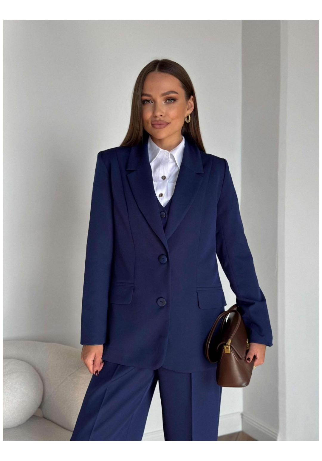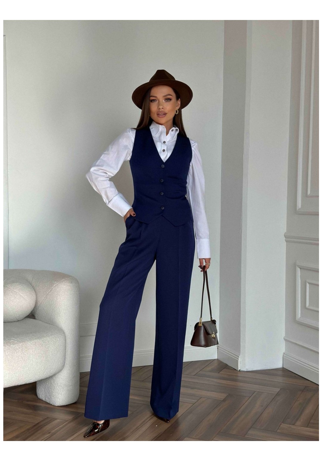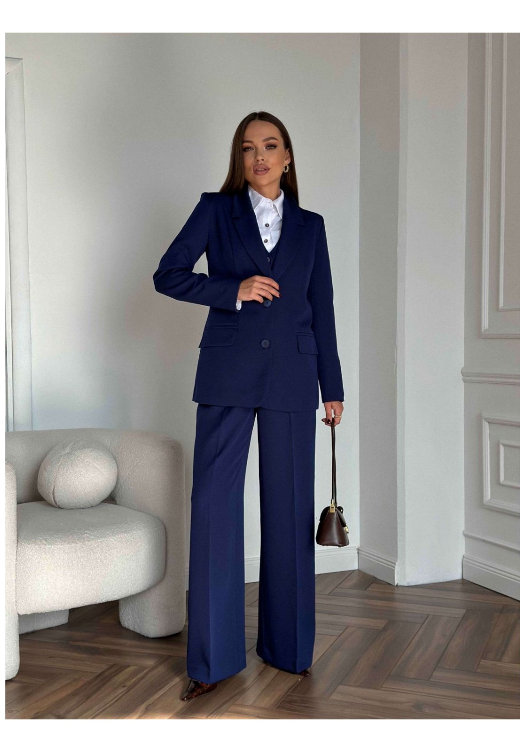 Костюм женский, состоящий из жакета, жилета и брюк. Жакет полуприлегающего силуэта, длиной ниже линии бедер. Спинка с вертикальными рельефами. Перед с центрально-бортовой застежкой на 2 петли-пуговицы и воротником пиджачного типа, вертикальными рельефами, доходящими до линии кармана в рамку с клапаном. Рукава втачные двухшовные. Жакет на подкладке. Брюки - палаццо с центрально застежкой на тесьму молнию с гульфиком и откоском; с притачным поясом со шлевками, застегивающимся на 1 прорезную петлю и пуговицу. Задняя часть пояса - на резинке. ПП брюк со складками, переходящими в стрелки и боковыми карманами. ЗП брюк с 2 парами таллиевых вытачек и стрелками. Жилет прилегающего силуэта с центральной бортовой застежкой на 4 прорезные петли и пуговицы. Перед - с талиевыми вытачками и отрезным бочком. Спинка со средним швом и рельефами от проймы до низа, в которые на уровне талии втачаны хлястики. Хлястики с запахом; закреплены на 2 пуговицы. Вырез горловины V-образный. Жилет на подкладке. Длина жакета 71,2 см. Длина рукава жакета 62,7 см. Длина жилета 49,5 см. Ширина плеча жилета 7,2-7,6 см. Длина брюк 120,5 см.