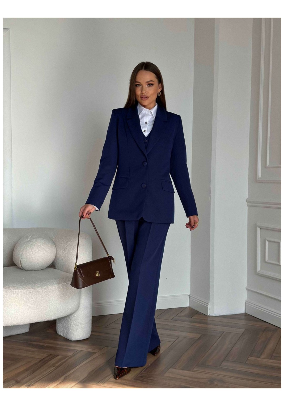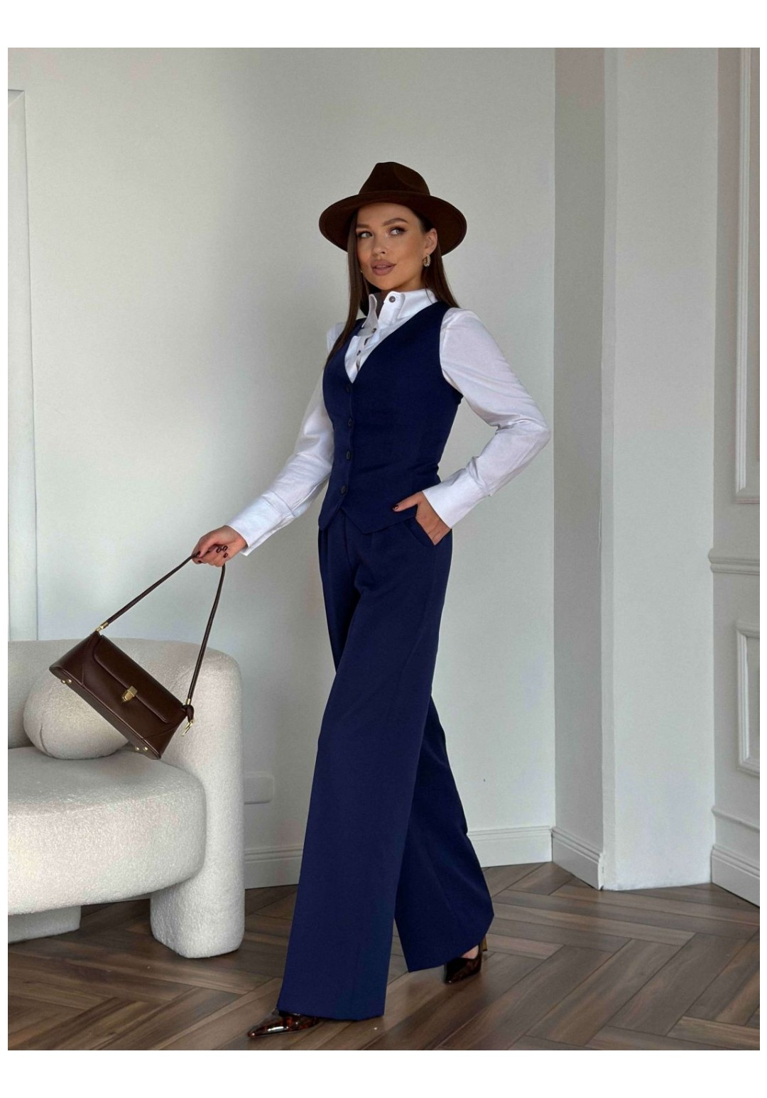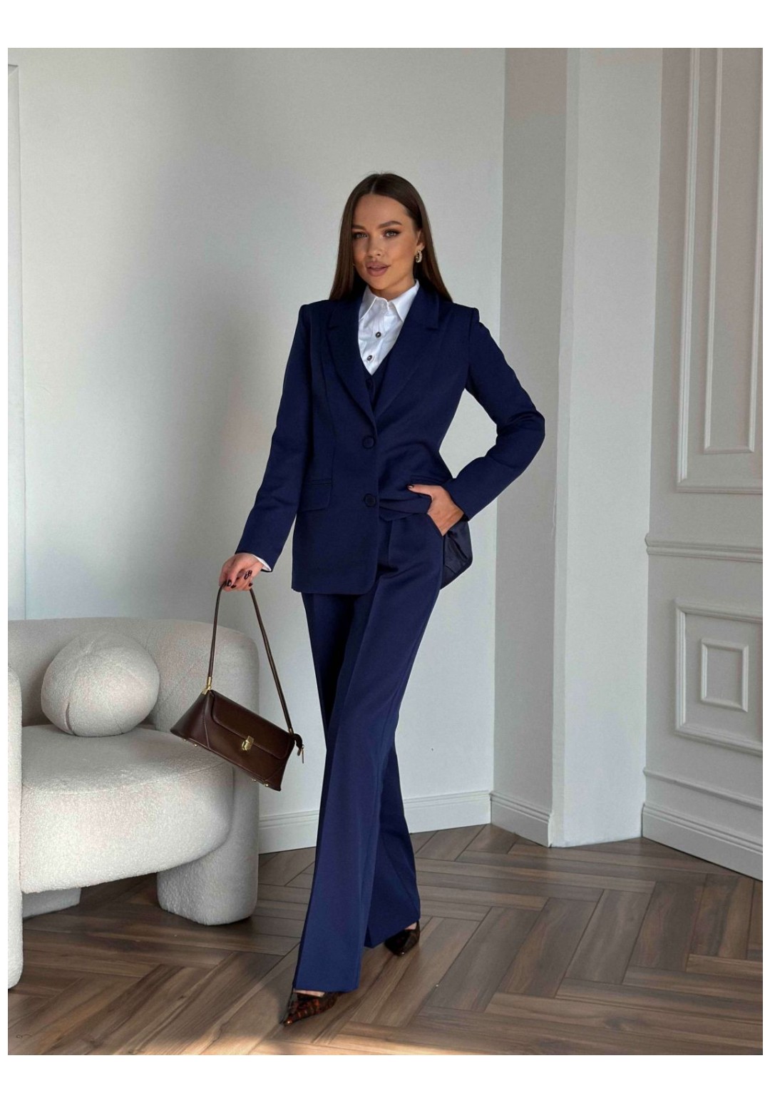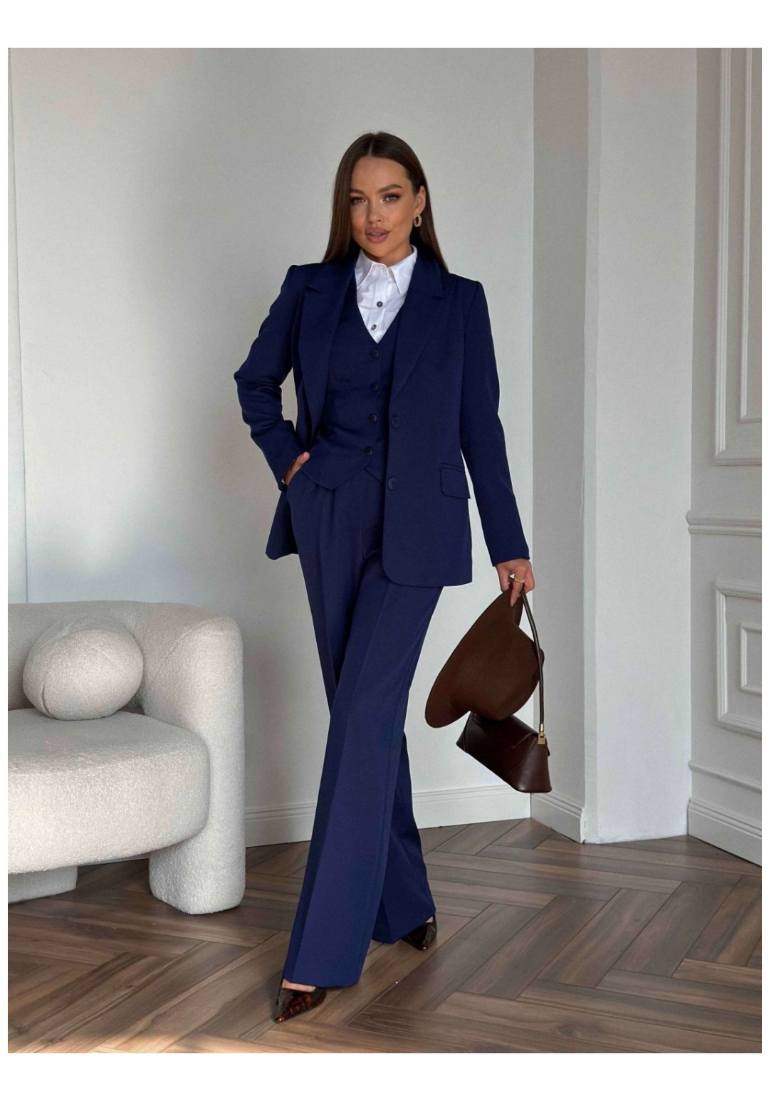 Костюм женский, состоящий из жакета, жилета и брюк. Жакет полуприлегающего силуэта, длиной ниже линии бедер. Спинка с вертикальными рельефами. Перед с центрально-бортовой застежкой на 2 петли-пуговицы и воротником пиджачного типа, вертикальными рельефами, доходящими до линии кармана в рамку с клапаном. Рукава втачные двухшовные. Жакет на подкладке. Брюки - палаццо с центрально застежкой на тесьму молнию с гульфиком и откоском; с притачным поясом со шлевками, застегивающимся на 1 прорезную петлю и пуговицу. Задняя часть пояса - на резинке. ПП брюк со складками, переходящими в стрелки и боковыми карманами. ЗП брюк с 2 парами таллиевых вытачек и стрелками. Жилет прилегающего силуэта с центральной бортовой застежкой на 4 прорезные петли и пуговицы. Перед - с талиевыми вытачками и отрезным бочком. Спинка со средним швом и рельефами от проймы до низа, в которые на уровне талии втачаны хлястики. Хлястики с запахом; закреплены на 2 пуговицы. Вырез горловины V-образный. Жилет на подкладке. Длина жакета 71,2 см. Длина рукава жакета 62,7 см. Длина жилета 49,5 см. Ширина плеча жилета 7,2-7,6 см. Длина брюк 120,5 см.