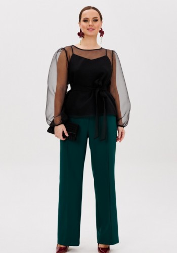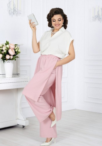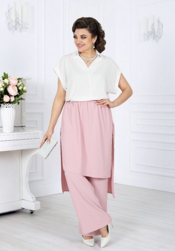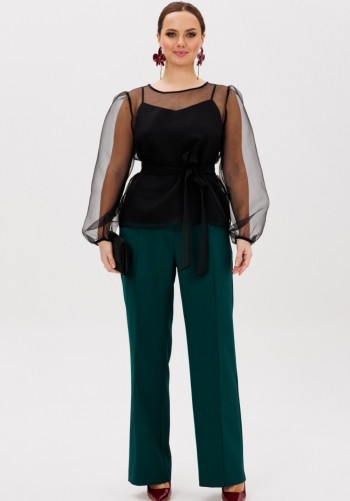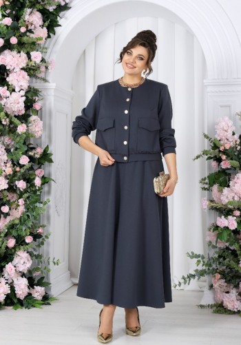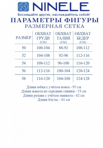 Костюм женский 2-предметный, состоящий из жакета и брюк. Жакет умеренного объема, приталенного силуэта, однобортный, с центральной застежкой на 2 петли и 2 пуговицы, отложным воротником и лацканами пиджачного типа, на подкладке. Детали переда с талиевыми вытачками, в которые вставлены петли с полукольцами, отрезными бочками и прорезными карманами с двумя обтачками. Спинка со средним швом и отрезными бочками, в которые вставлены пояски. Рукав втачной, двухшовный, длинный. Приталенность регулируется поясками. Брюки умеренного объема, прямого силуэта. На передних и задних половинках заутюжены стрелки. На передних половинках выполнены боковые карманы с отрезным бочком. Задние половинки с талиевыми вытачками. Застежка - гульфик на молнии. Пояс притачной, с резинкой по спинке, застежкой на крючок и потайную пуговицу.