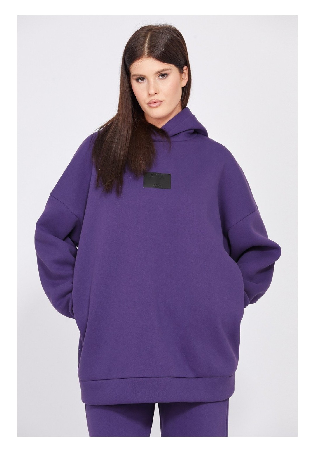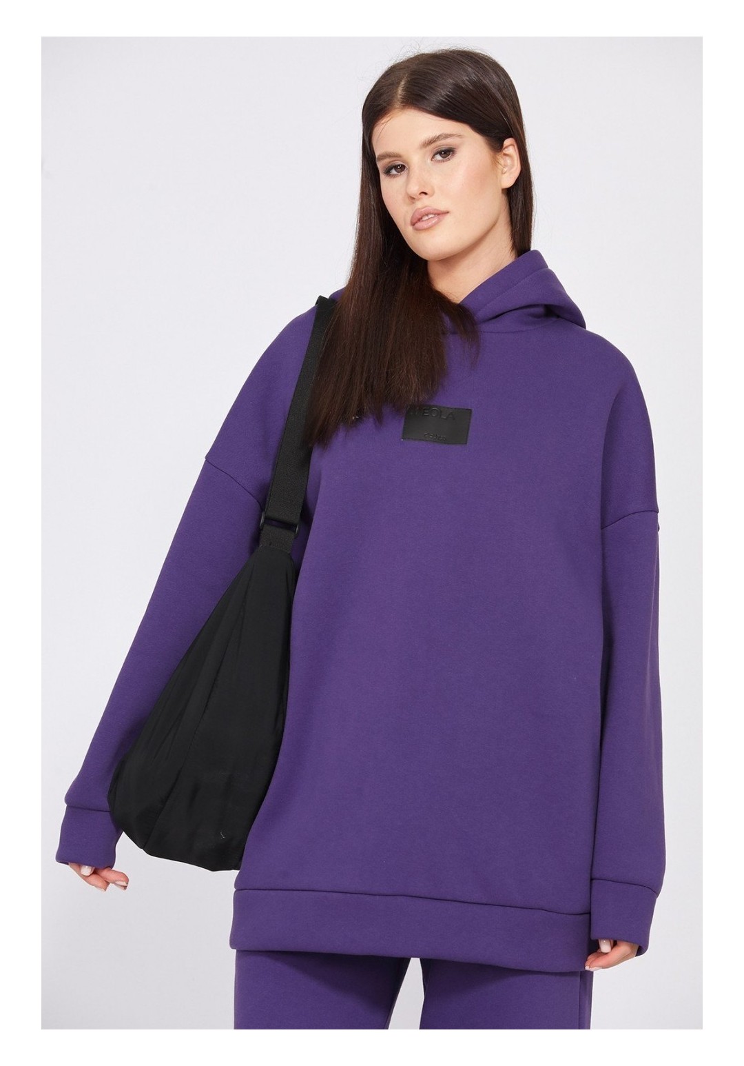 Комплект: джемпер + брюки. Комплект выполнен из однотонного трикотажного полотна на флисе. Джемпер прямого силуэта, покроя оверсайз, длиной ниже линии бедер. Перед и спинка цельные, перед декорирован настрочной нашивкой из натуральной кожи. Плечевой шов спущен. Горловина округлой формы, обработана капюшоном. Рукав одношовный, на притачной манжете. В боковых швах карманы. Низ джемпера на манжете. Брюки на притачном поясе с эластичной тесьмой, заужены к низу, в боковых швах карманы. Низ брюк на манжете с эластичной тесьмой. Длина джемпера: р.44-48 - 76 см, р.50-54 - 77 см. Длина рукава от точки горловины: р.44-48 - 78 см, р.50-54 - 79 см. Длина брюк с поясом: р.44-48 - 108 см, р.50-54 - 109 см. Гарантийный срок не установлен. ГОСТ 31409-2009