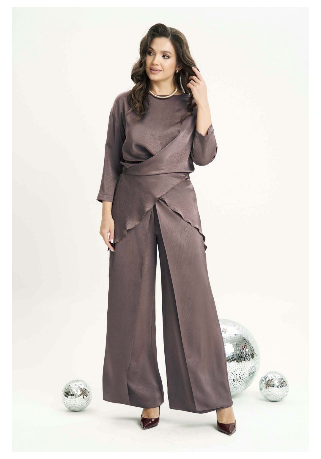 Широкие, длинные, струящиеся брюки-палаццо - одна из самых актуальных моделей брюк. Они обладают свойством добавлять нотку расслабленного шика любому образу, и, несомненно, они особенно эффектно выглядят в нарядных комплектах. Брюки свободные, на притачном эластичном поясе в области спинки и цельнокроеном спереди. Застёжка по боковому шву на потайную молнию, петлю и пуговицу. Передние половинки брюк с отлетной деталью, оригинально драпирующейся в области талии. Длина брюк около 108 см. Невероятная блуза из одноимённой ткани завершает образ, превращая его в платье или даже комбинезон. Свободный силуэт, рубашечный покрой, рукав длиной 3/4, эффектная драпировка по переду и кокетливый пояс-завязка по спинке. Длина блузы около 80 см. Длина рукава с плечом около 60 см.