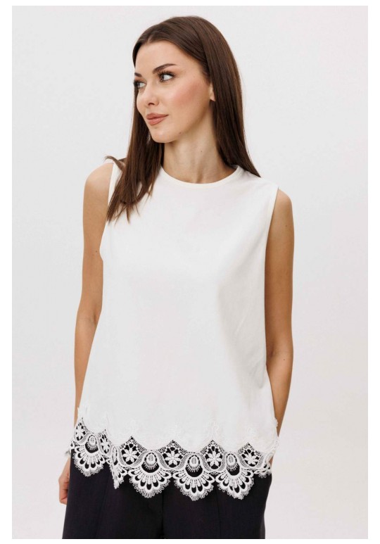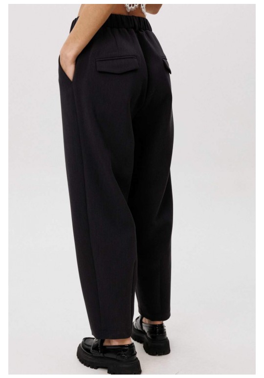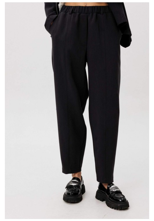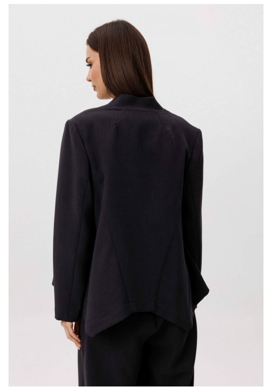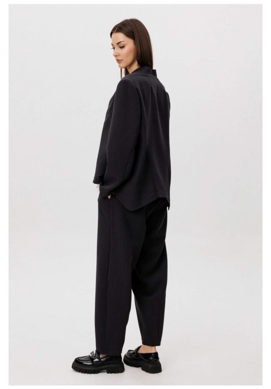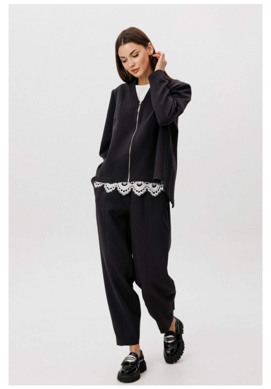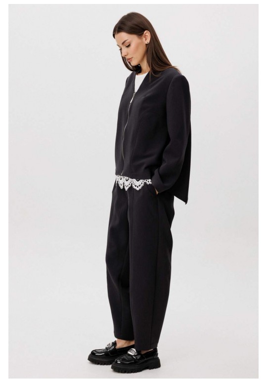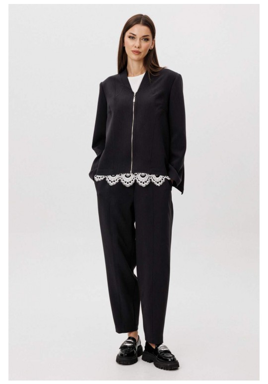 Современный костюм-тройка, в котором минимализм сочетается с продуманными дизайнерскими деталями. Жакет прямого силуэта выполнен со сложной архитектурной спинкой, создающей выразительный объём и подчёркивающей концептуальный характер модели. Застёжка на молнию добавляет образу графичность и современное звучание. Расслабленные брюки-бананы с мягкой линией кроя обеспечивают комфорт и формируют актуальный силуэт с лёгким акцентом на талии. Хлопчатобумажный топ, декорированный изящным кружевом по нижнему краю, добавляет образу контрастную женственность и завершённость. Костюм легко адаптируется под разные стилистические сценарии — от повседневного city-look до интеллектуального casual с акцентом на форму и фактуру.