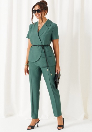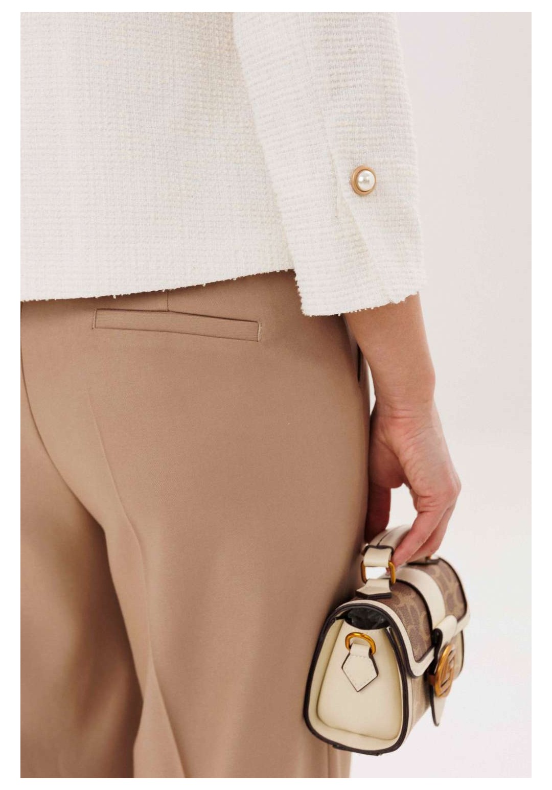 Стильный брючный комплект — идеальное решение для создания элегантного и женственного образа. Модель сочетает в себе классические линии и современные дизайнерские детали, благодаря чему выглядит изысканно и актуально. Жакет молочного оттенка выполнен в утончённом стиле и украшен декоративными бантами-завязками, которые придают образу лёгкость и романтичность. Аккуратный крой подчёркивает силуэт, а минималистичные карманы добавляют практичности. Брюки прямого кроя в благородном бежевом оттенке визуально вытягивают силуэт и создают гармоничное сочетание с жакетом. Комфортная посадка обеспечивает удобство в течение всего дня и делает модель универсальной для разных типов фигуры. Преимущества модели: элегантный и женственный дизайн актуальное сочетание молочного и бежевого оттенков комфортная посадка и продуманный крой универсальность для деловых и повседневных образов Комплект легко дополнить классическими лодочками, сумкой и лаконичными аксессуарами. Он прекрасно подойдёт для деловых встреч, мероприятий или стильных городских образов. Идеальный выбор для тех, кто ценит элегантность, комфорт и современный стиль.
