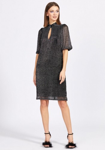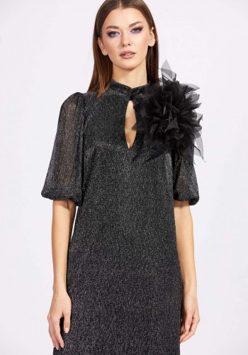 Костюм женский, состоит из жакета и брюк. Элегантный жакет, слегка приталенного силуэта с острыми лацканами, застежкой на пуговицу и закругленными бортами. Прорезные карманы в рамку и имитированный карман с листочкой в верней части. Жакет на подкладке из 100% ПЭ, по спинке средний шов и талиевые вытачки. Рукава втачные двухшовные, внизу с обработанными шлицами на три пуговицы. Брюки-палаццо, со стрелками, на поясе с застежкой на пуговицу и тесьму-молнию. По бокам обработаны карманы. Длина жакета 75 см. Длина рукава 63 см. Длина брюк 106 см.