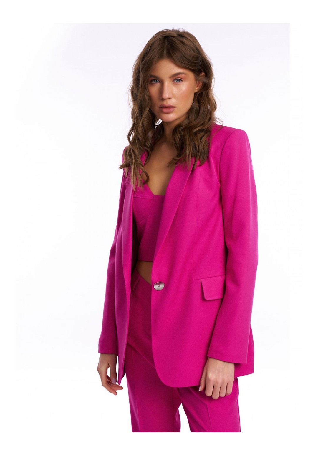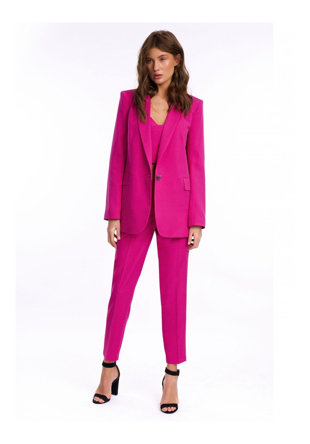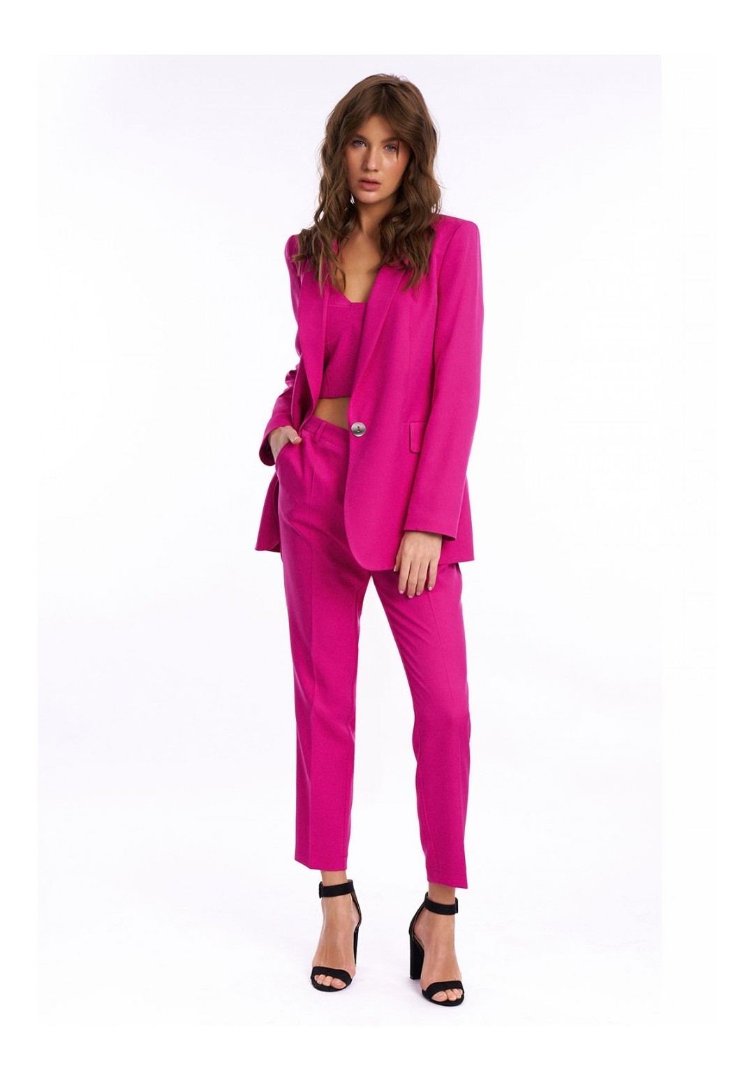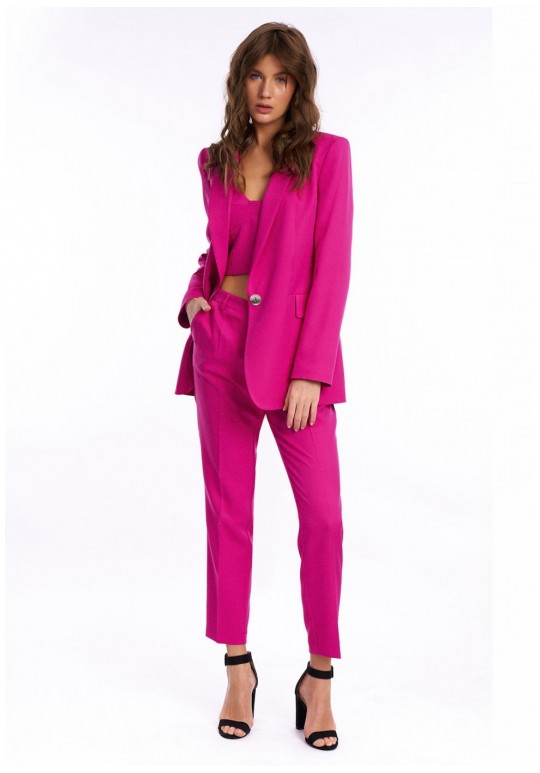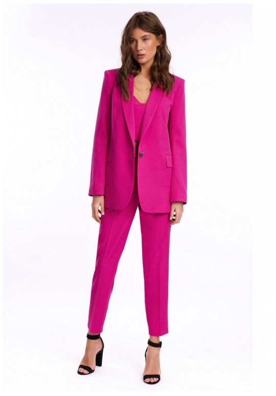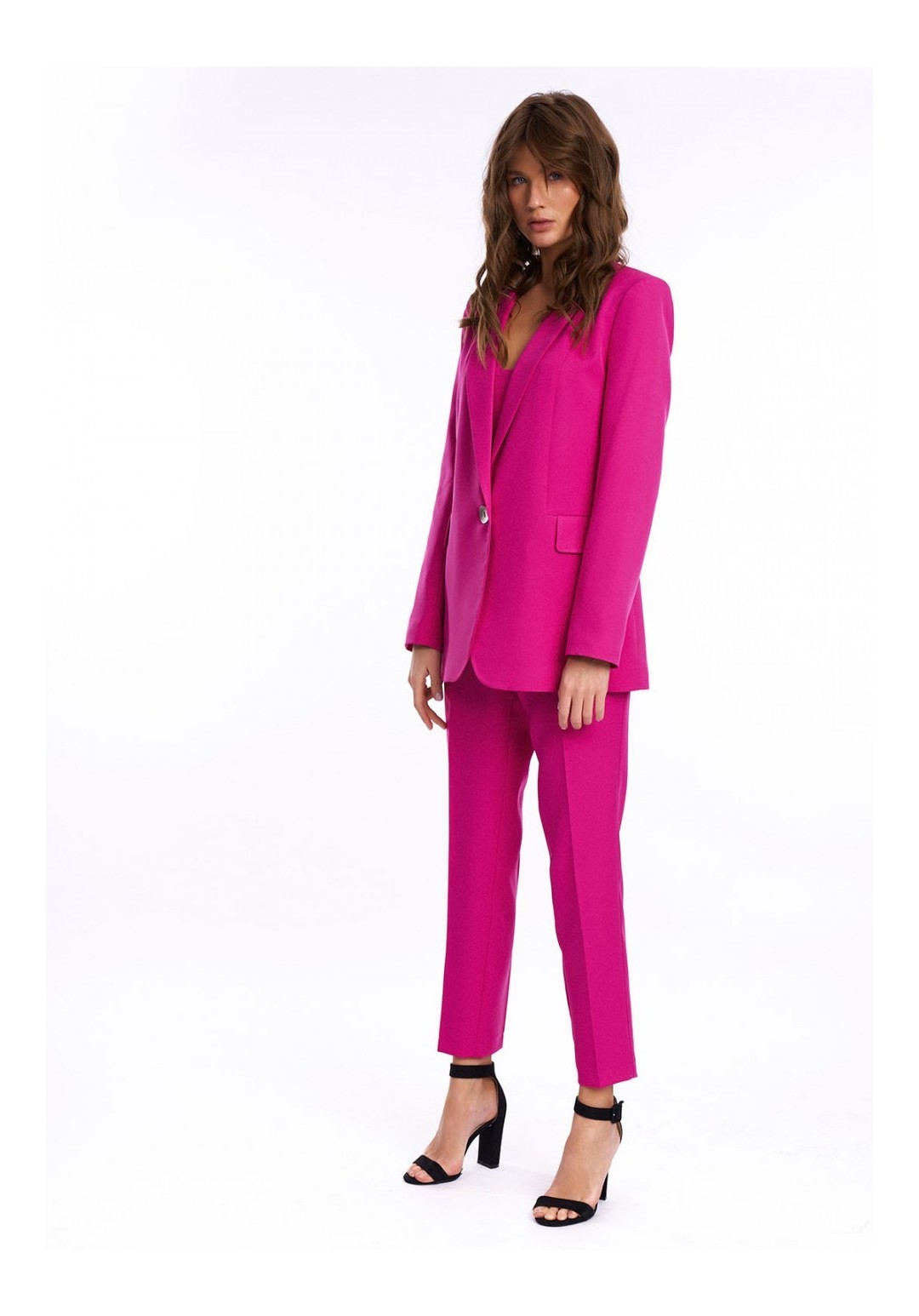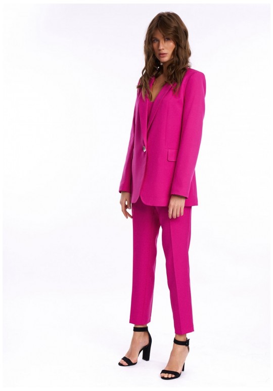 Шикарный 2-х предметный комплект состоящий из жакета и брюк. Универсальный женский жакет на подкладке прямого силуэта. Перед с центральной застежкой на одну пуговицу, с карманами и с клапанами в шве. Воротник стояче-отложной втачной с отворотом лацкана. Рукав двухшовный, втачной. Брюки базовые со стрелками. Изделие имеет комфортную средней посадку. Брюки на притачном поясе со шлёвками. Спереди боковые функциональные карманы, сзади имитация прорезных карманов с листочкой. Длина жакета - 73 см. Длина рукава – 63 см. Длина брюк по боковому шву с поясом - 98 см.