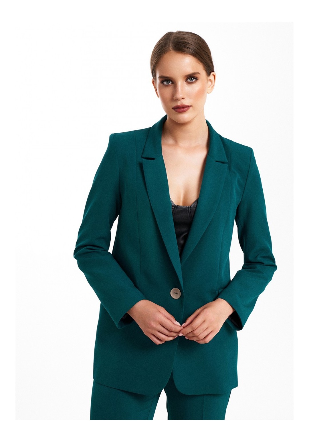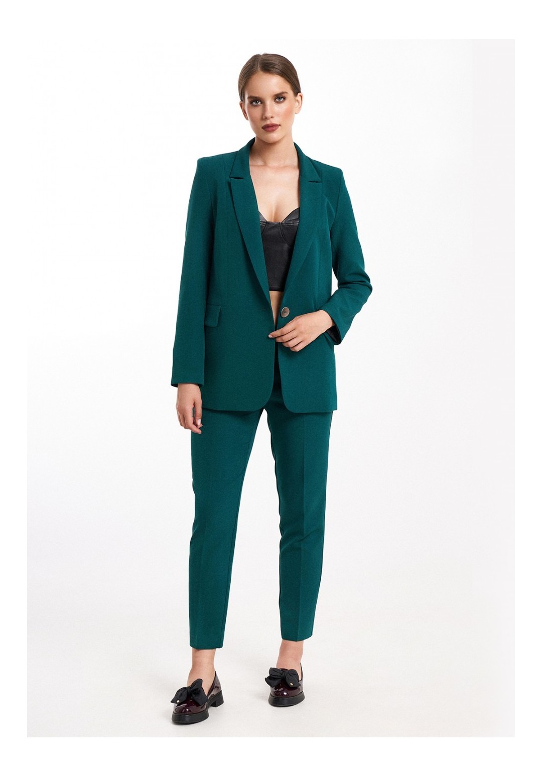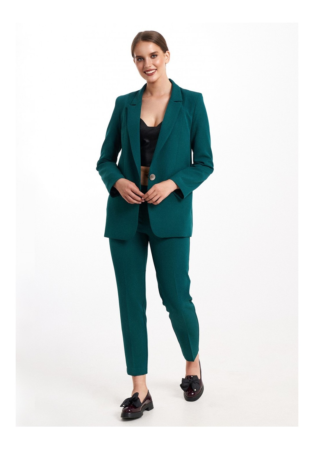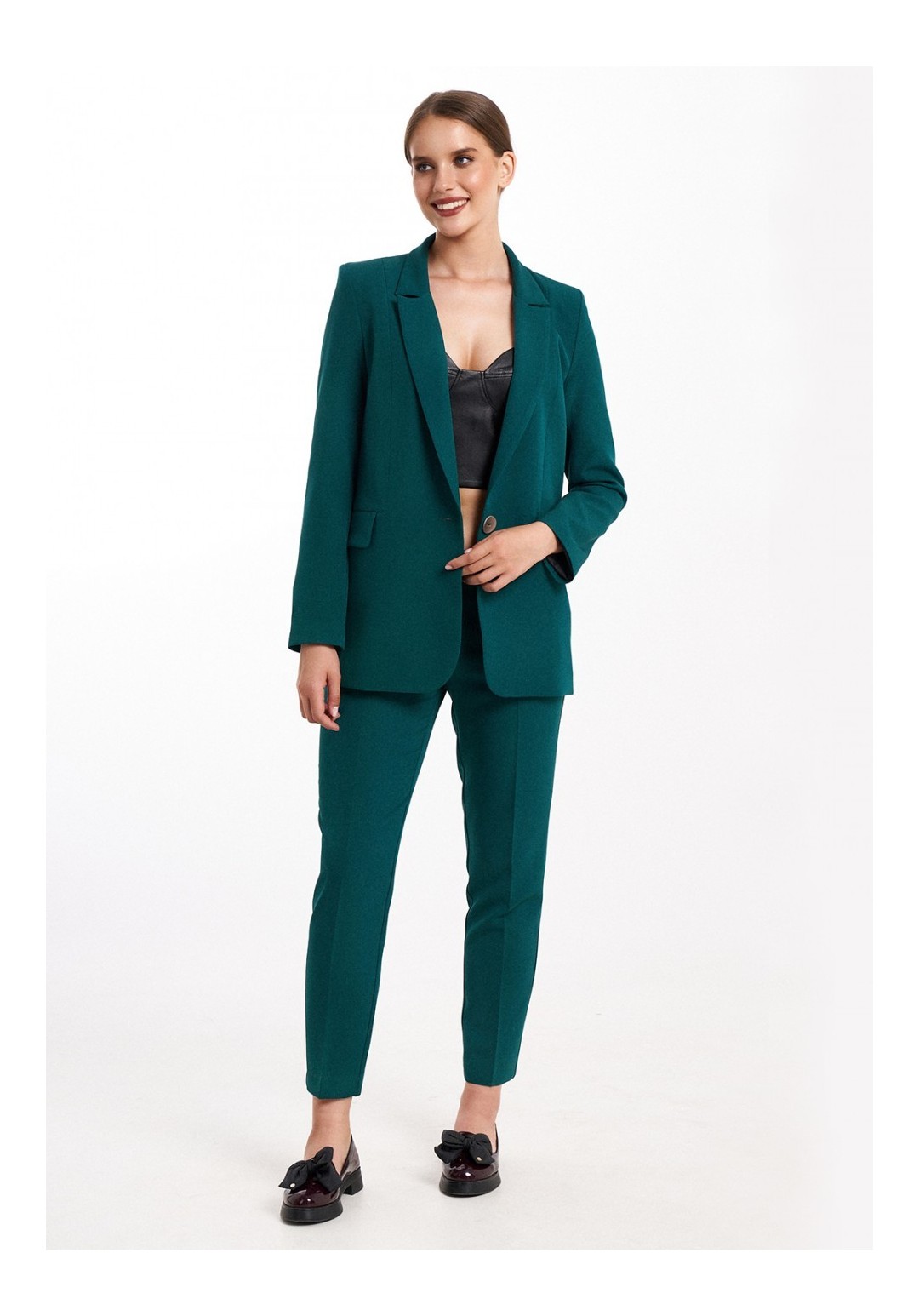 Шикарный 2-х предметный костюм, состоящий из жакета и брюк. Универсальный женский жакет на подкладке прямого силуэта. Перед с центральной застежкой на одну пуговицу, с карманами и с клапанами в шве. Воротник стояче-отложной втачной с отворотом лацкана. Рукав двухшовный, втачной. Брюки базовые со стрелками. Изделие имеет комфортную средней посадку. Брюки на притачном поясе со шлёвками. Спереди боковые функциональные карманы, сзади имитация прорезных карманов с листочкой. Длина жакета - 73 см, длина рукава – 63 см, длина брюк по боковому шву с поясом - 98 см.